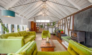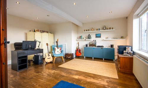 Inside, the property features generous reception rooms, a vast open-plan kitchen/dining space, bar and garden room, ideal for entertaining. Outbuildings include a two-storey studio, home office pod and barn, offering scope for multi-generational living, creative use or future development (STPP).