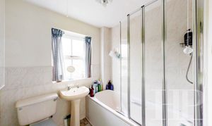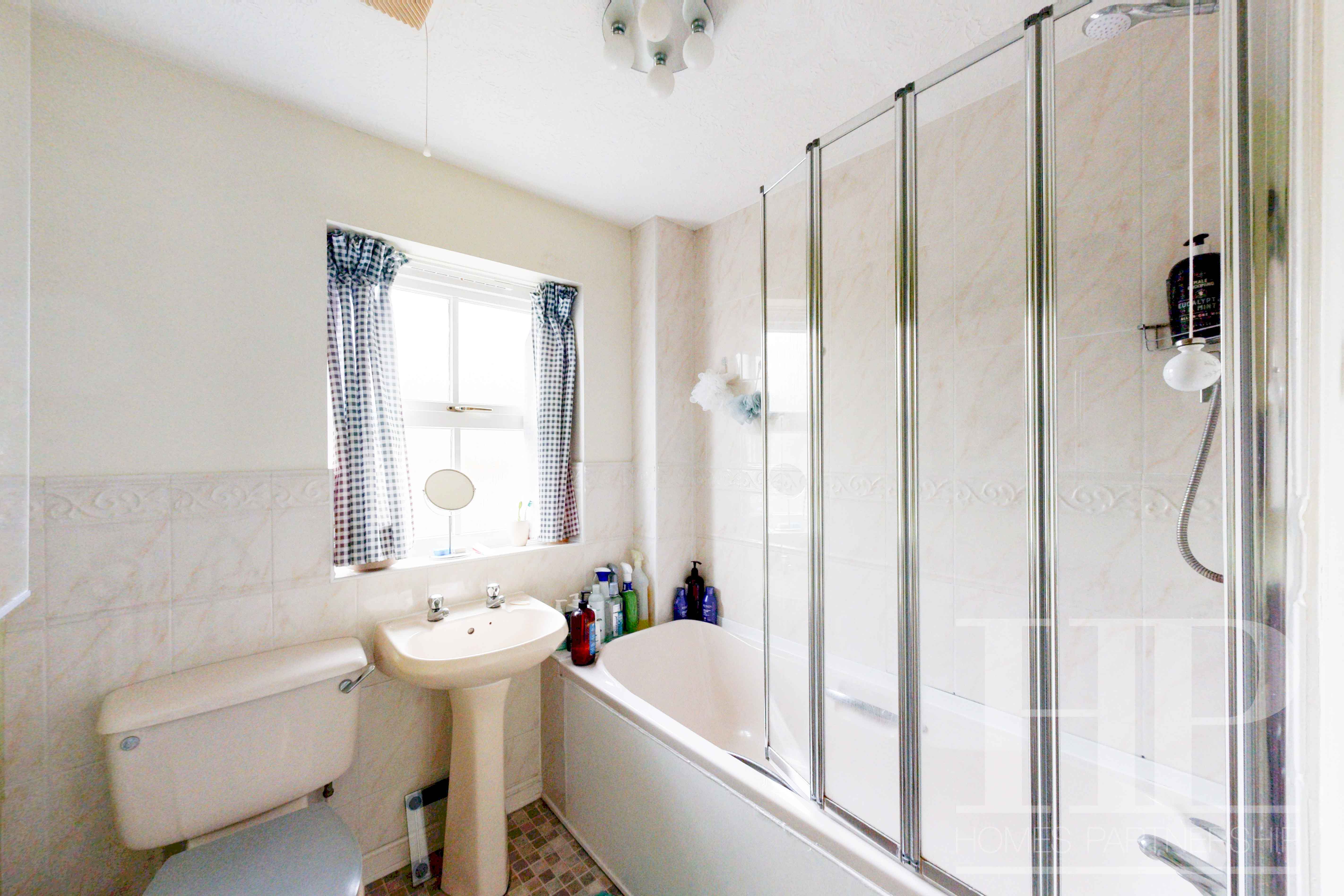 Fitted with a suite comprising a panelled bath with shower attachment over, pedestal wash hand basin and a low level WC. Radiator. Vinyl flooring. Airing cupboard housing hot water tank. Extractor fan. Double glazed opaque window to the rear.