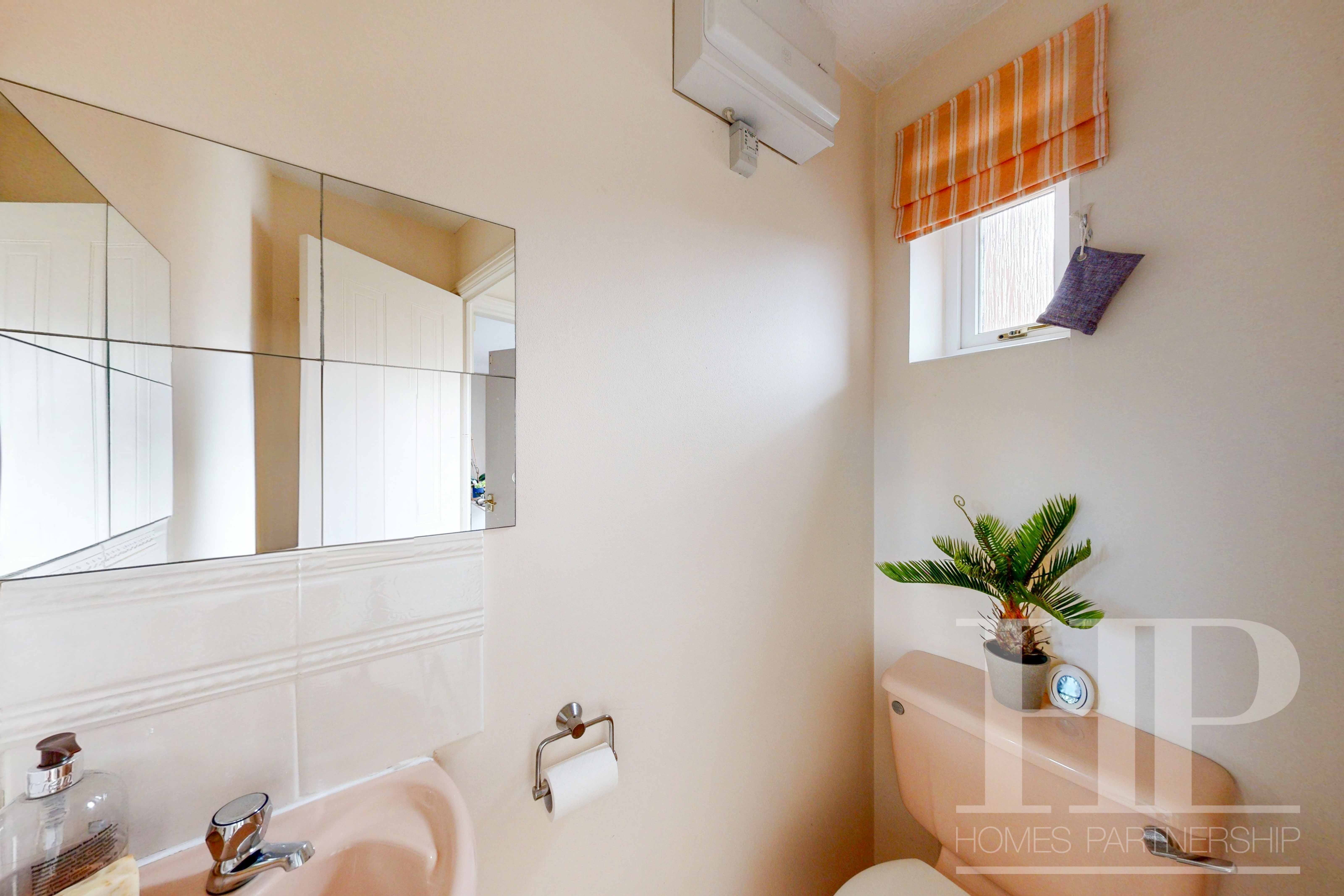 Fitted with a suite comprising a low level WC and a wash hand basin. Heated towel rail. Vinyl flooring. Double glazed opaque window to the front.