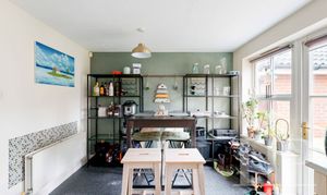 Single garage to the side / rear of the property with up & over door, power and light. Door to: