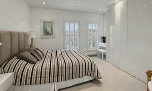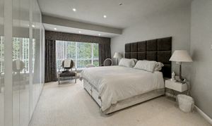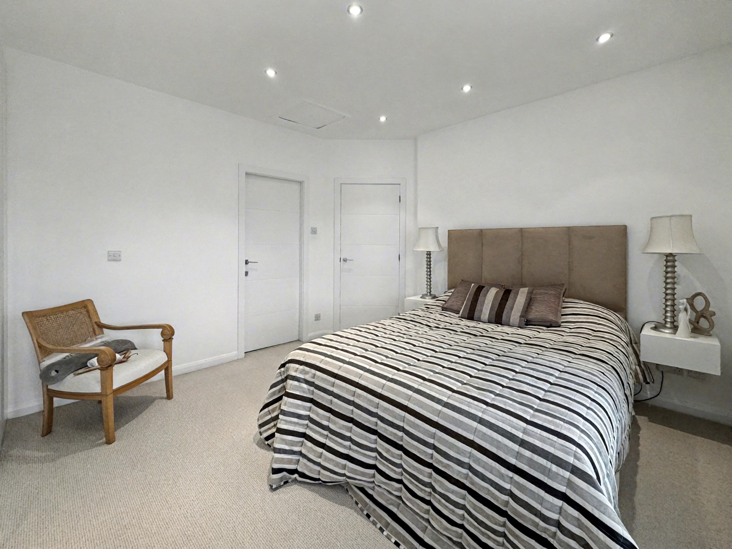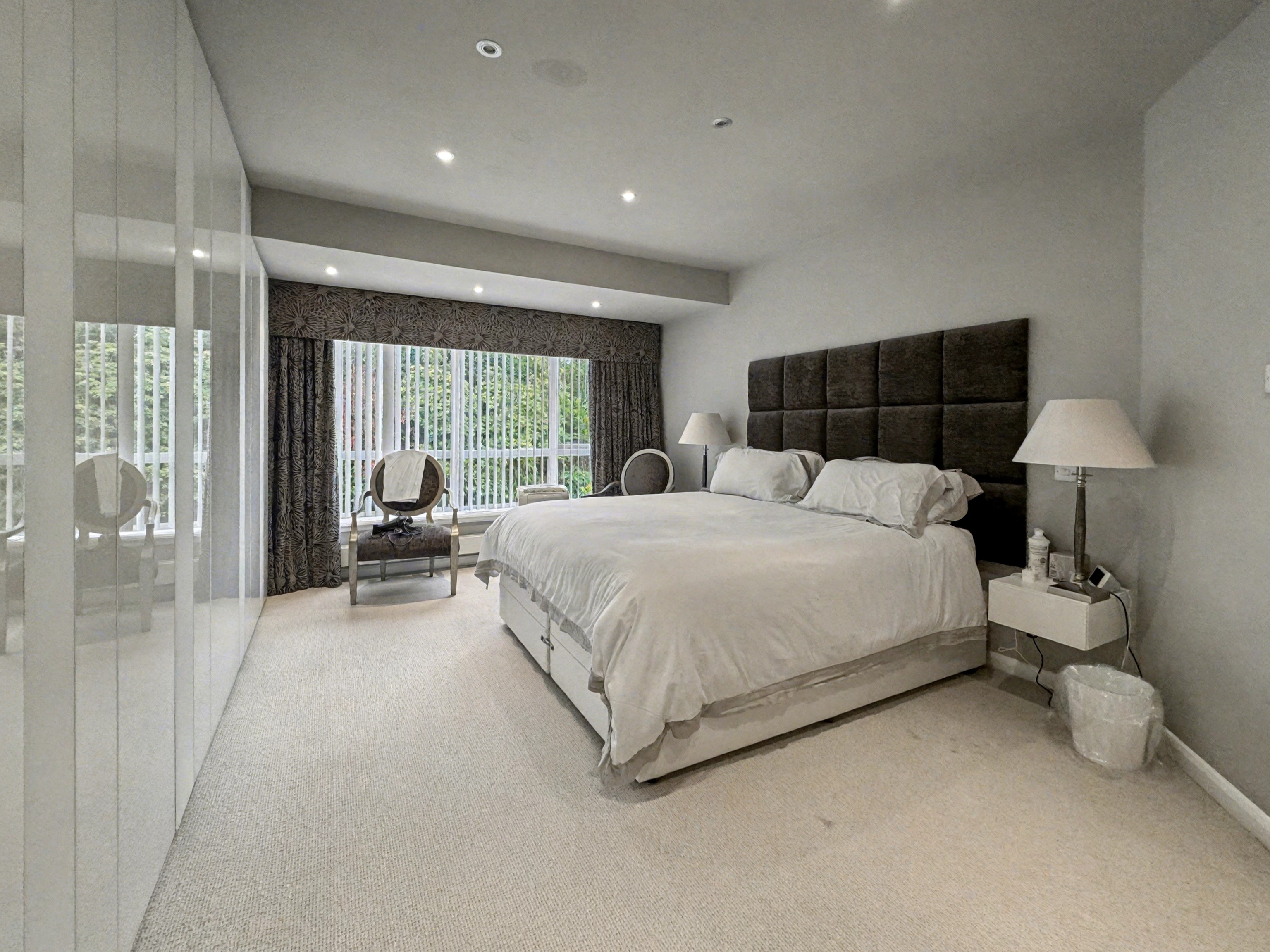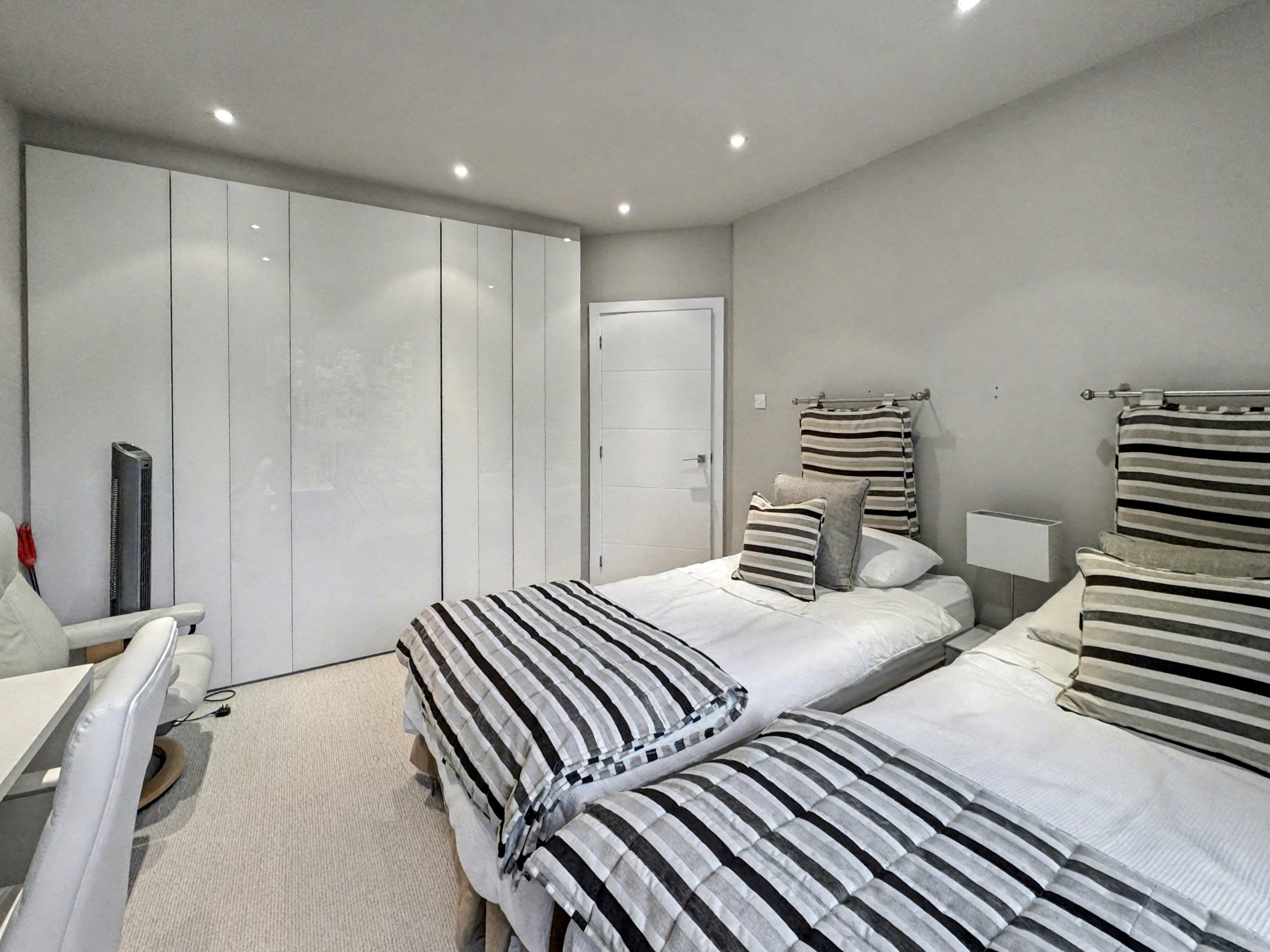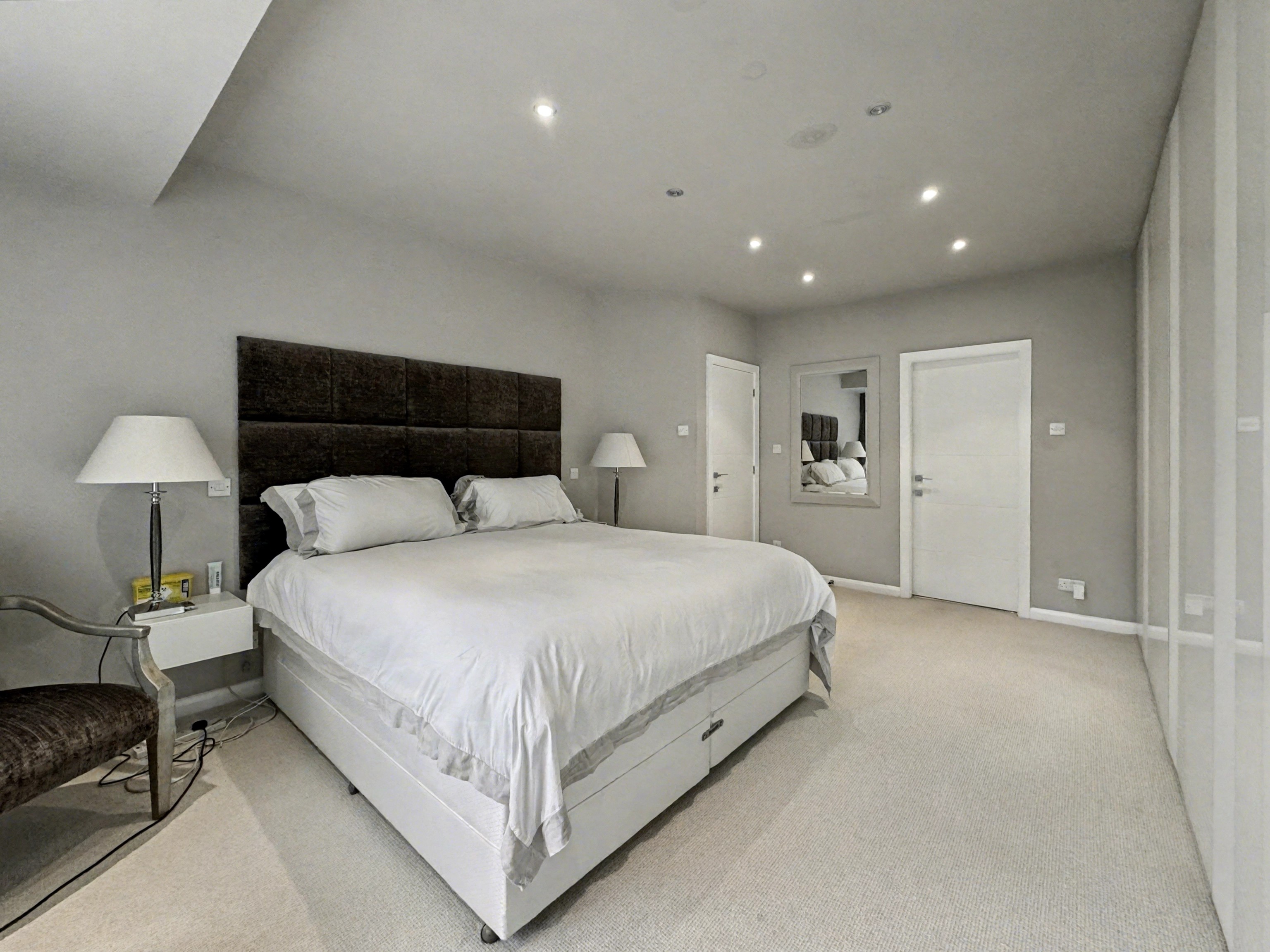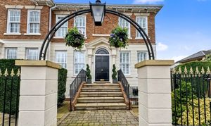 The first floor hosts four well-proportioned double bedrooms, including a spacious principal suite overlooking the rear garden, complete with fitted wardrobes and a private en-suite bathroom. The second bedroom also benefits from its own en-suite, while the remaining bedrooms are served by a stylish family bathroom. All bedrooms enjoy pleasant outlooks, either towards the central fountain or over the rear garden.