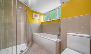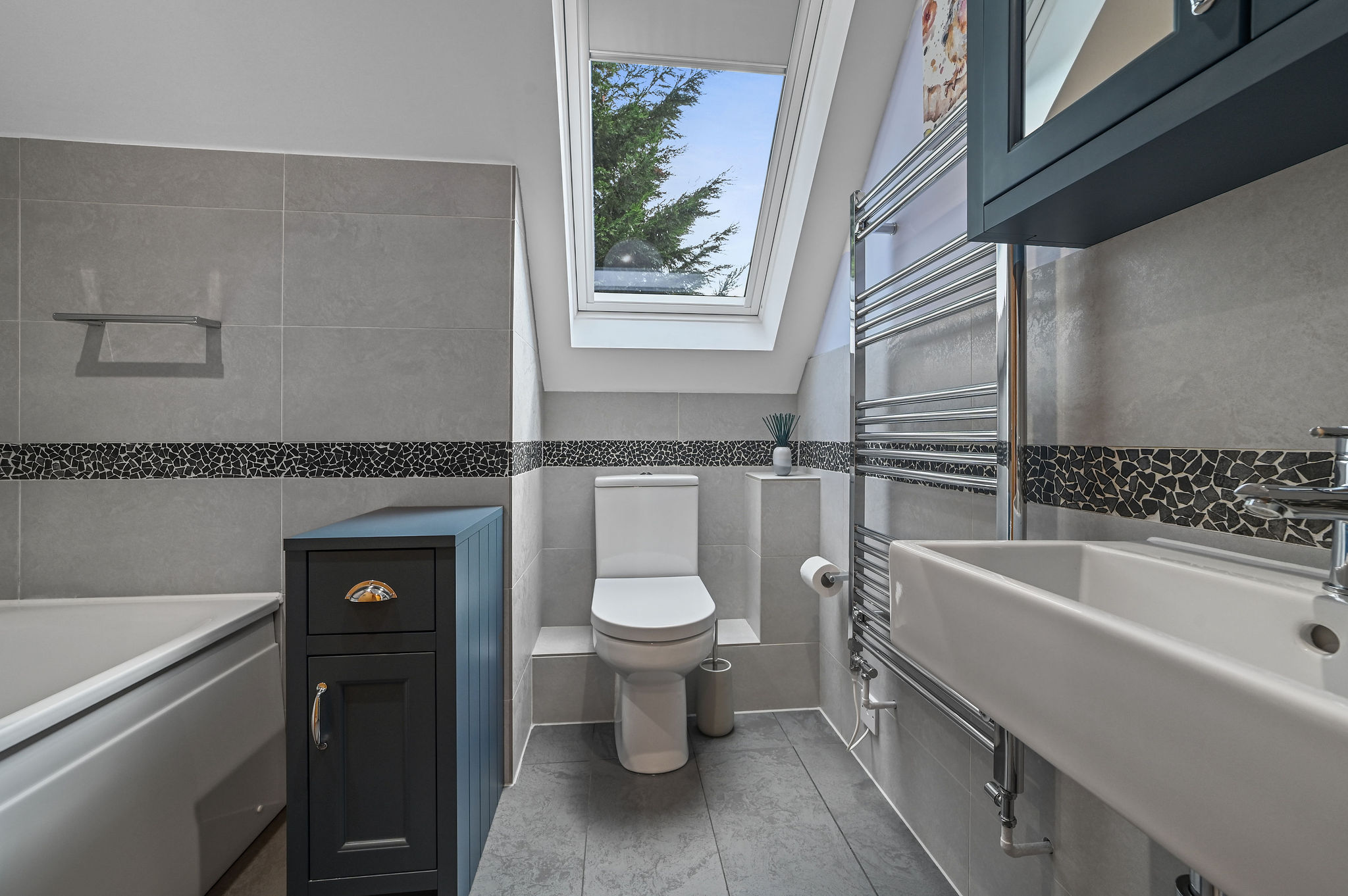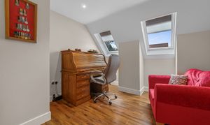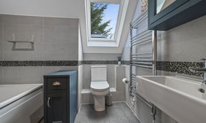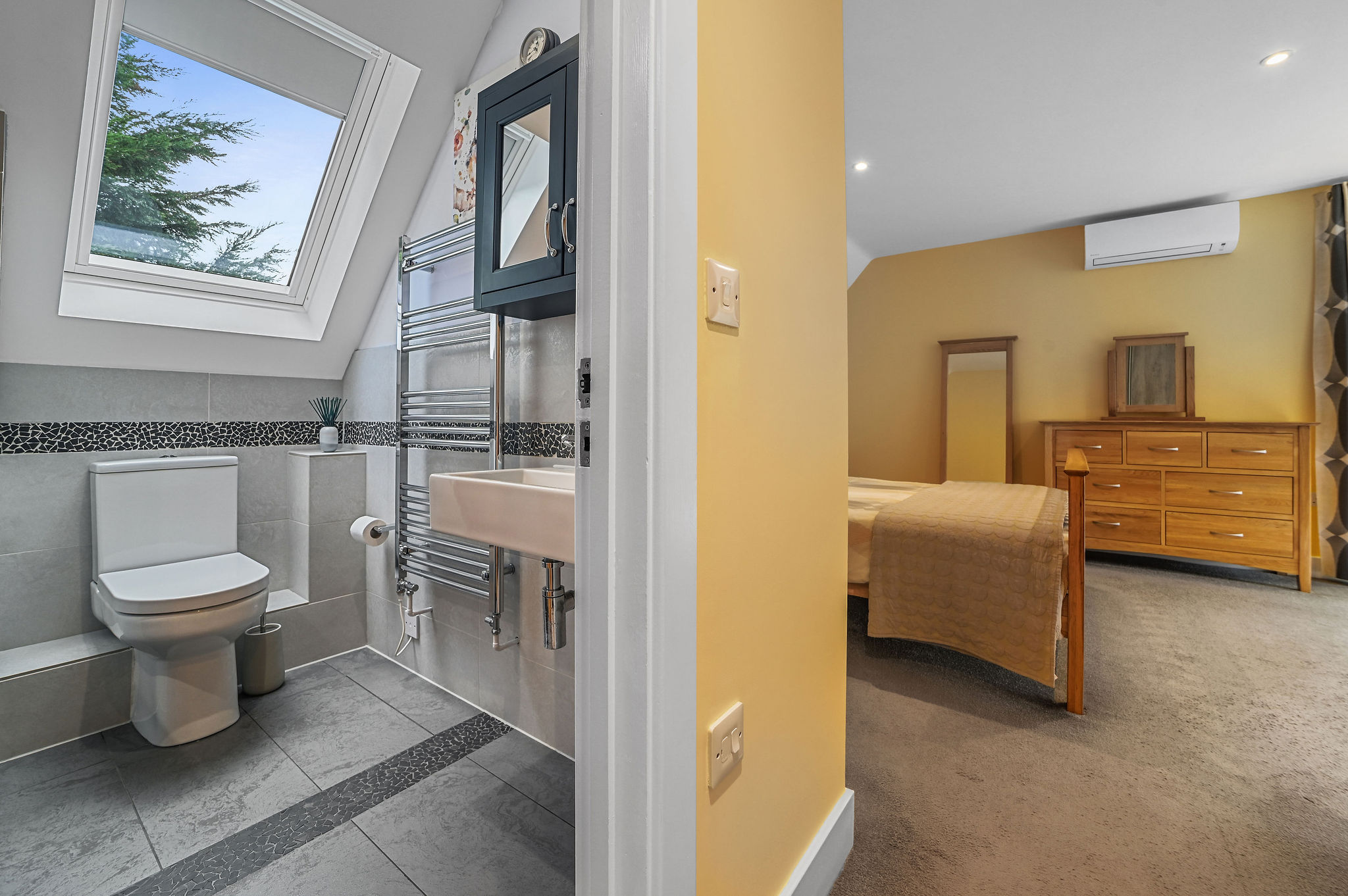 The first floor offers an impressive master bedroom with dressing area with built in wardrobes and stylish ensuite shower room, air conditioning and Juliette balcony. Two further double bedrooms and a family bathroom including bath and shower.