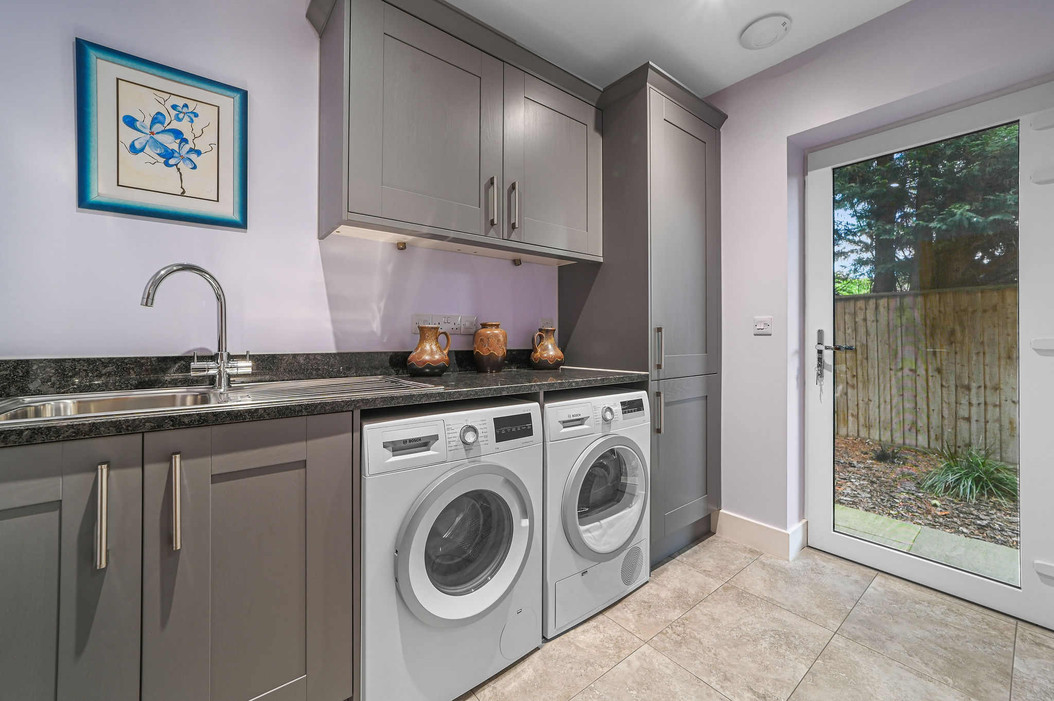 Perfectly presented throughout, this distinctive home offers entrance lobby and hall (with stairs to first floor), cloakroom, ample storage. A Fabulous bespoke integrated contemporary style kitchen with all modern conveniences, granite stone work surfaces with spacious dining area and picture window to the garden. Equally stylish fitted utility room with wall mounted gas boiler and door to outside.