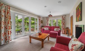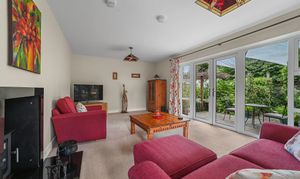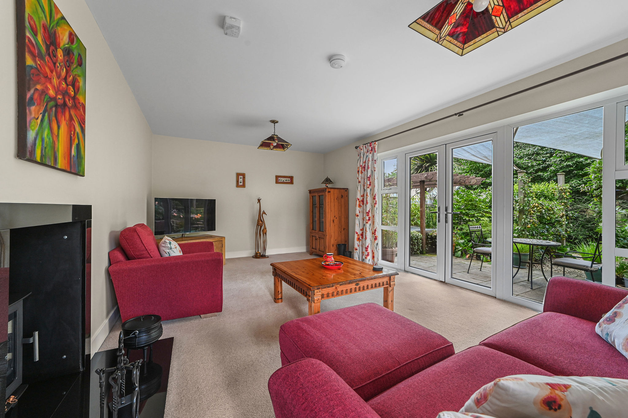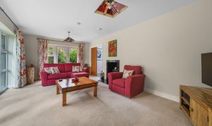 Double doors to an impressive double aspect lounge with multi-fuel stove feature. Two double opening door to the wrap around garden.
