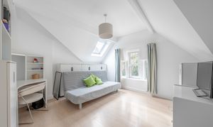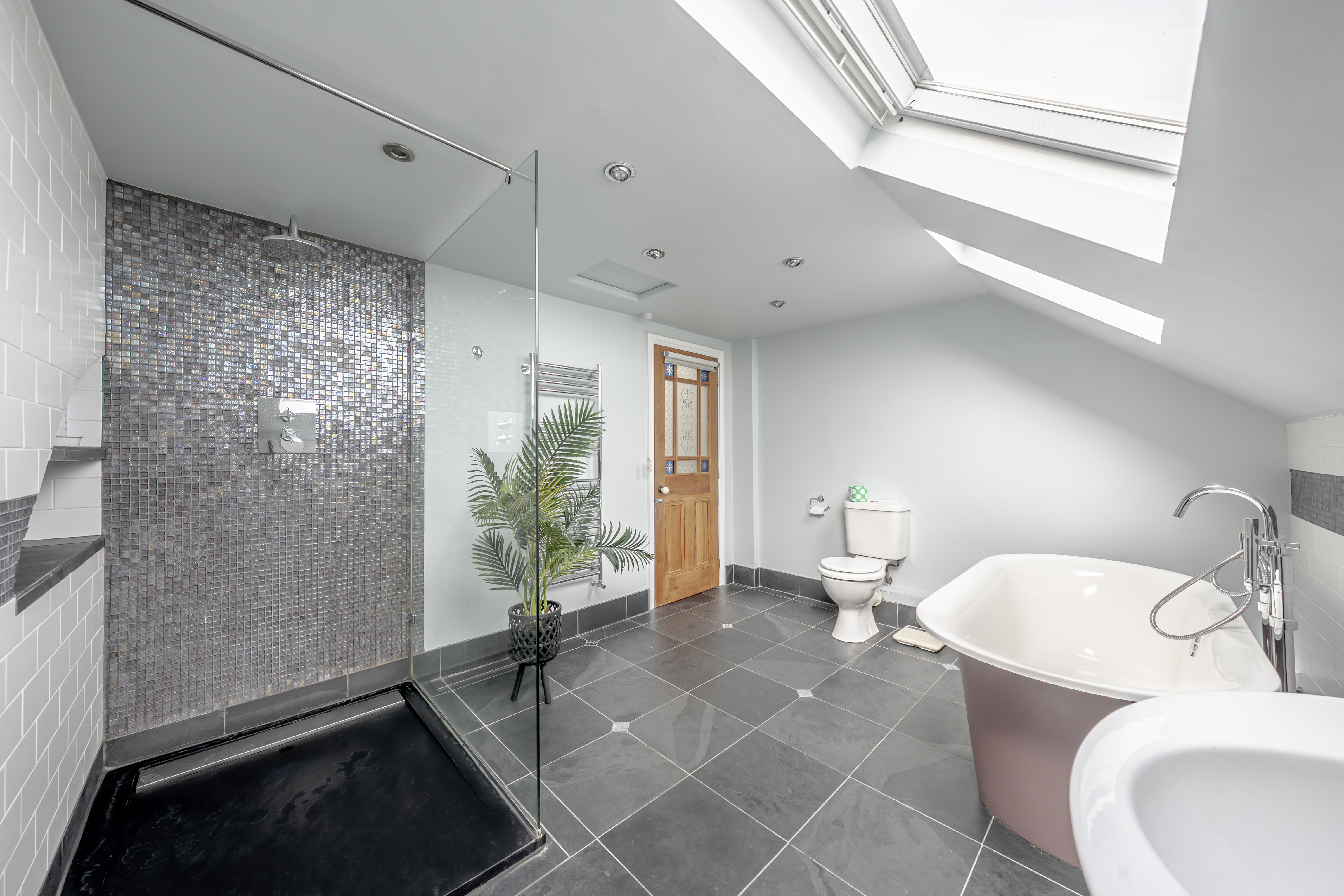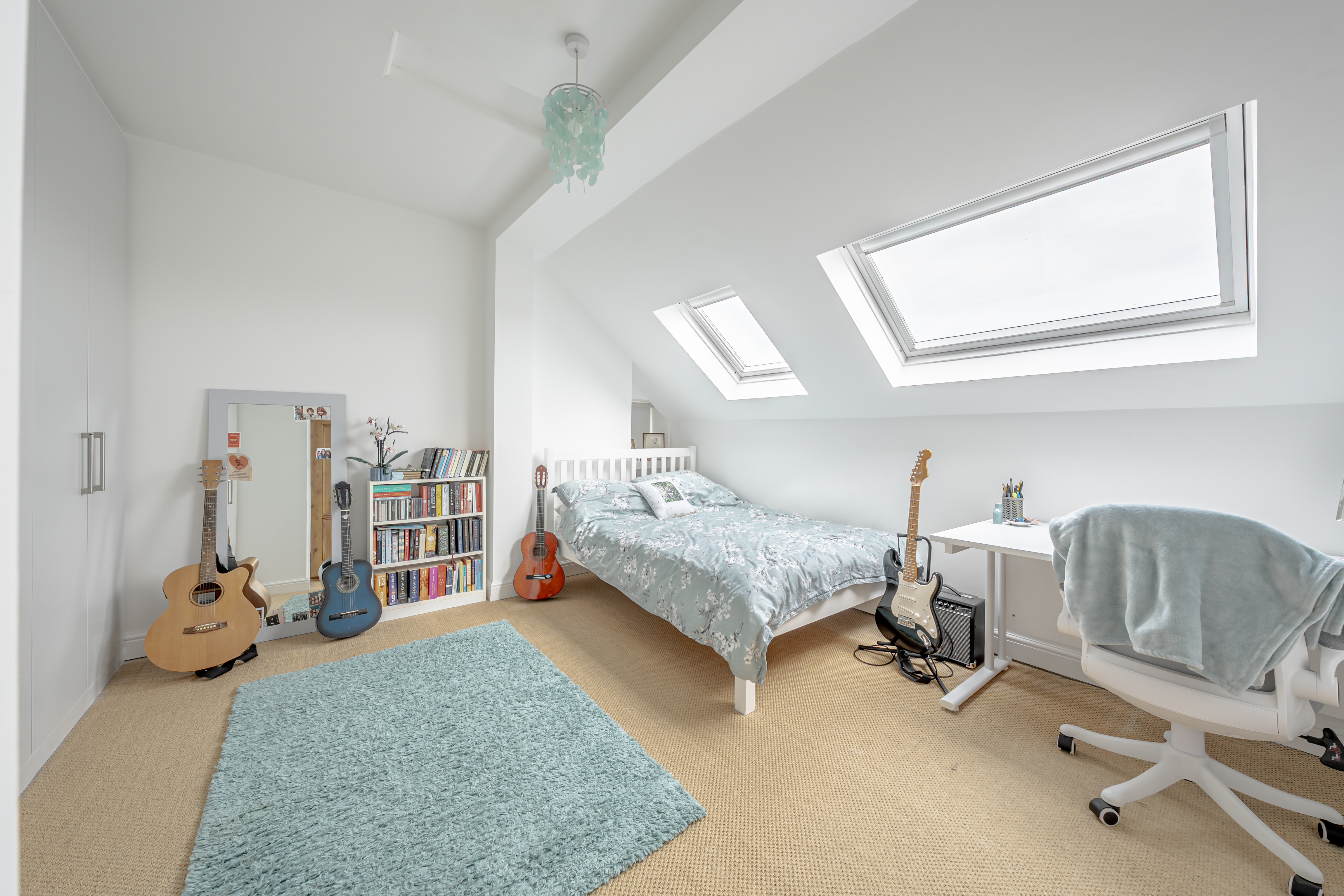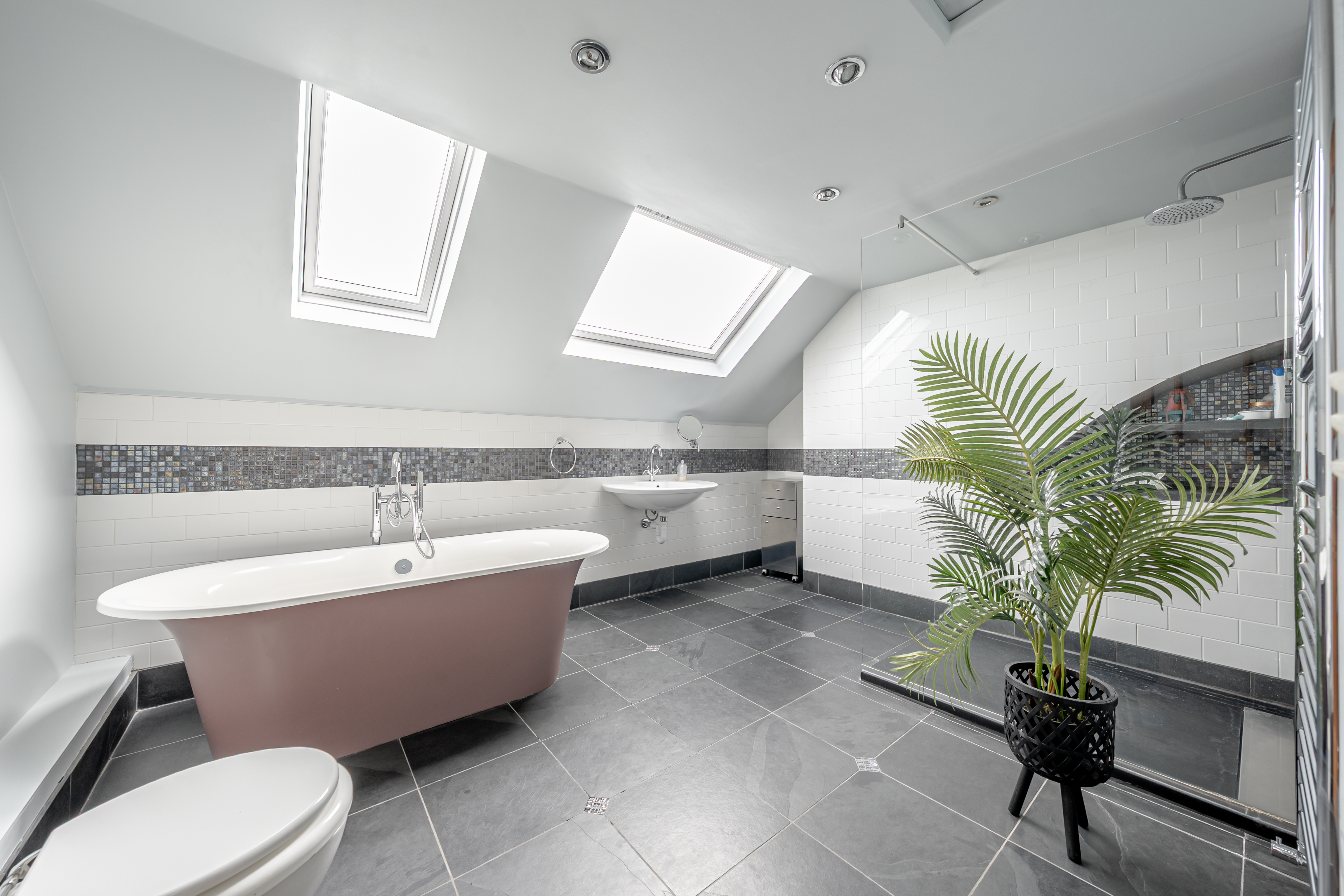 The second floor offers superb additional accommodation, comprising three further generous double bedrooms with skylights allowing excellent natural light, two benefitting from fitted storage. A contemporary house bathroom completes this level, appointed with a freestanding bath and separate walk-in shower, creating an ideal space for family or guests.