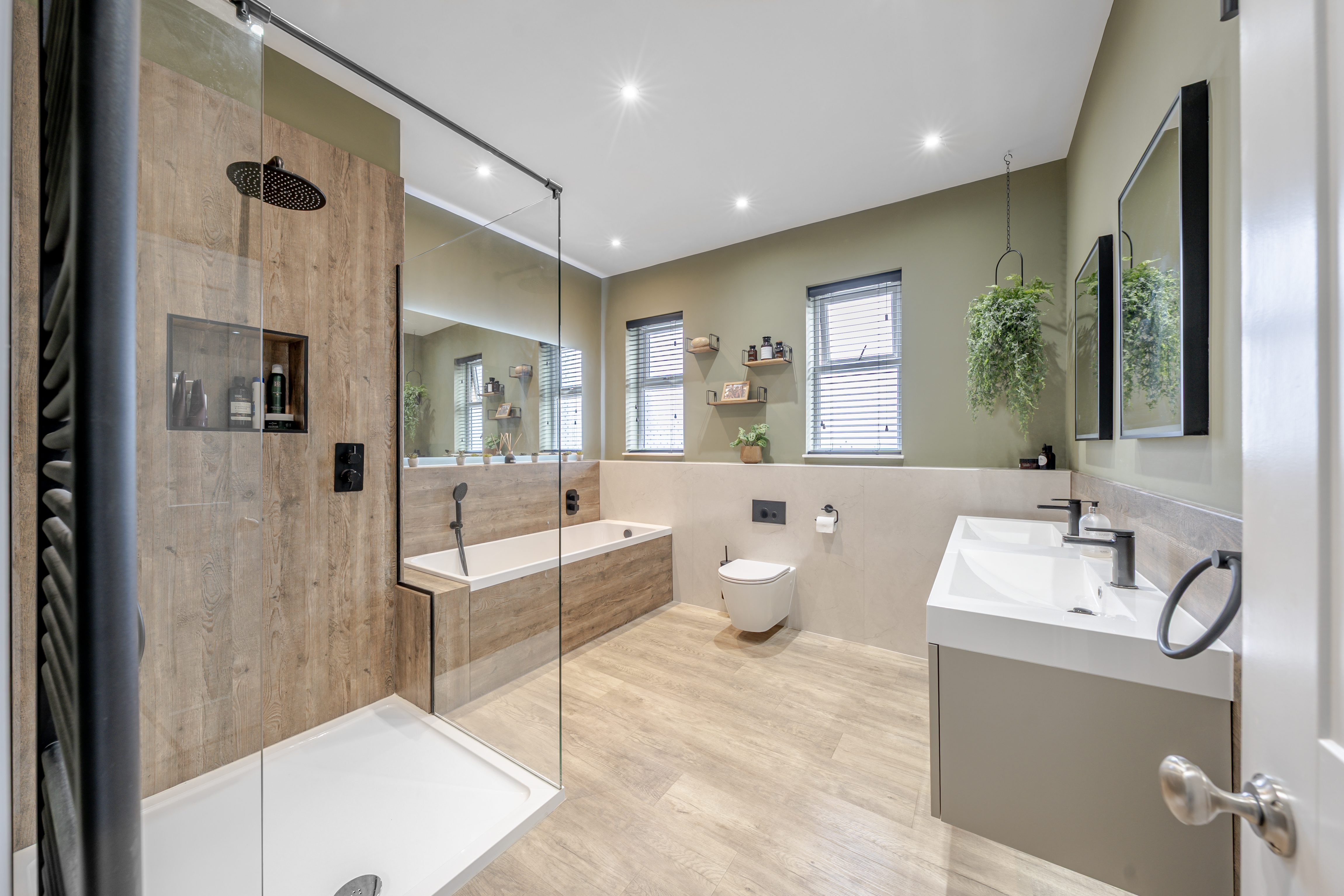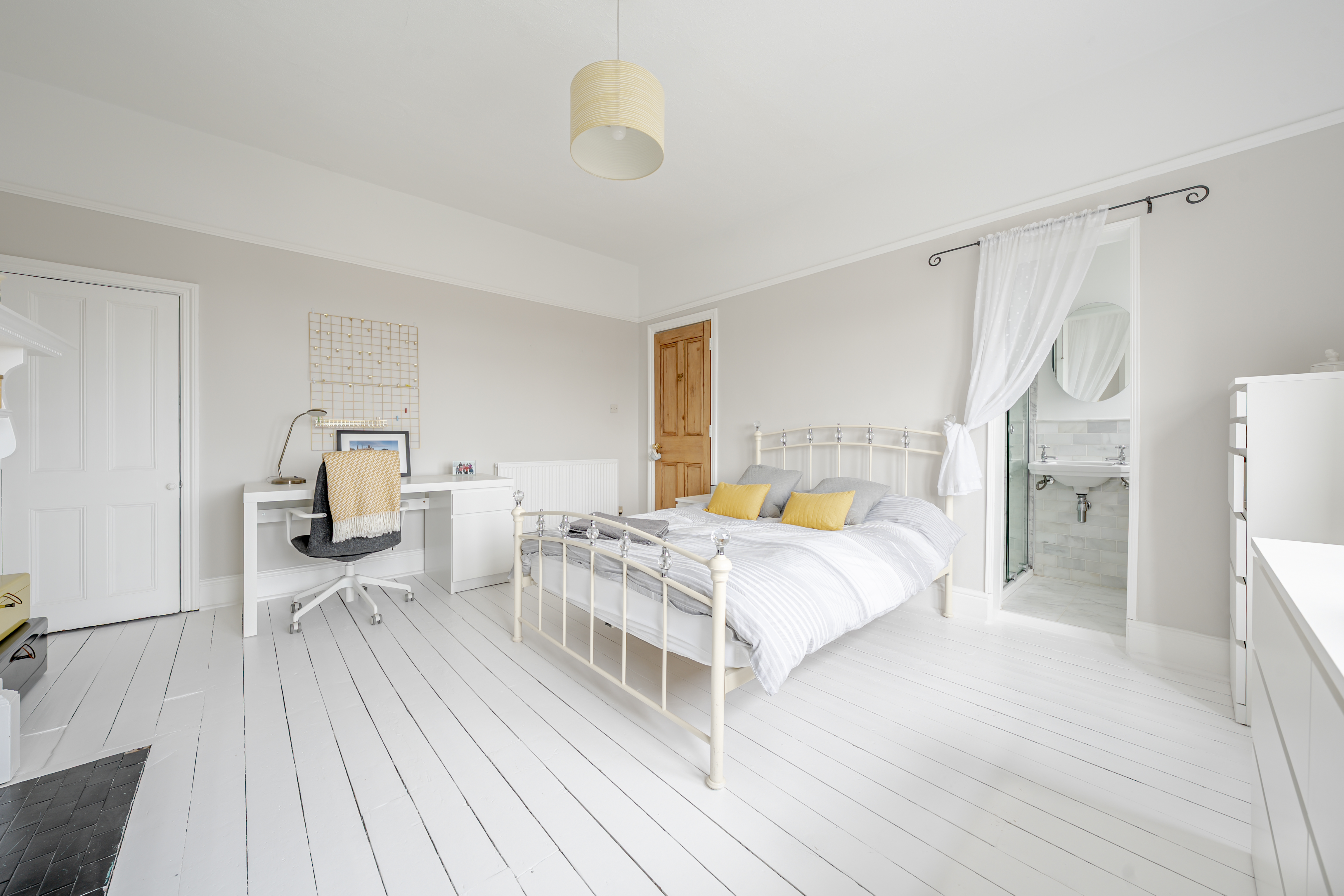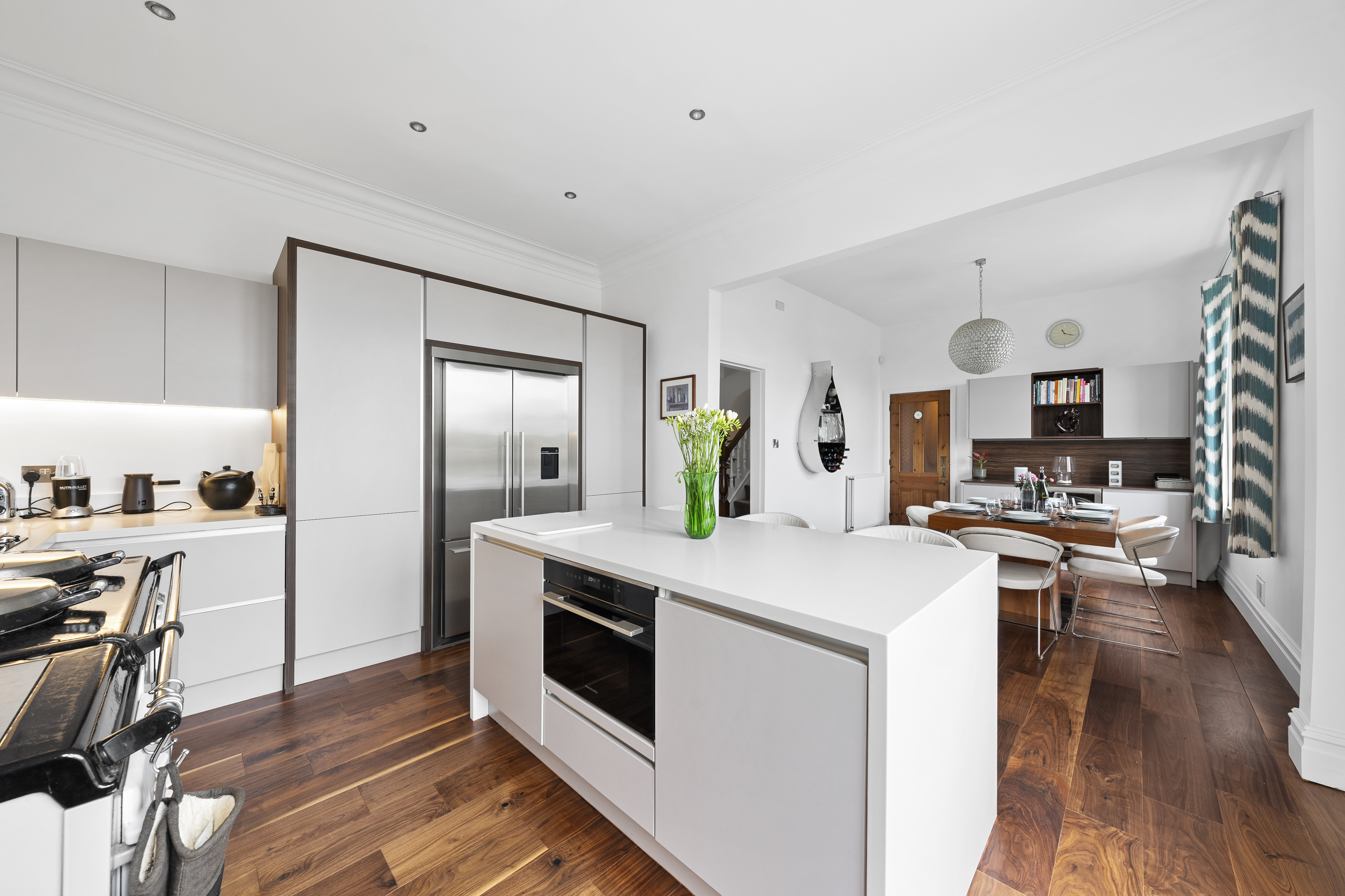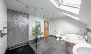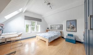 The second floor offers superb additional accommodation, comprising three further generous double bedrooms with skylights allowing excellent natural light, two benefitting from fitted storage. A contemporary house bathroom completes this level, appointed with a freestanding bath and separate walk-in shower, creating an ideal space for family or guests.