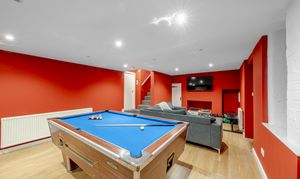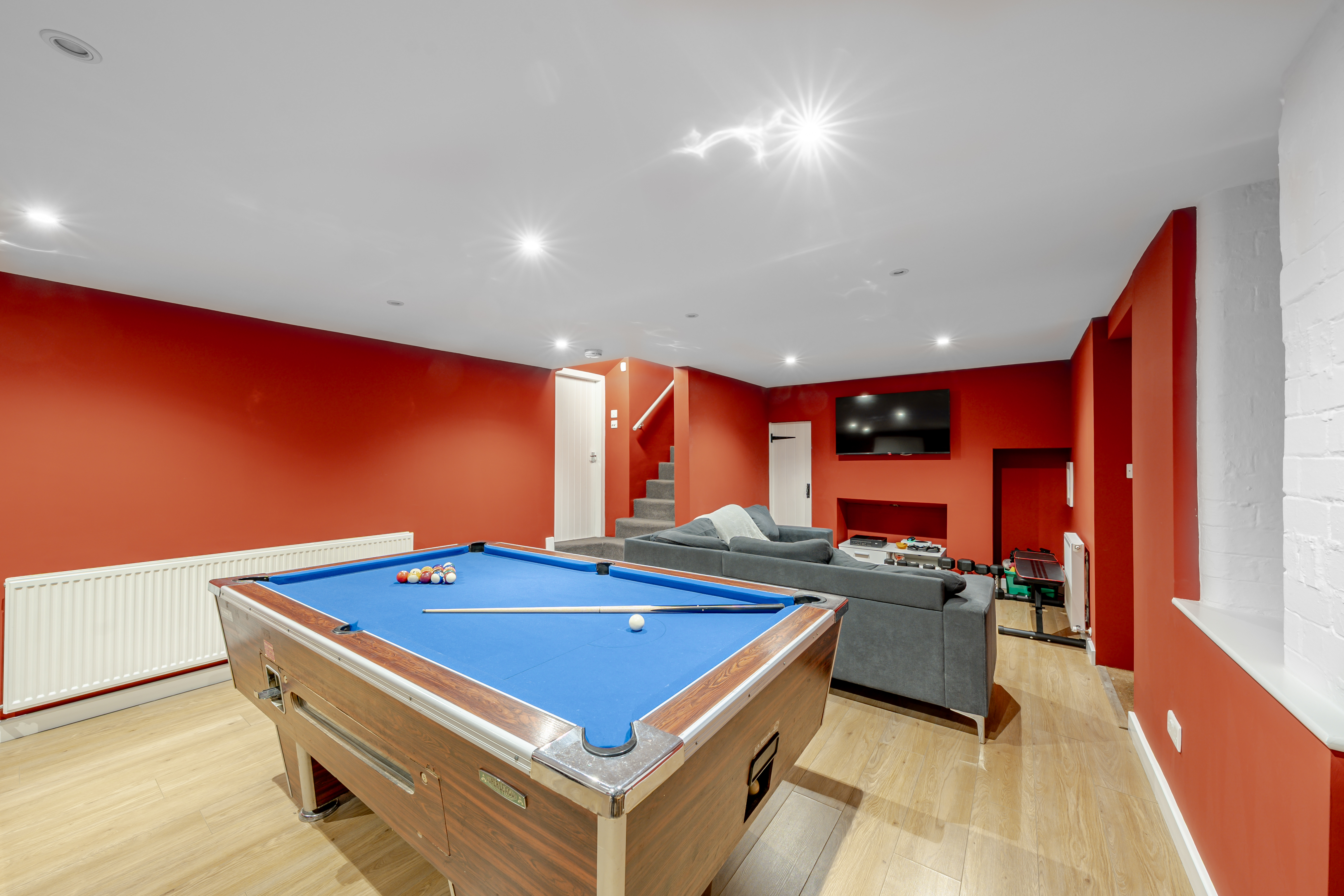 The lower ground floor provides outstanding versatility, offering multiple storage rooms, a WC and a substantial recreational space currently arranged as a games room, easily adaptable as a home gym, cinema room or office suite. From here, internal access leads to the substantial double garage with twin doors opening to the rear driveway.