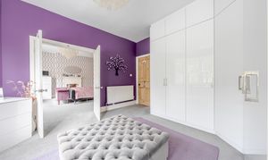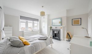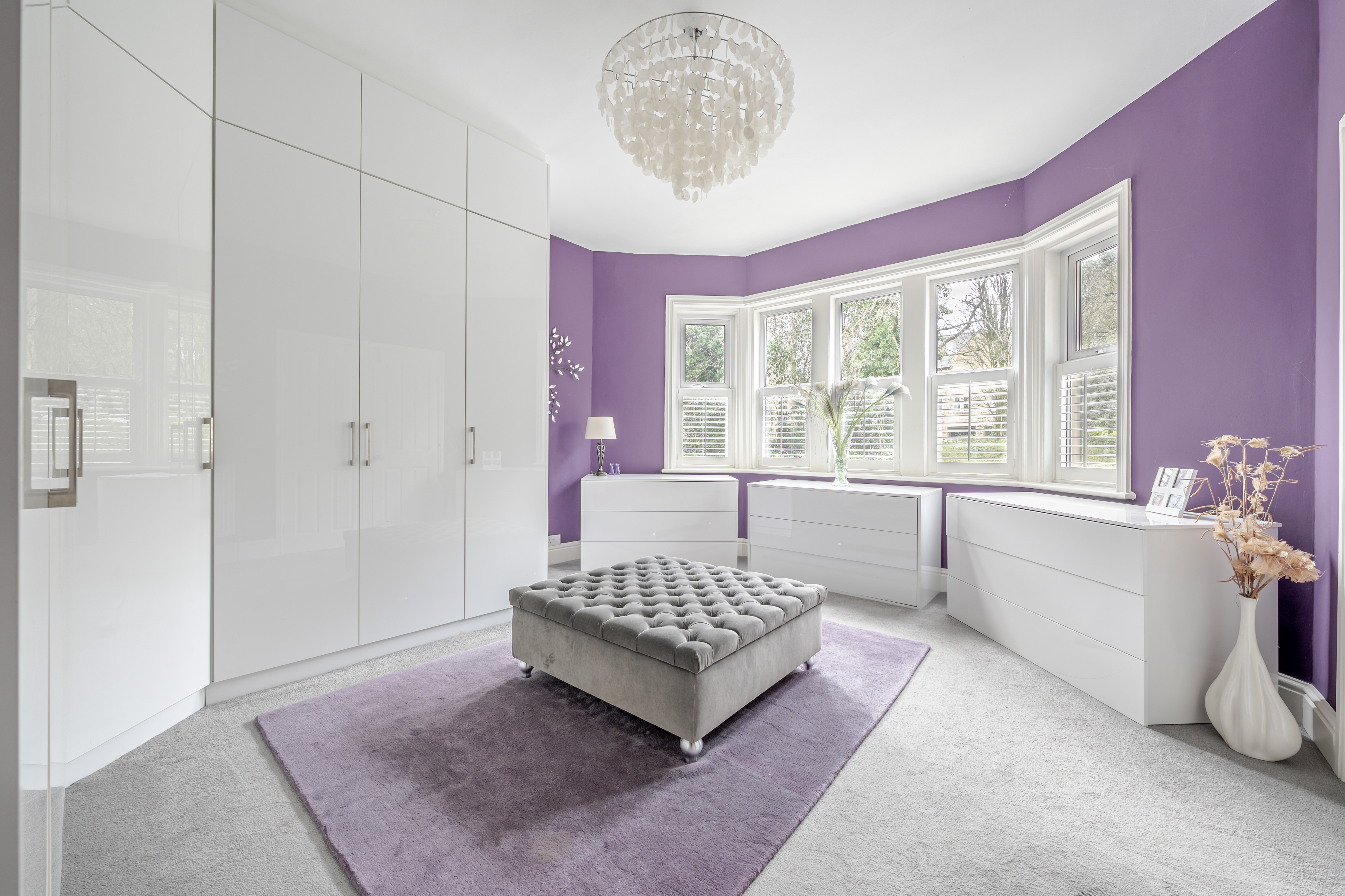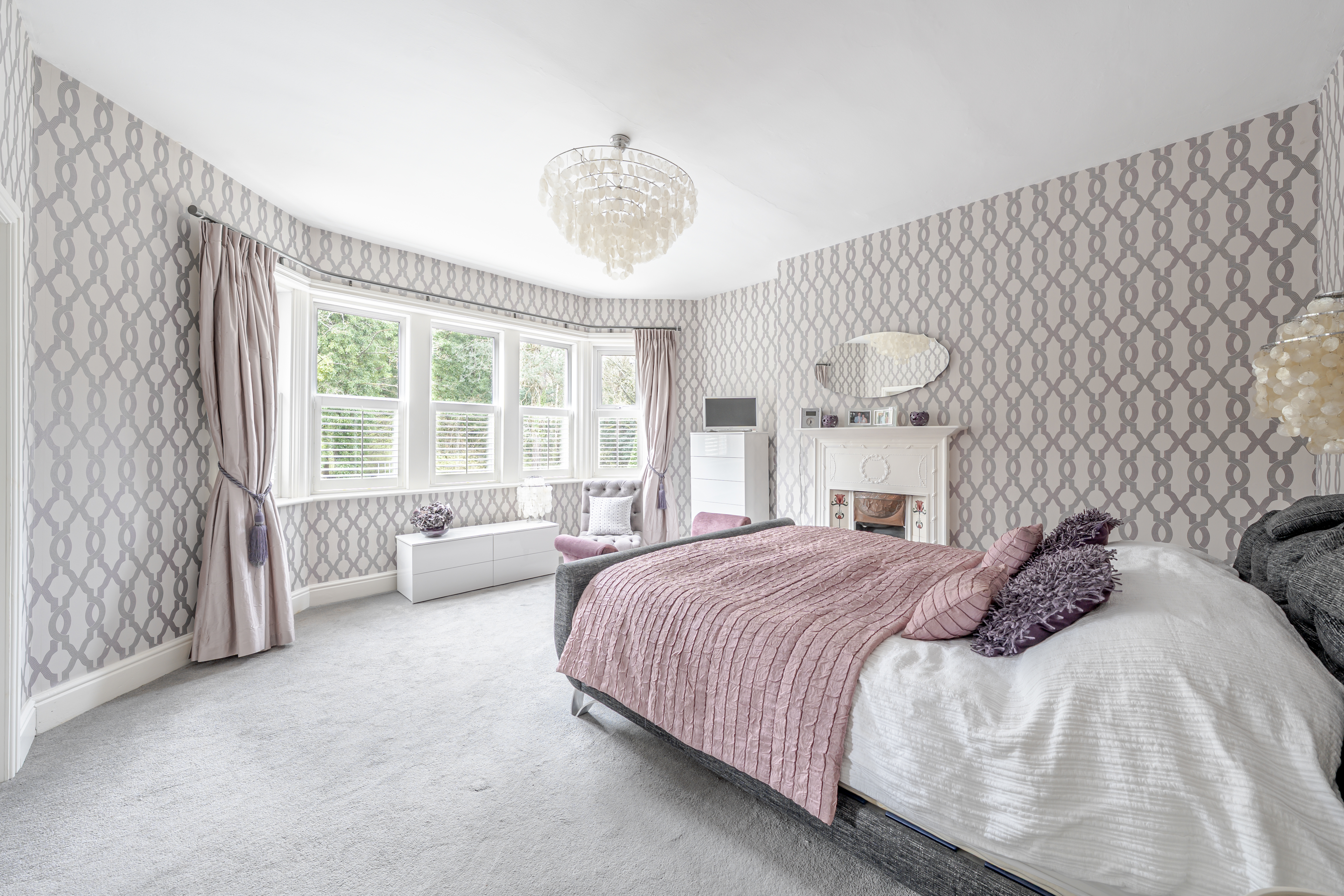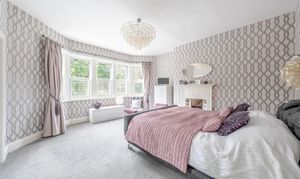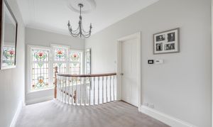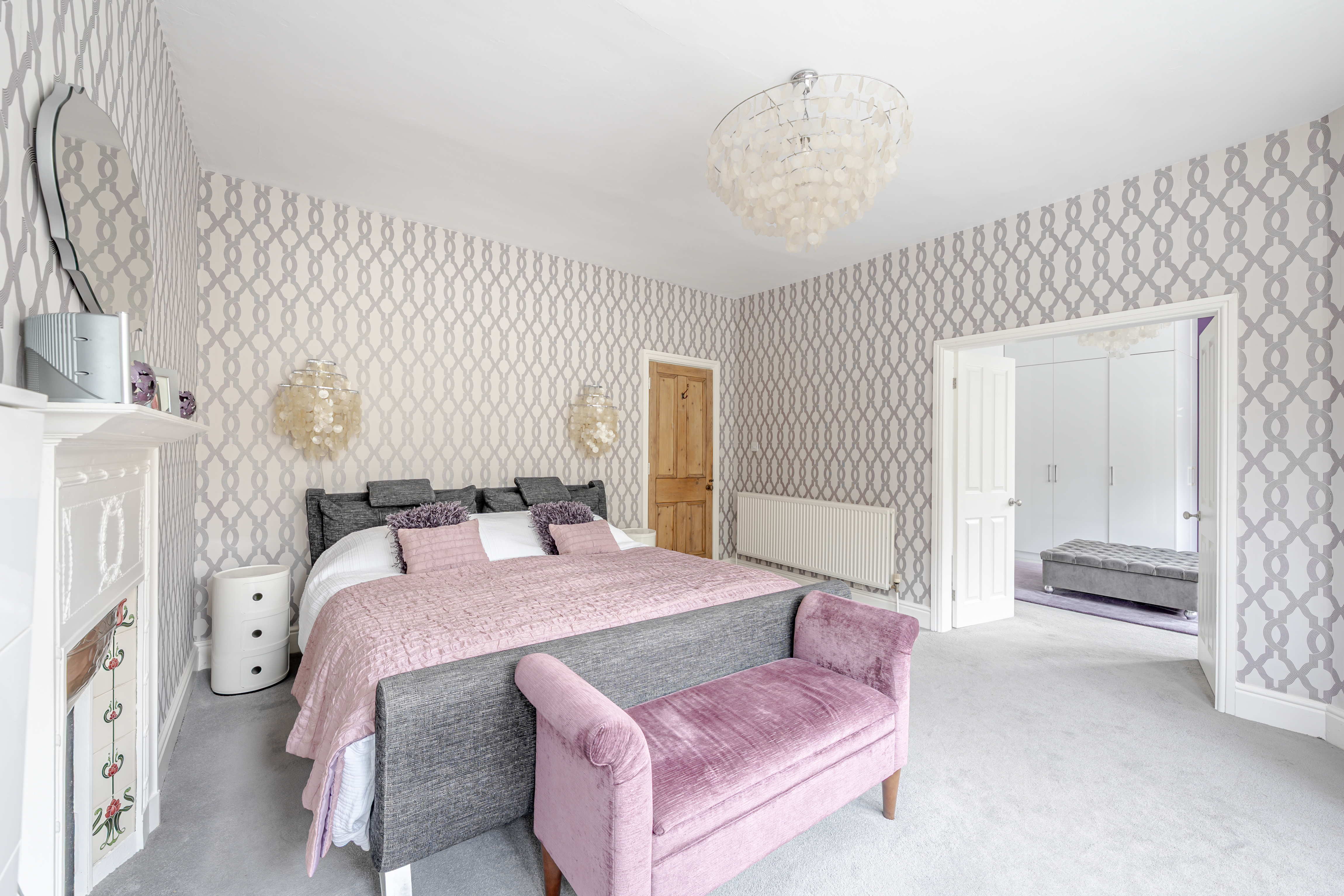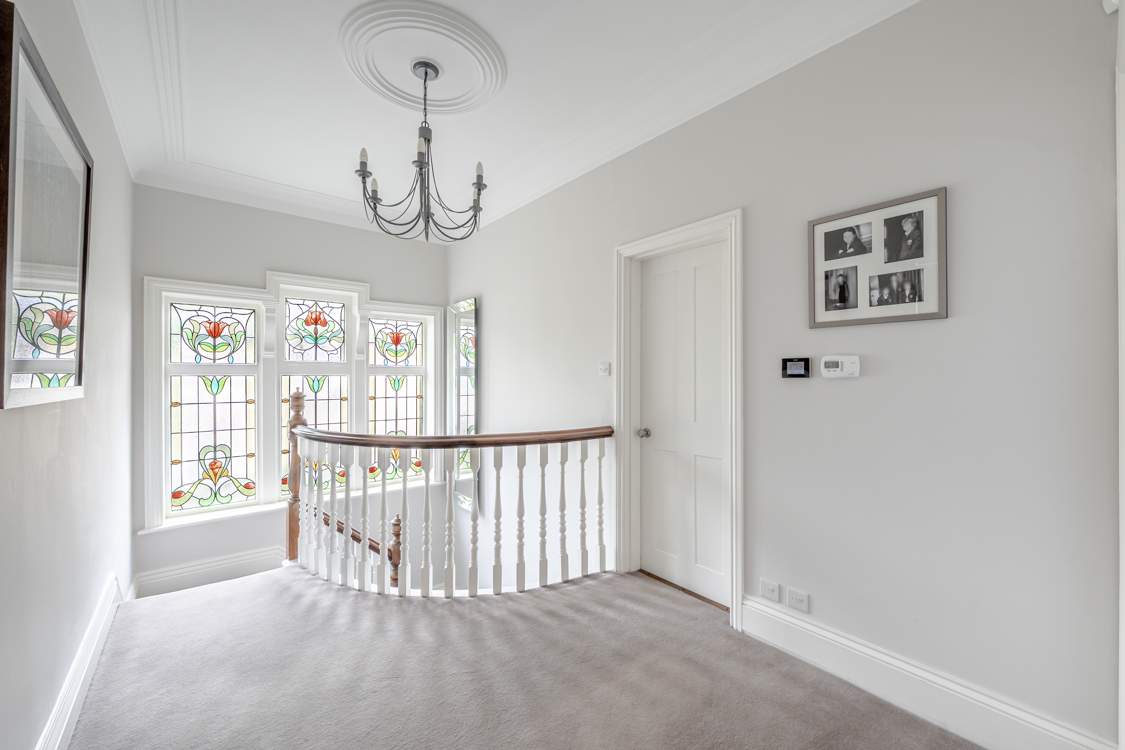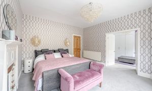 The first floor continues the home’s sense of scale and elegance. Two beautifully proportioned double bedrooms are positioned on this level, including a luxurious guest suite with en-suite shower room. The principal suite enjoys a charming bay window to the front elevation and connects via double doors to a private dressing room / sixth double bedroom, with further bay window and extensive fitted wardrobes. A stylish family bathroom serves the floor, featuring a bath, walk-in shower, twin vanity sinks and an airing cupboard, while additional landing storage enhances practicality.