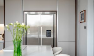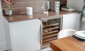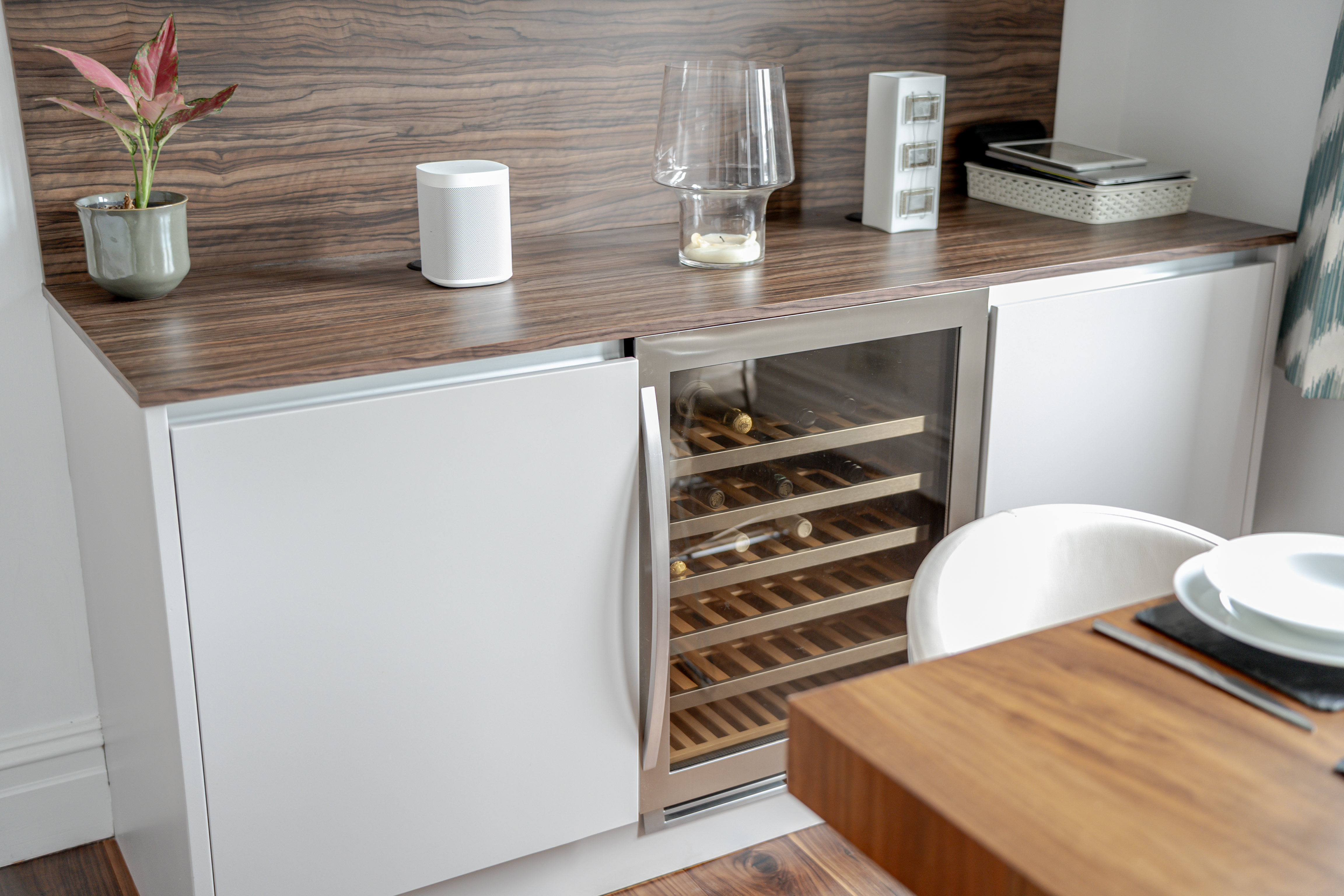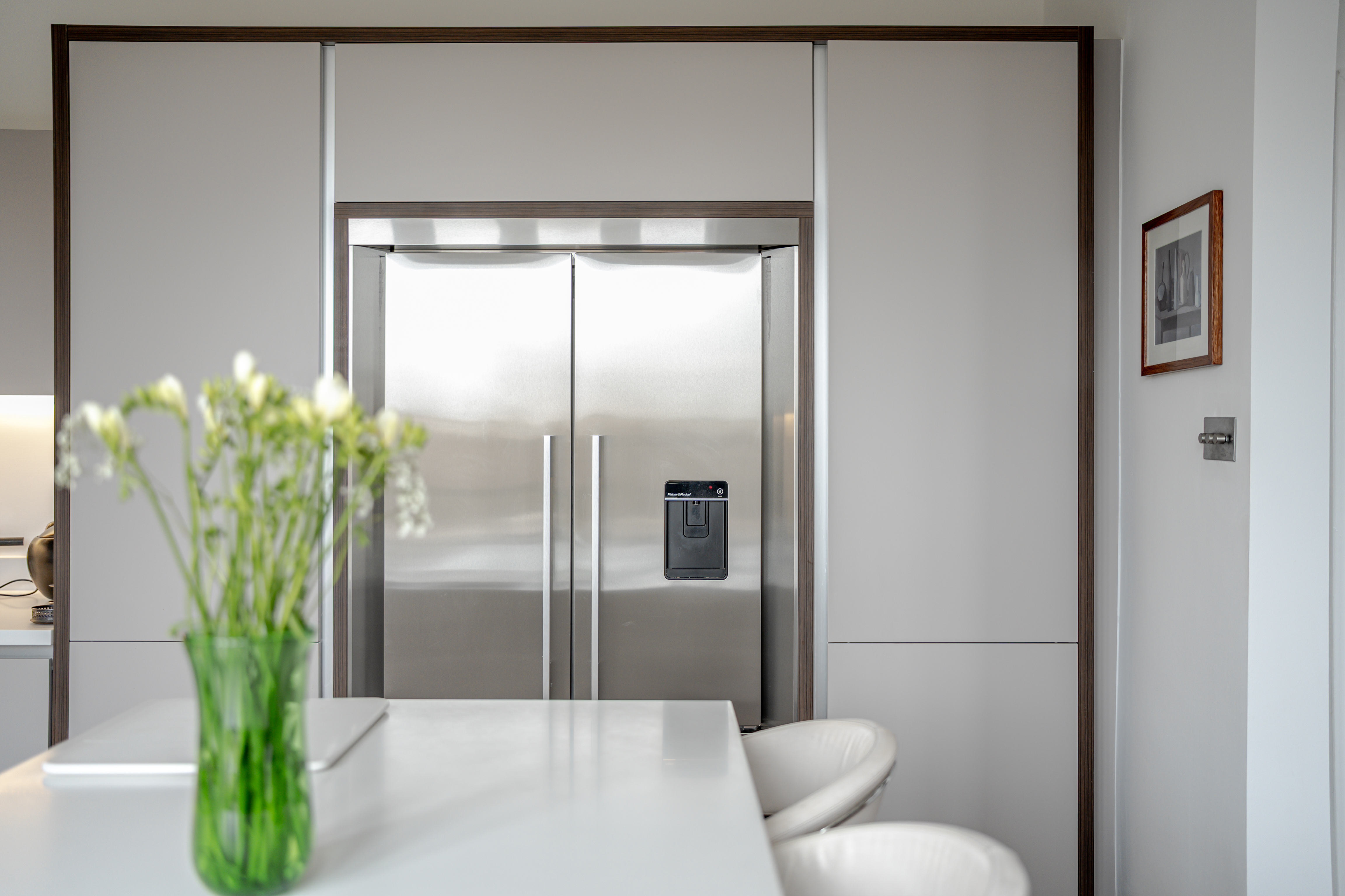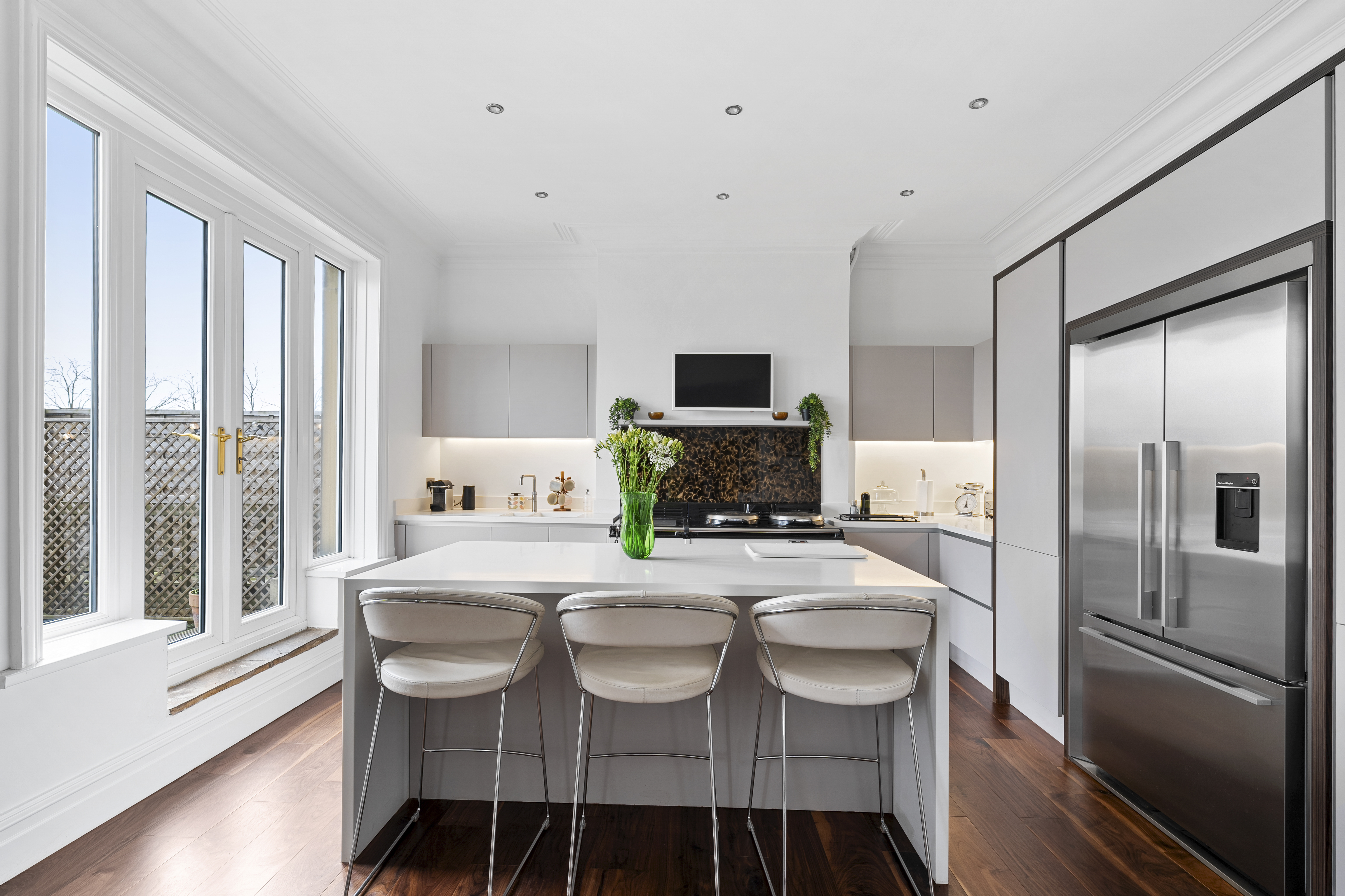To the rear of the property, the heart of the home unfolds in the form of an exceptional open-plan living kitchen and dining space. Finished with solid wood flooring and bespoke cabinetry, the kitchen is centred around an impressive island, made of Corian, like all of the work surfaces, and complemented by premium appliances. A generous dining and family area enjoys views over the garden, with French doors opening directly onto a sun terrace — ideal for indoor-outdoor entertaining.
