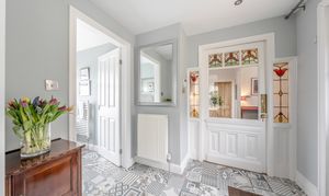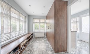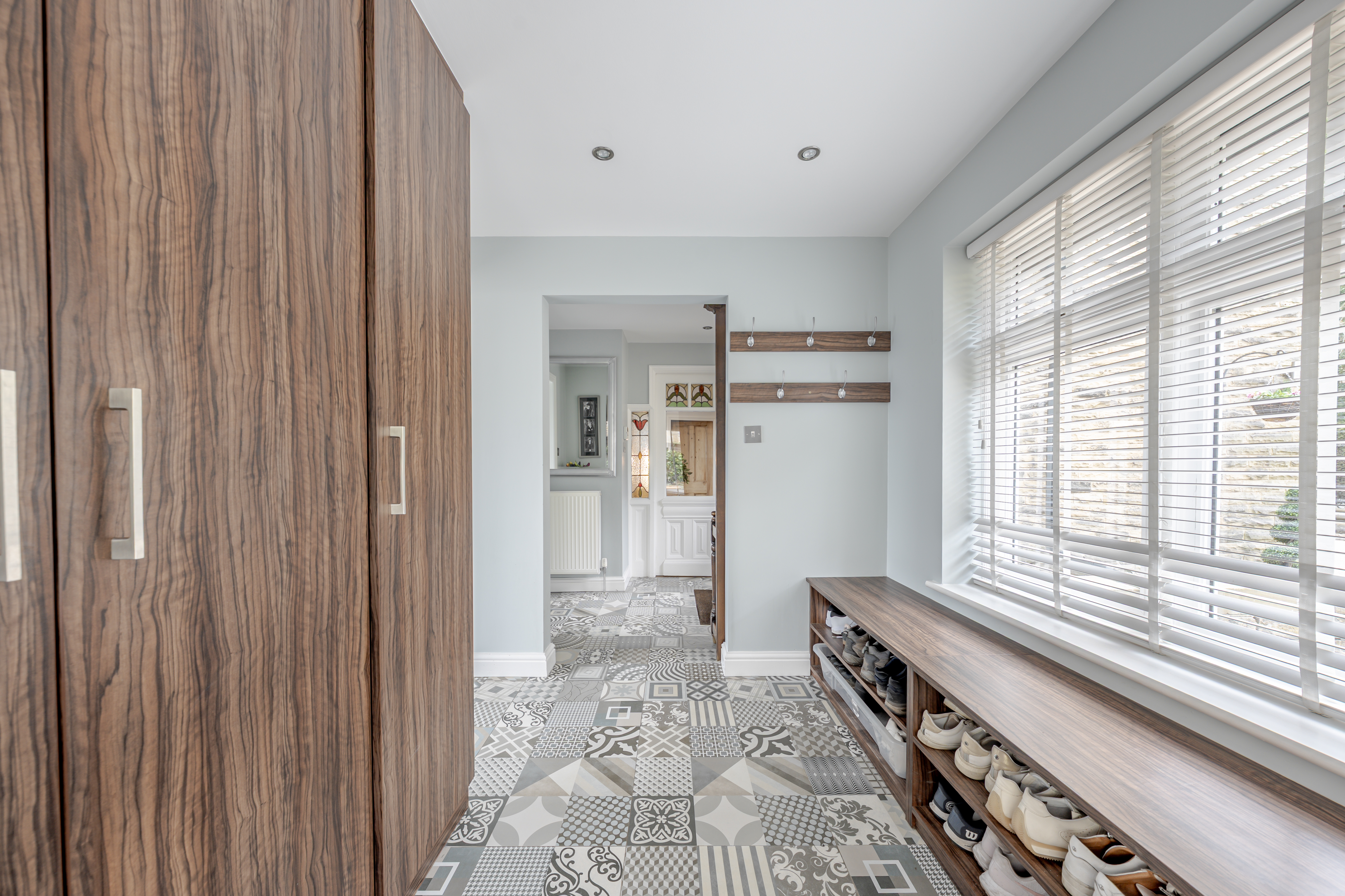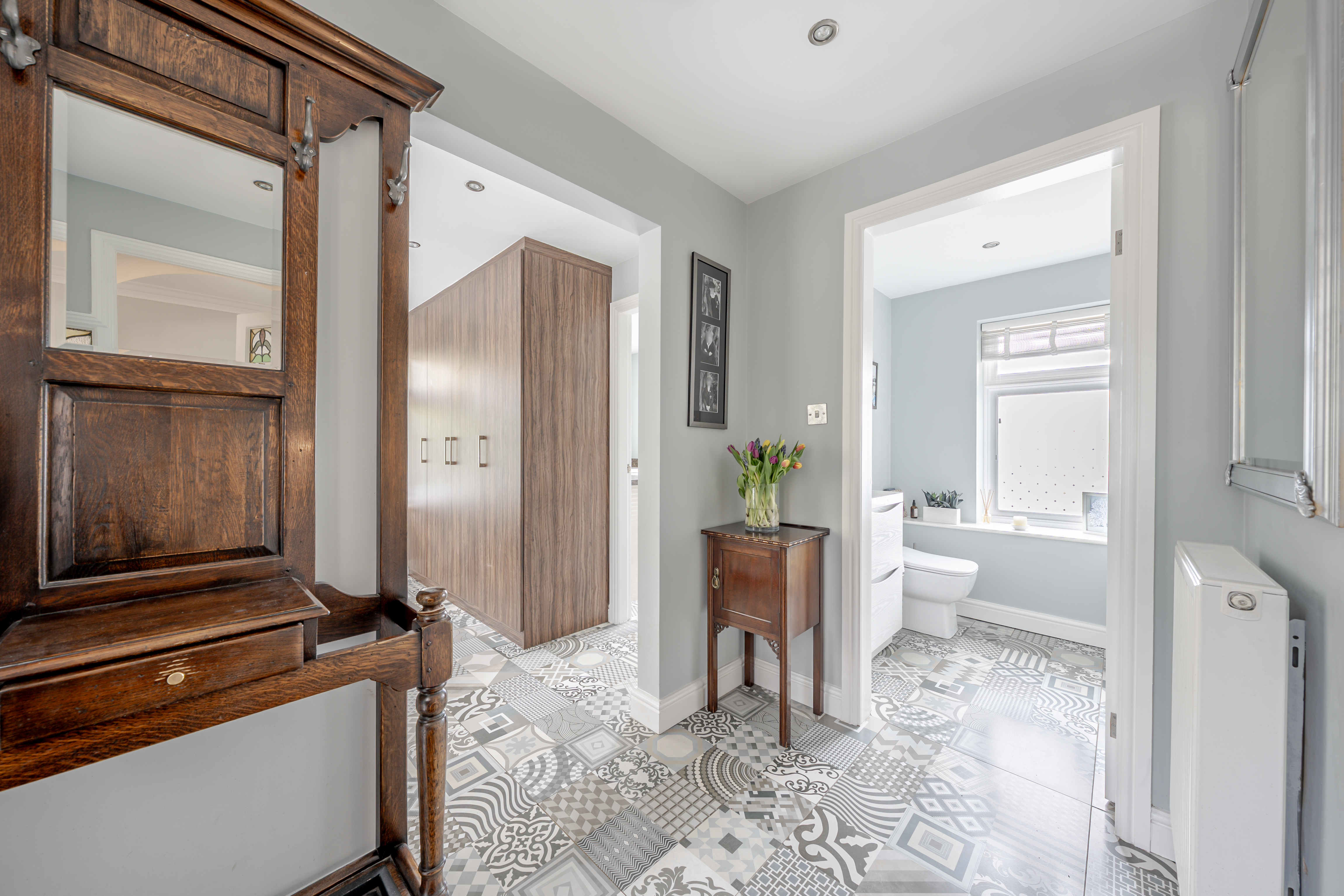 The home opens into a grand reception hallway, immediately conveying a sense of space and refinement. To the left lies a well-appointed boot room with bespoke fitted storage, leading through to a practical utility room and guest cloakroom/WC — thoughtfully designed for modern family living.
