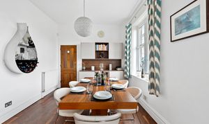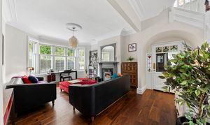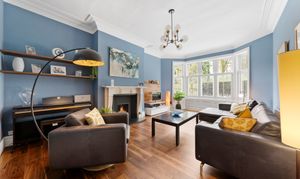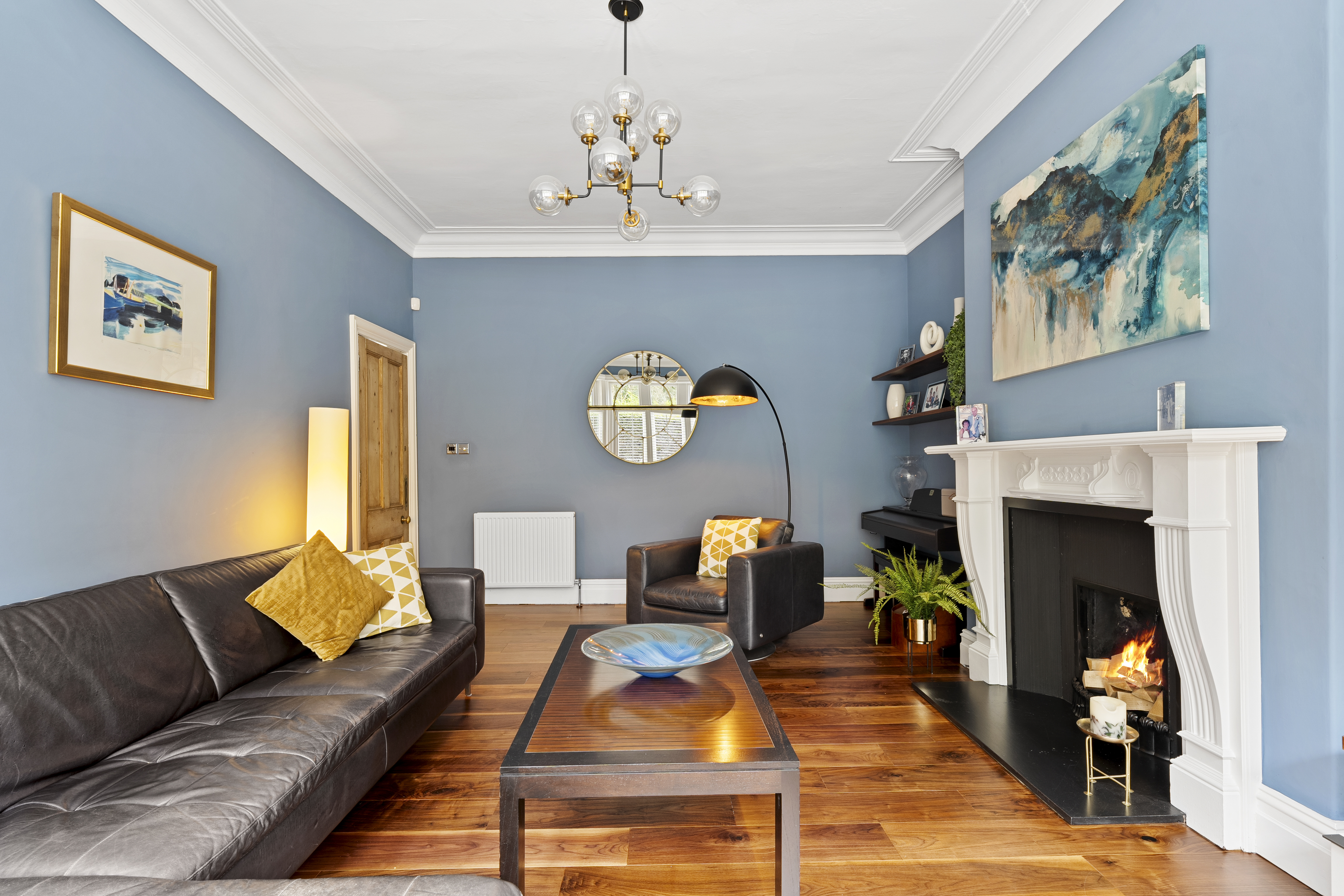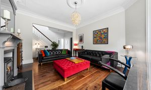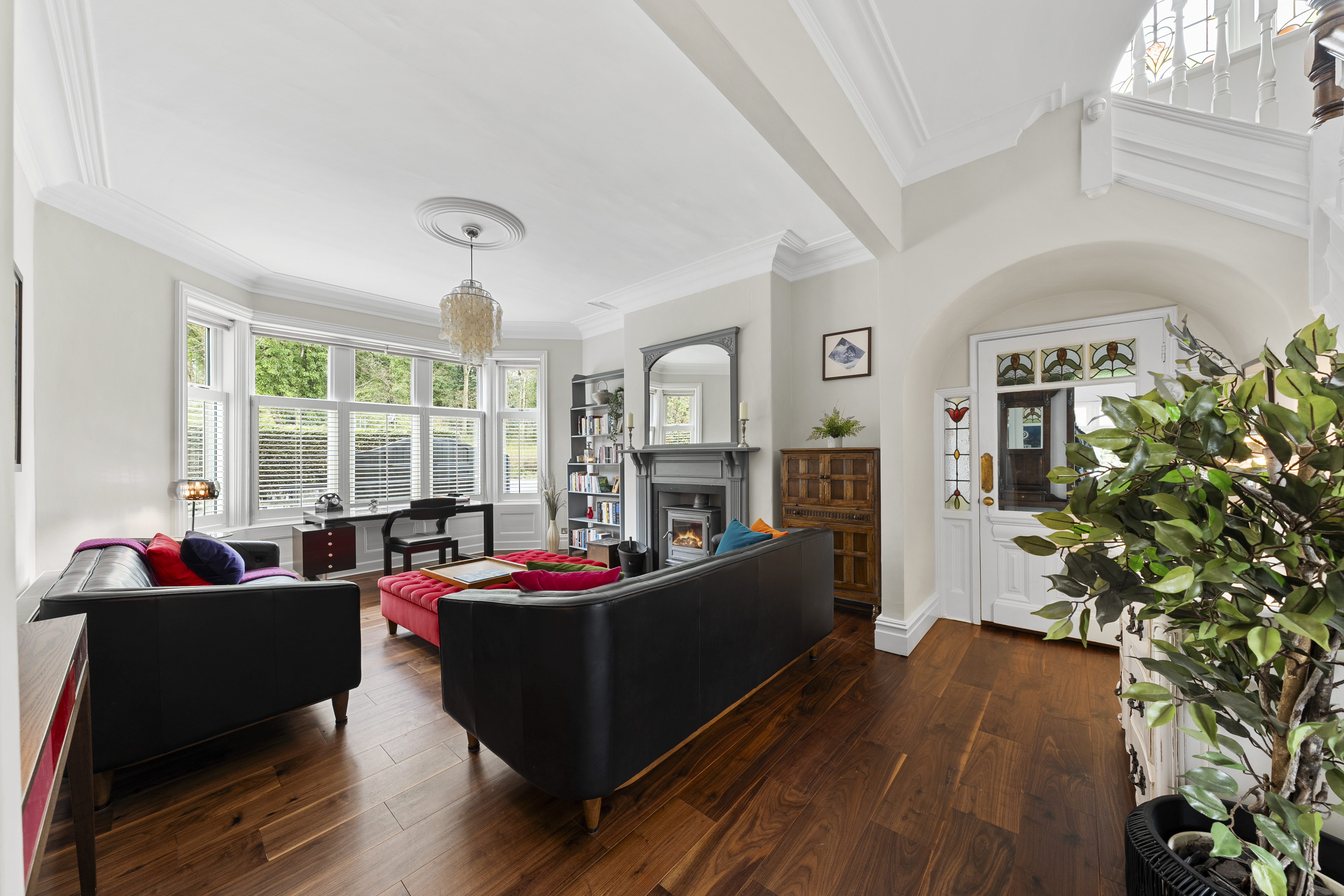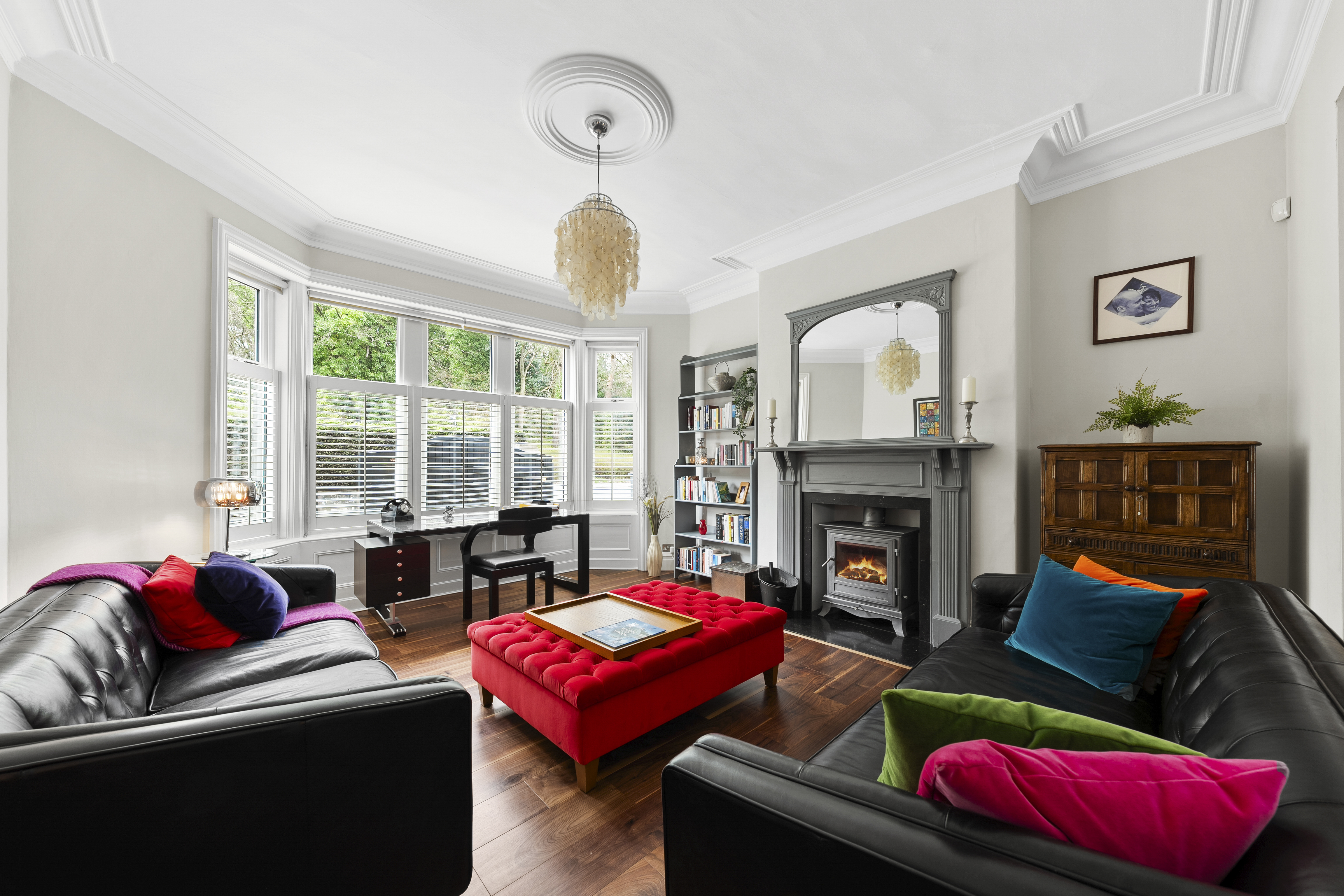 To the front elevation, two magnificent bay-fronted reception rooms provide beautifully proportioned formal living spaces. The sitting room and drawing room both feature elegant ceiling cornicing, period detailing and striking fireplaces, offering sophisticated yet welcoming areas for entertaining or relaxation.
