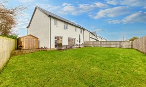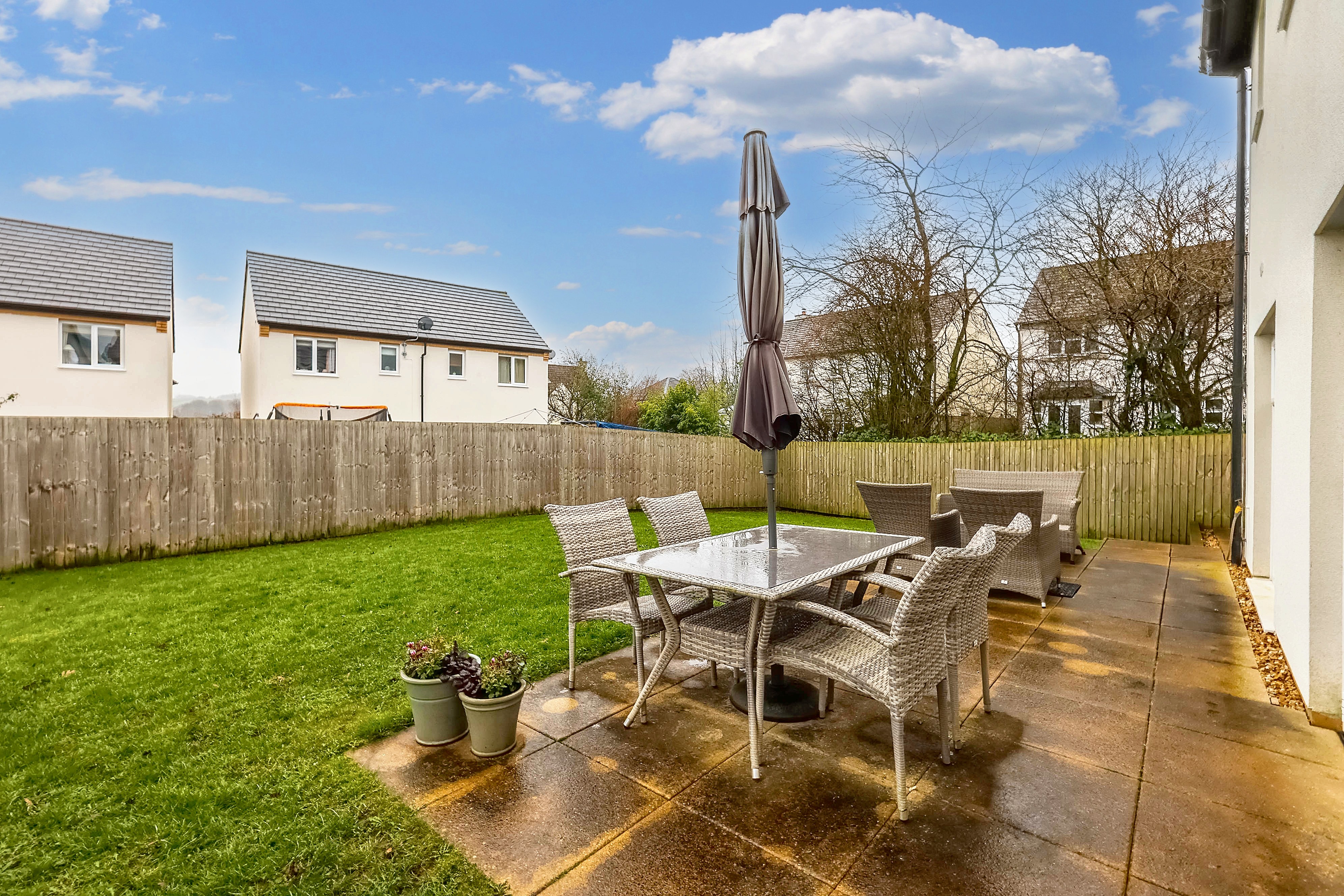Outside, the spacious rear garden features a well-kept lawn, a patio seating area, and a useful storage shed, creating a perfect area for outdoor dining or relaxation. To the front, the home enjoys an attractive lawn and pleasant views across open fields. A driveway provides parking for two cars and the property also includes a single garage for additional storage or parking.