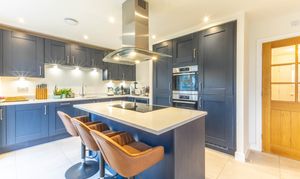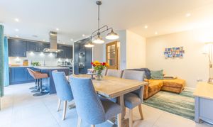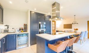 - Luxury modern kitchen boasting silestone worktops, a central island, dining space and an adjoining snug area, perfect for family living and entertaining