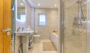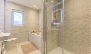 Upstairs, the property offers four generous double bedrooms, providing plenty of space for family or guests. Two of the bedrooms include contemporary en suite shower rooms, and three out of the four bedrooms also benefit from fitted wardrobes for added convenience. A modern four piece family bathroom serves the remaining bedrooms with a high quality finish.
