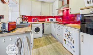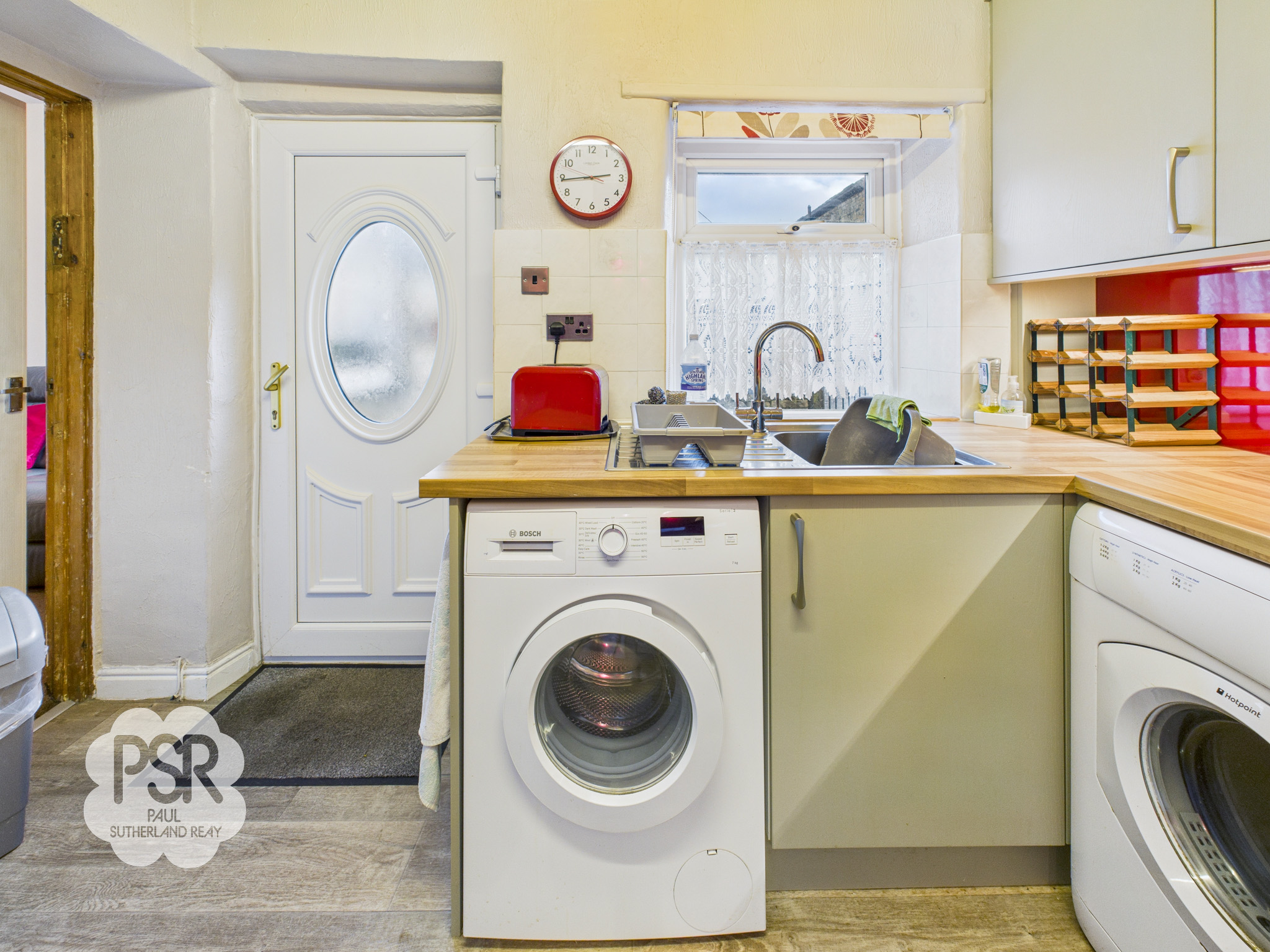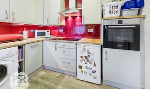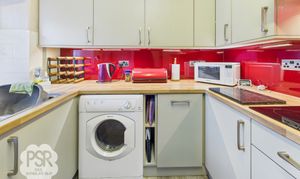 The kitchen is fitted with a range of grey wall and base units complemented by wood-effect laminate worktops and a stainless-steel sink with a mixer tap. High-quality appliances include an integrated BOSCH fan oven and grill, a halogen hob with a stainless-steel extractor over, and a striking red splashback. There is dedicated space for a washing machine, separate dryer, and fridge freezer. The room is finished with oak-effect linoleum flooring, a radiator, and a UPVC door and window to the side aspect.