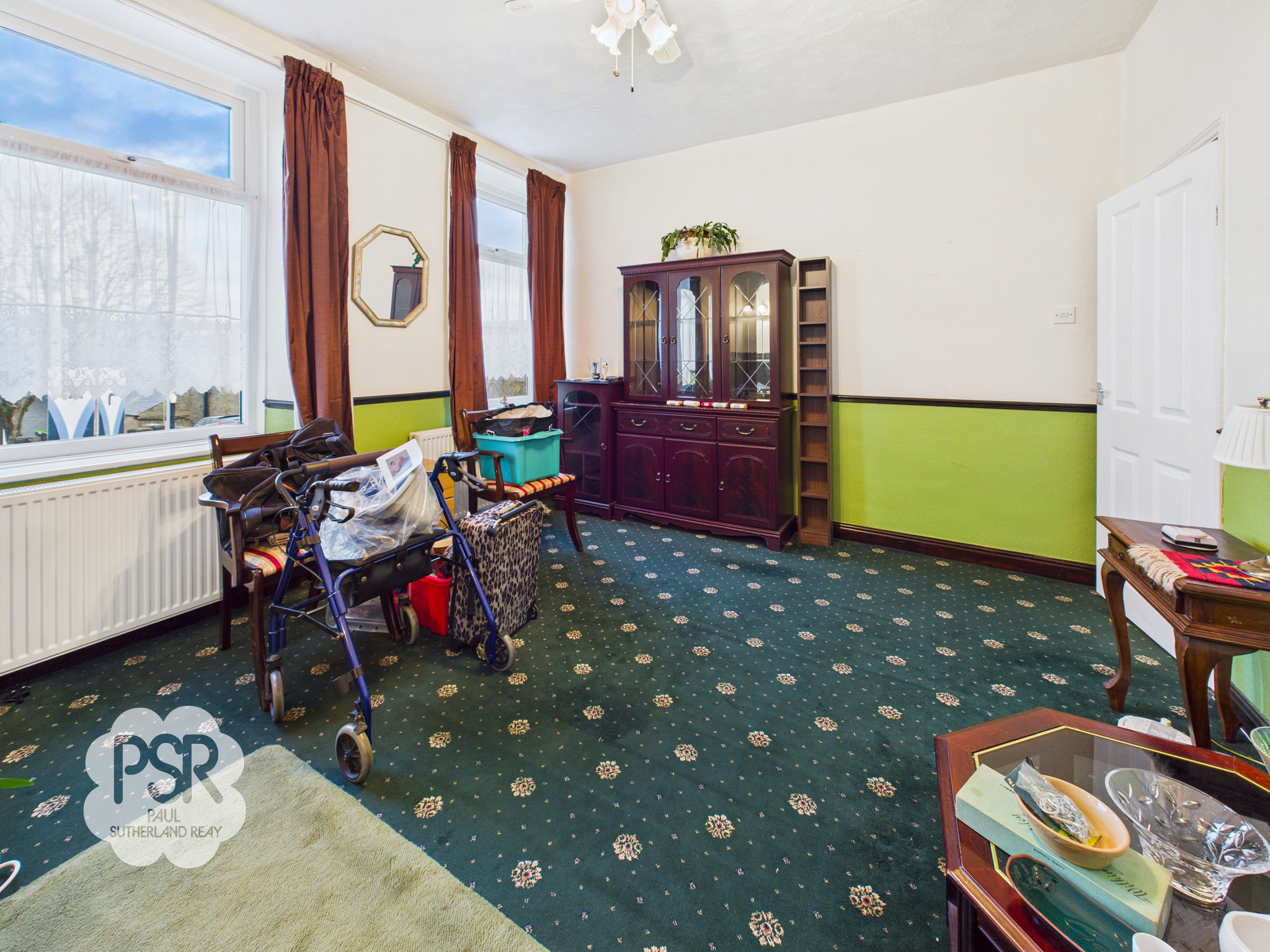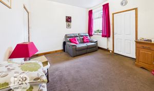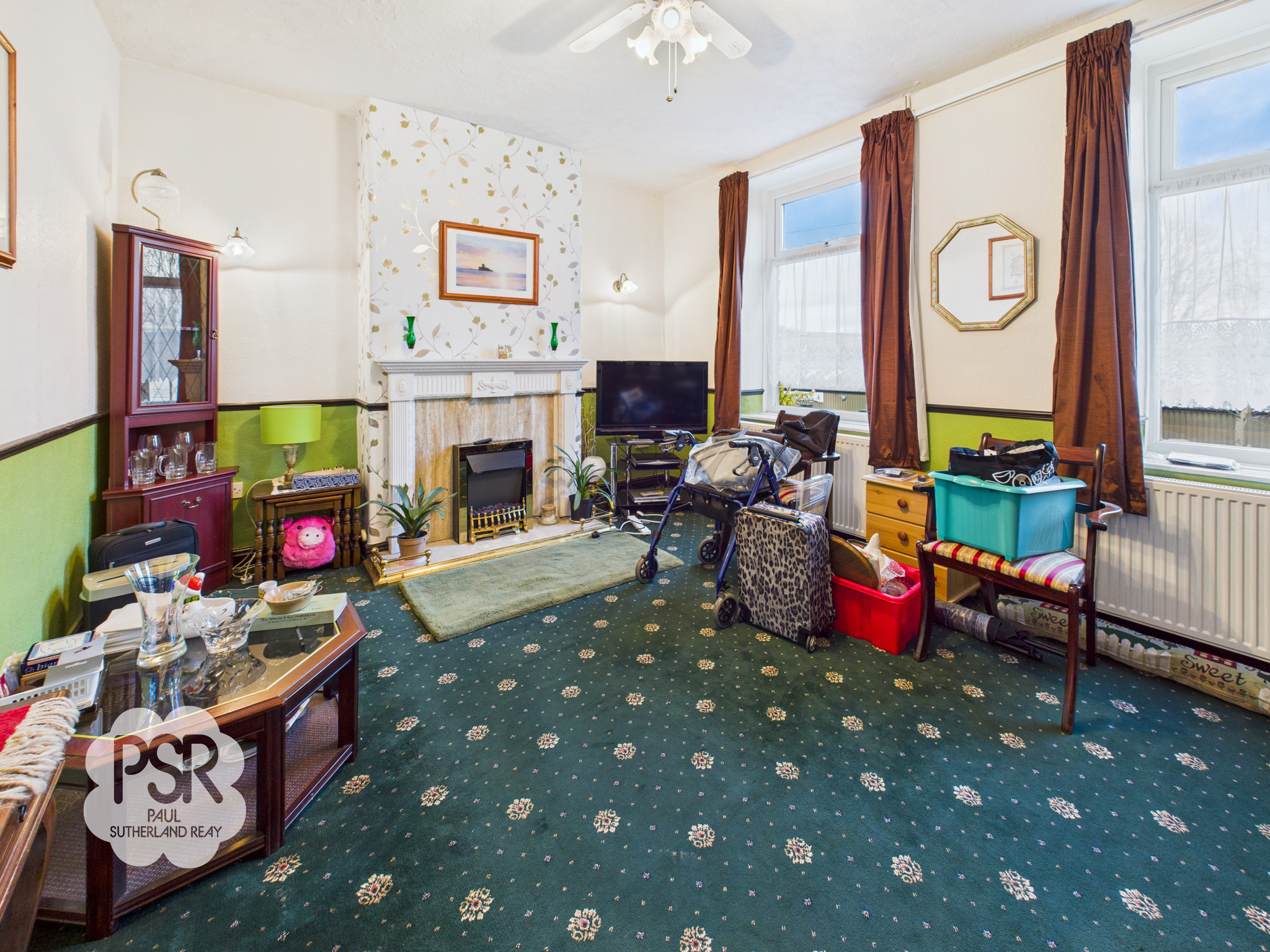 This bright and welcoming space features two UPVC windows to the front elevation, allowing for plenty of natural light. The room’s focal point is a feature fireplace with a marble surround, currently fitted with an electric real-flame effect heater. The lounge is finished with carpeted flooring, two radiators, and a central fan light fitting.