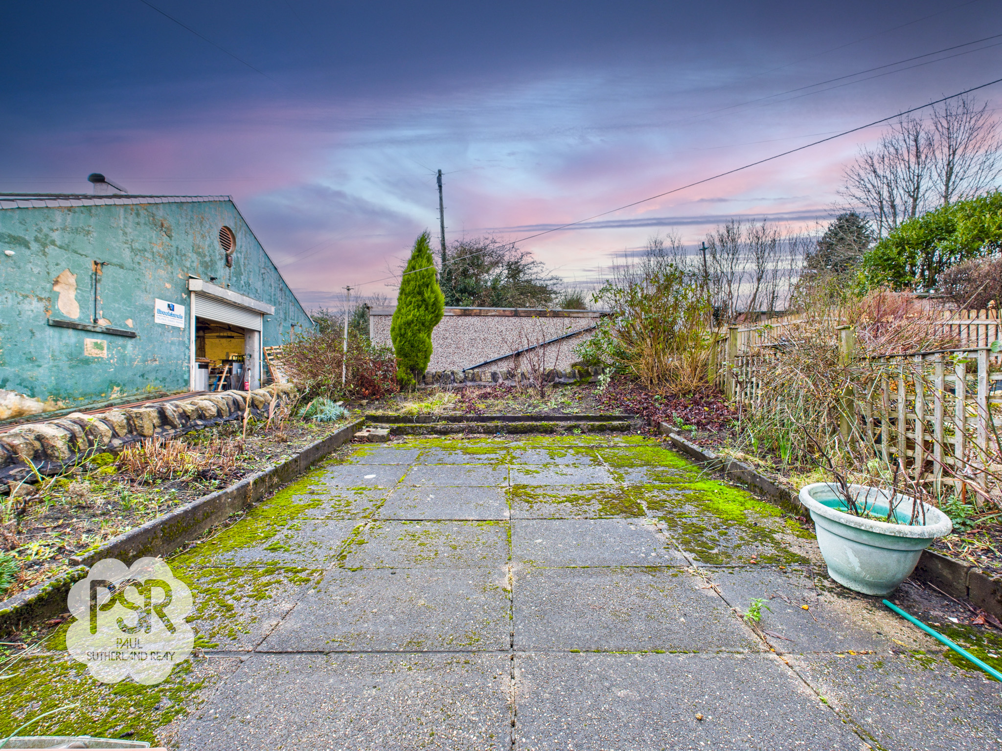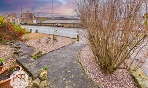 Outside, the property boasts a thoughtfully designed, tiered rear garden that maximises both space and ease of maintenance. The upper level features a large, paved patio area, perfect for outdoor dining or entertaining, bordered by attractive stone walling and timber fencing for privacy. Steps descend to further landscaped borders, where decorative stone walls and established planting add character and colour throughout the seasons. At the top of the garden, twin garages provide secure parking for two vehicles and are accessed via a private track to the side of the property. The front garden also prioritises low maintenance, with decorative gravel beds and mature shrubbery creating an appealing first impression. A paved pathway leads to the main entrance, flanked by a charming low-level stone wall that enhances the property’s kerb appeal. This outdoor space is ideal for those seeking a blend of practicality and style, with plenty of room for relaxing, gardening or entertaining guests.