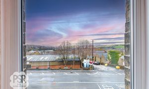 A standout feature of this room is the UPVC window to the front aspect, offering exceptional views over New Mills and the Sett Valley toward Kinder Scout. The space benefits from built-in wardrobes with overhead storage, finished with carpeted flooring and a radiator.