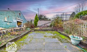 The property features a tiered rear garden designed for ease of maintenance. The upper level consists of a large paved patio area, ideal for outdoor seating, bordered by stone walling and timber fencing. Steps lead down toward the property, where further planted borders and decorative stone walls add character to the space.