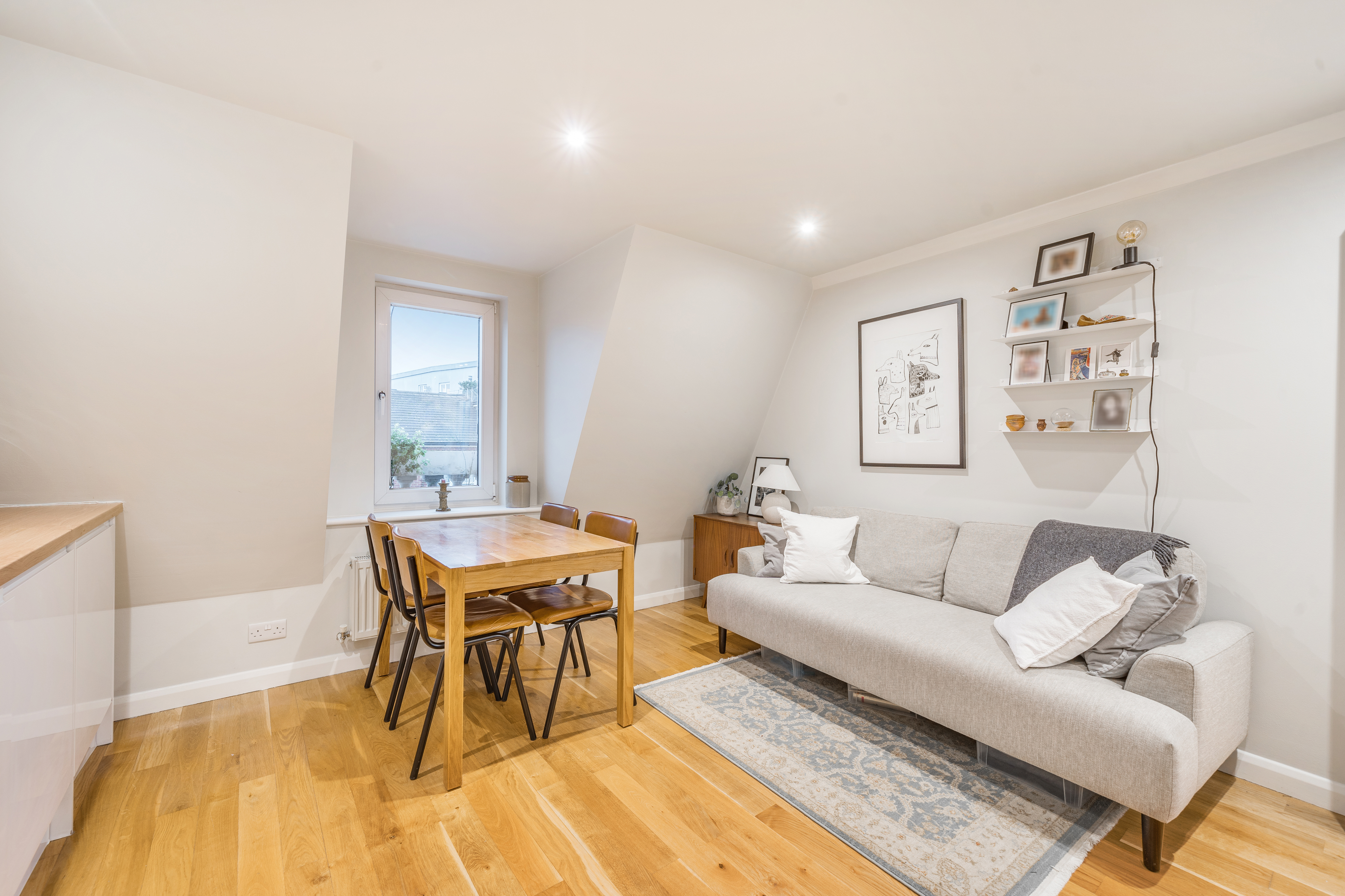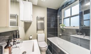Additional highlights include decorative shelving in the living area for added storage and display, recessed lighting that enhances the flat’s contemporary feel, and neutral decor that complements any style of furnishings. The elegant Victorian architecture of the building, with detailed brickwork and ornate window designs, adds a touch of historic character to the property. With its harmonious blend of modern features and period elegance, this property is perfectly suited for professionals, couples, or individuals.