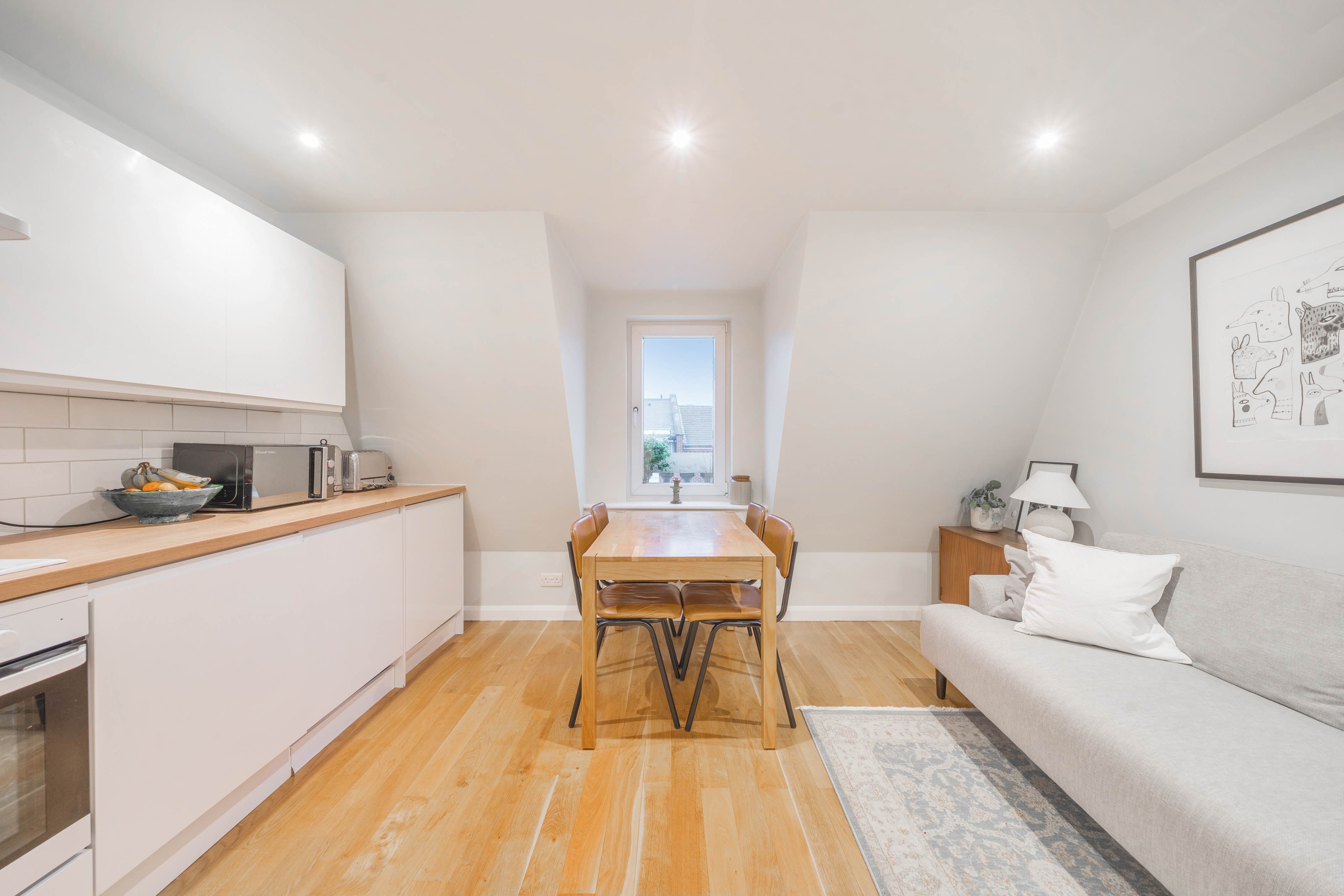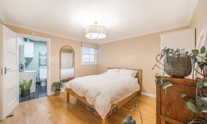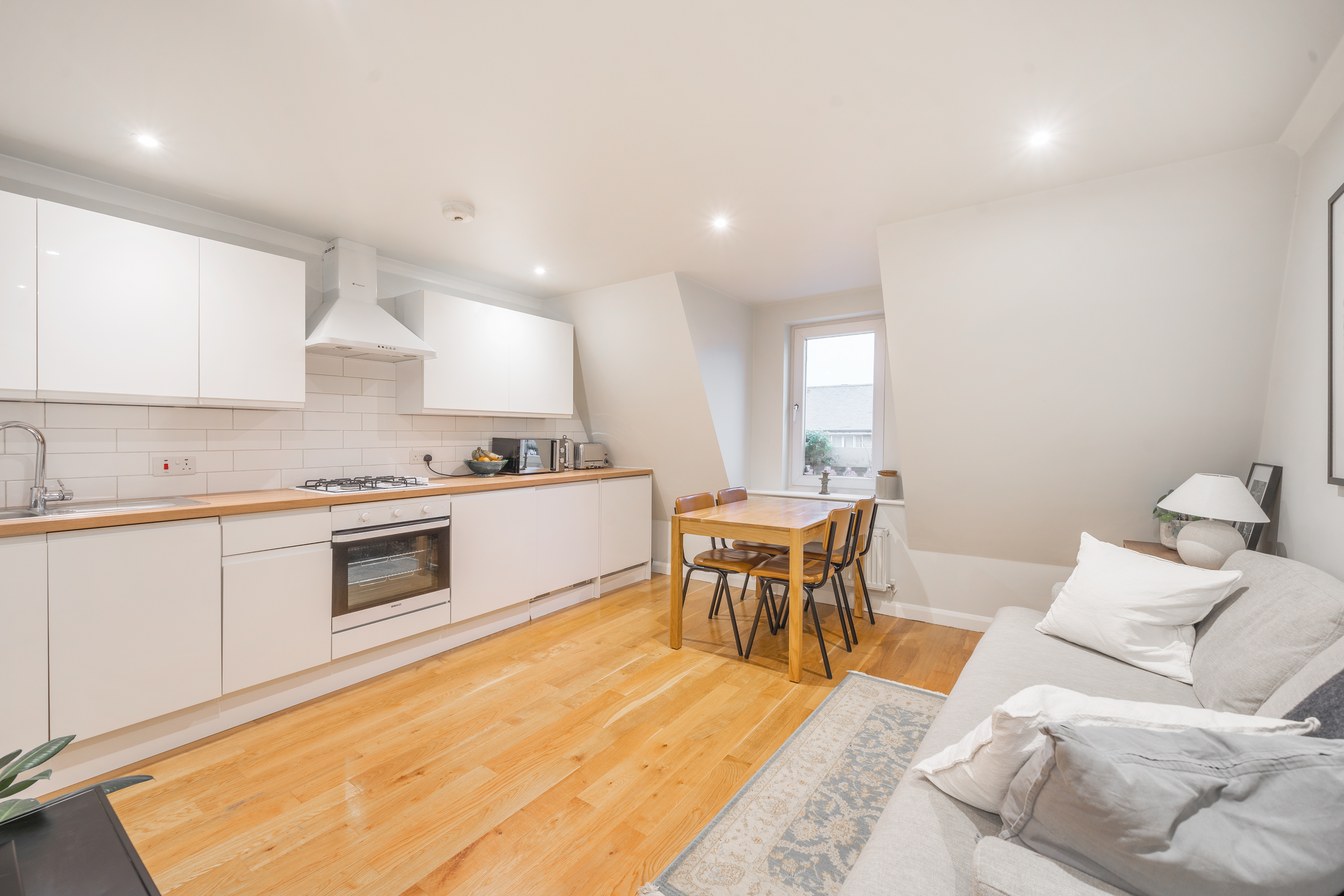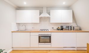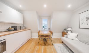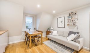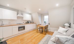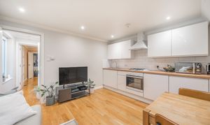 This beautifully presented one-bedroom flat combines contemporary design with period charm, offering a bright and spacious living environment ideal for modern lifestyles. The flat boasts a generous open plan kitchen and living area, featuring sleek white cabinetry, integrated appliances, and elegant wooden flooring throughout. Large windows flood the living space and bedroom with natural light, creating a warm and welcoming atmosphere.