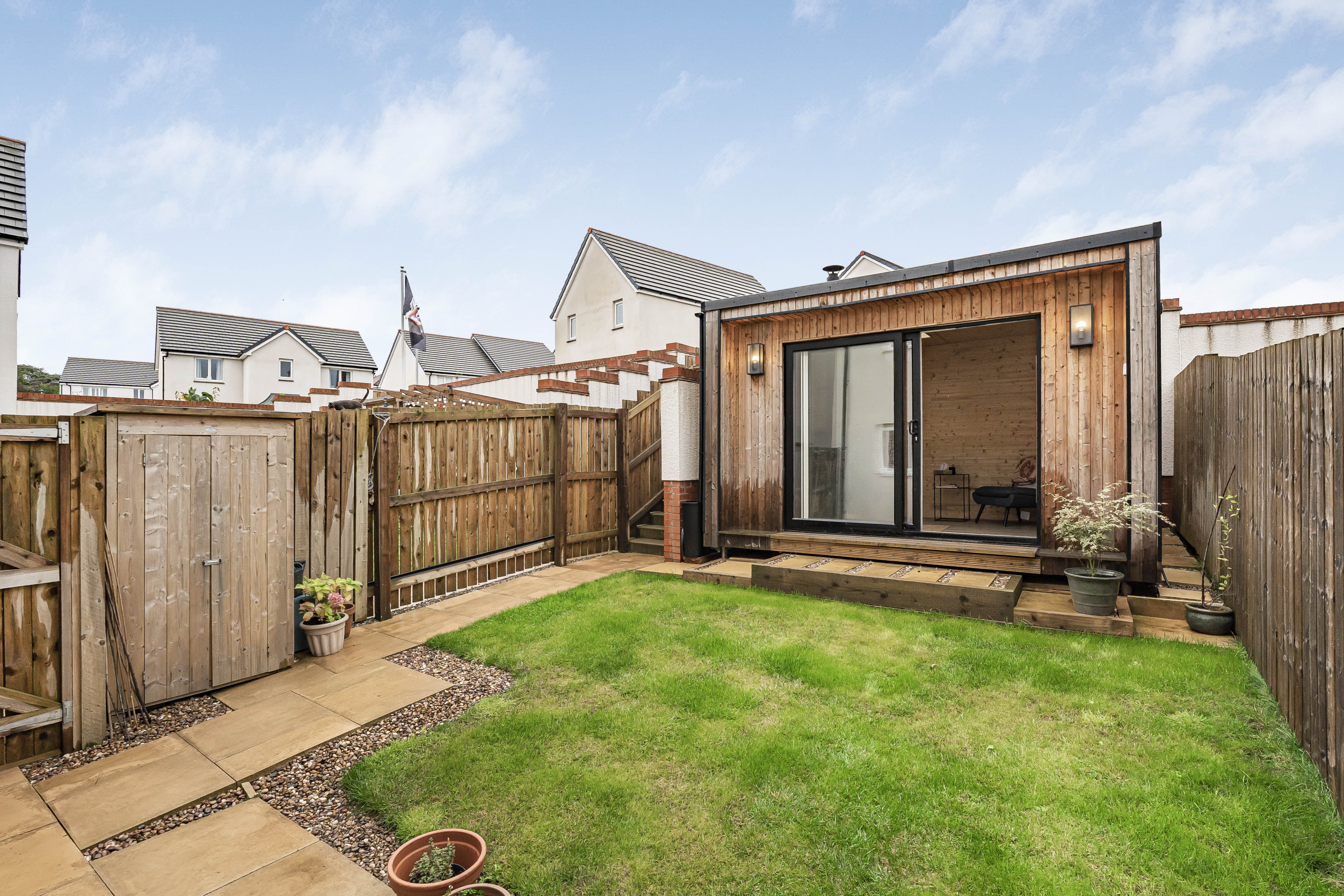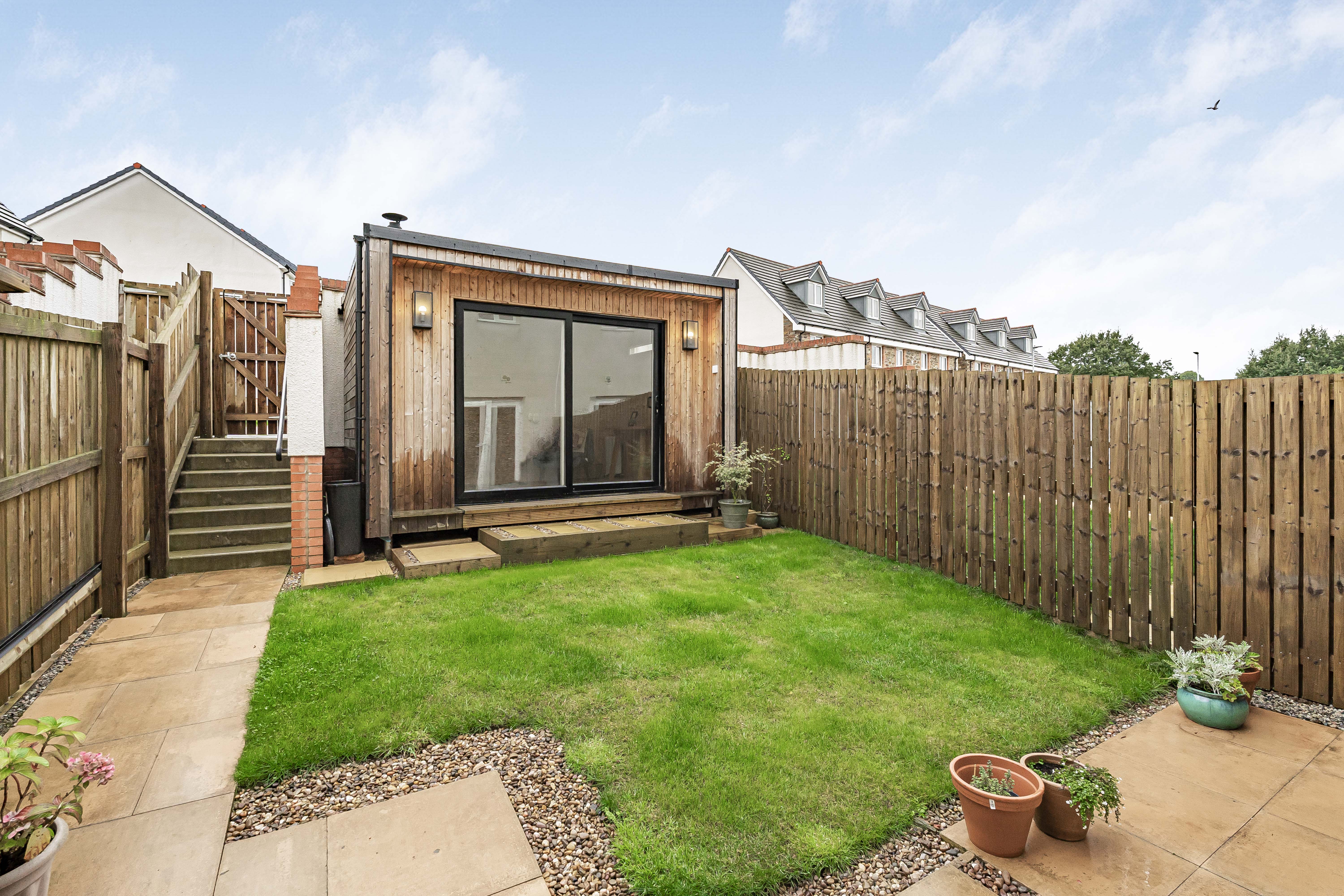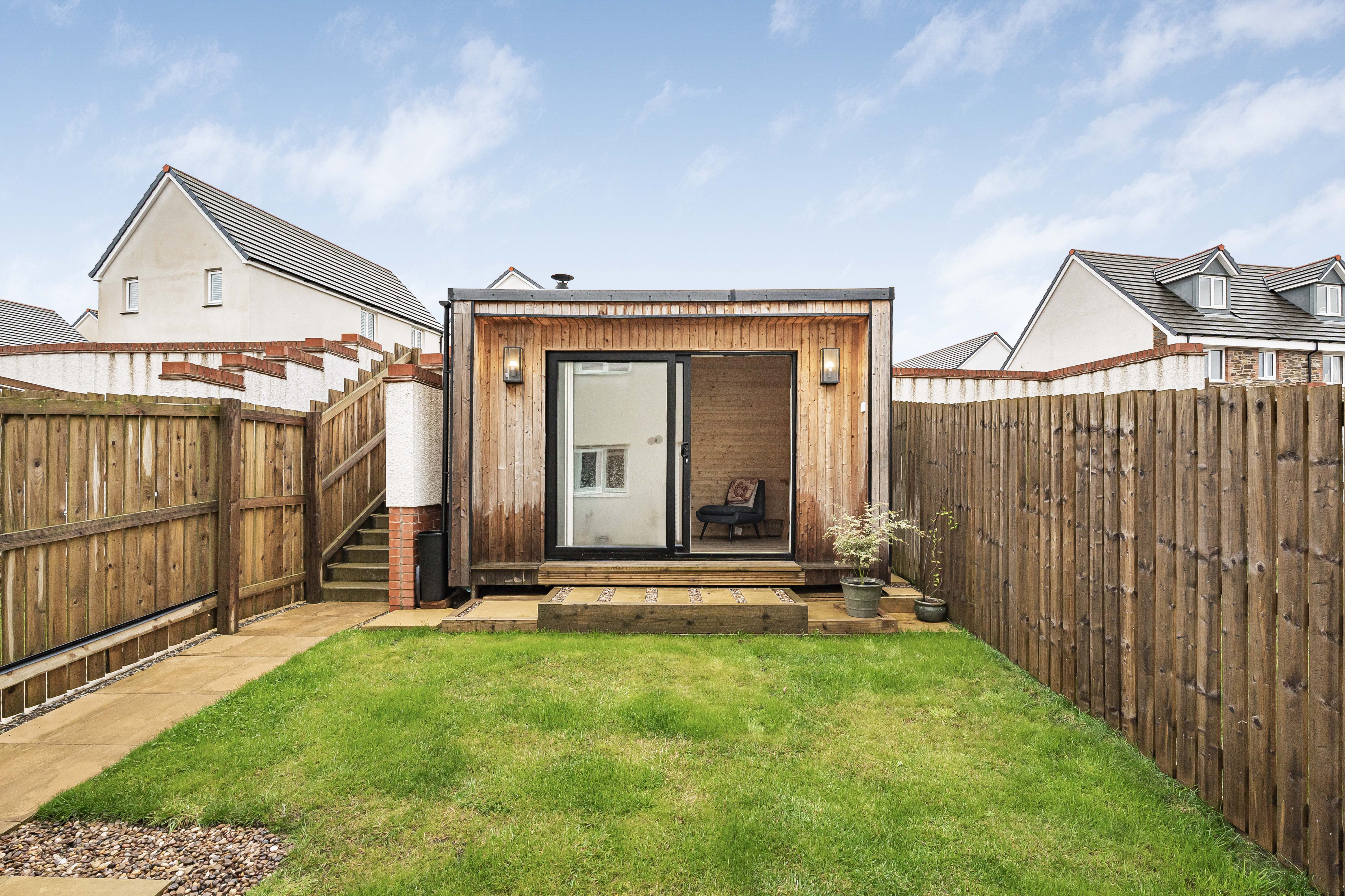 The rear garden is of a generous size, landscaped garden laid to lawn with paved seating area outside of the dining area. Path and steps up to the beautiful contemporary insulated garden room with log burner, light and power. A fantastic addition great for anyone looking to work from hone.