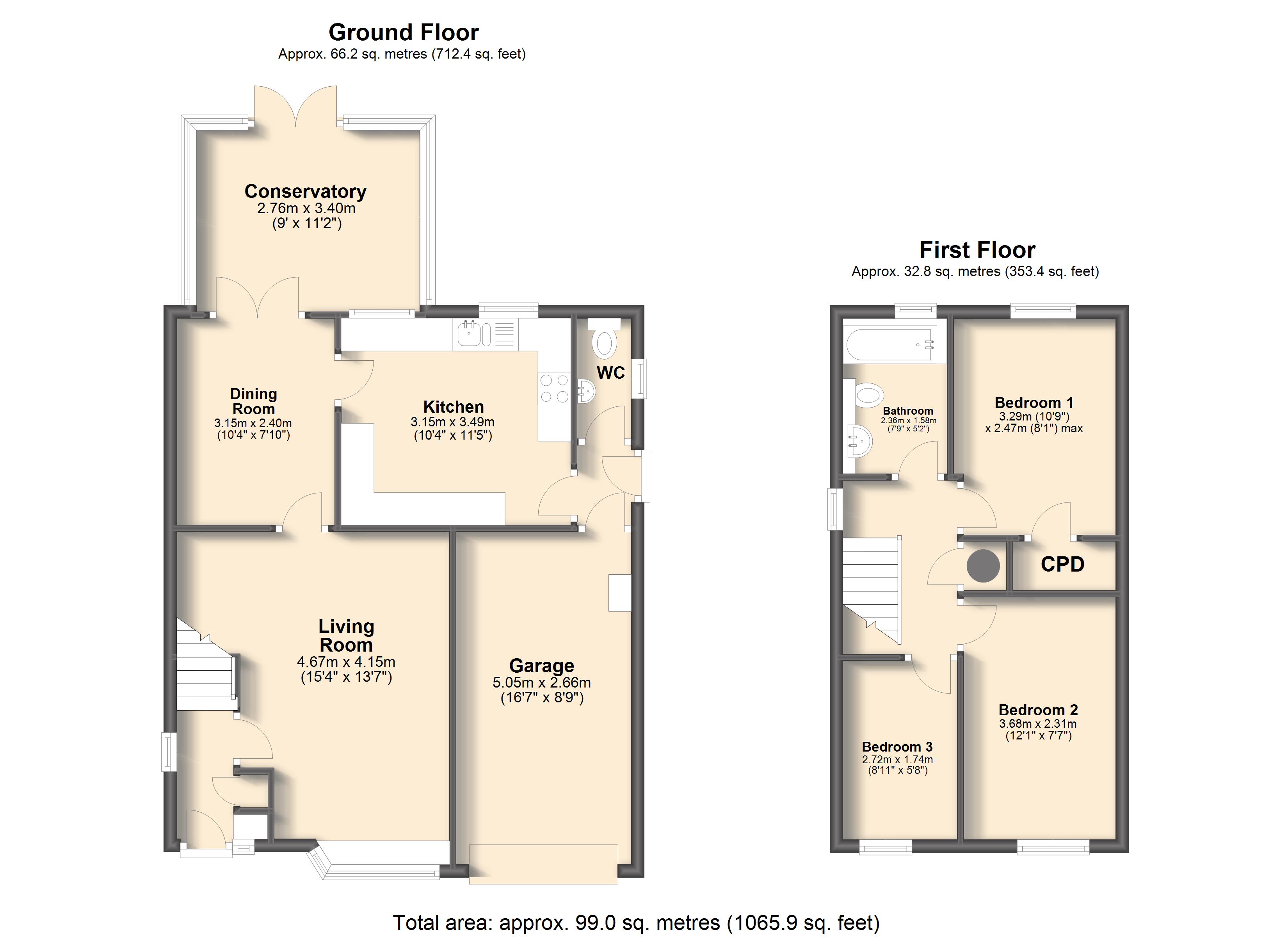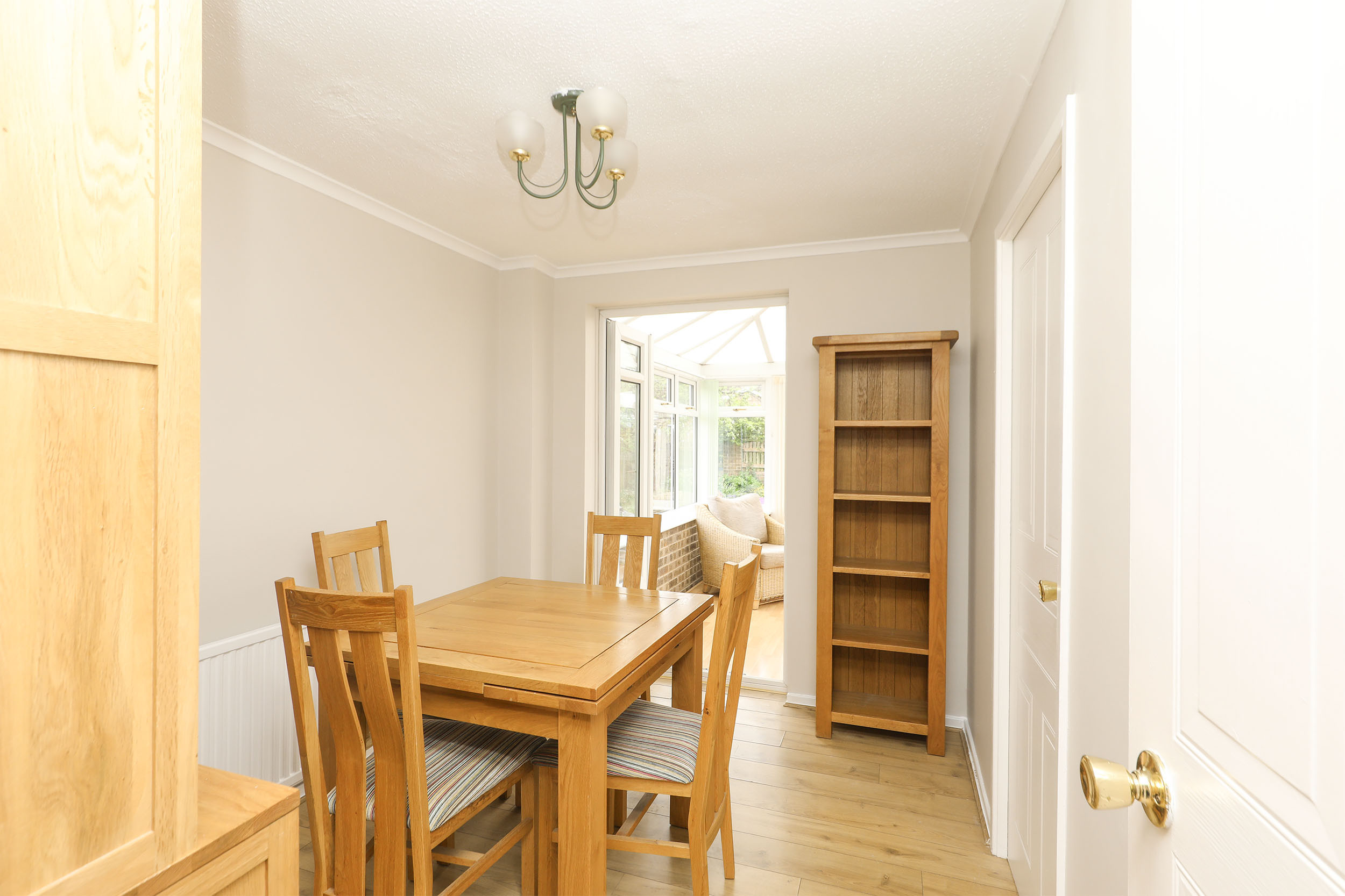 The ground floor is well arranged to suit modern living, beginning with a generously sized bay-windowed living room, providing a well-proportioned reception space. A separate dining room offers an ideal setting for family meals and entertaining, with doors opening into a light and airy conservatory that overlooks the rear garden. The property also benefits from a spacious fitted kitchen, offering ample storage and workspace, alongside a convenient ground floor W.C.