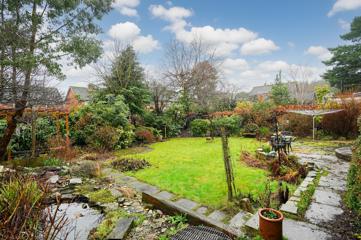 Generous landscaped garden with patio, seating area, lawn and an ornamental pond.