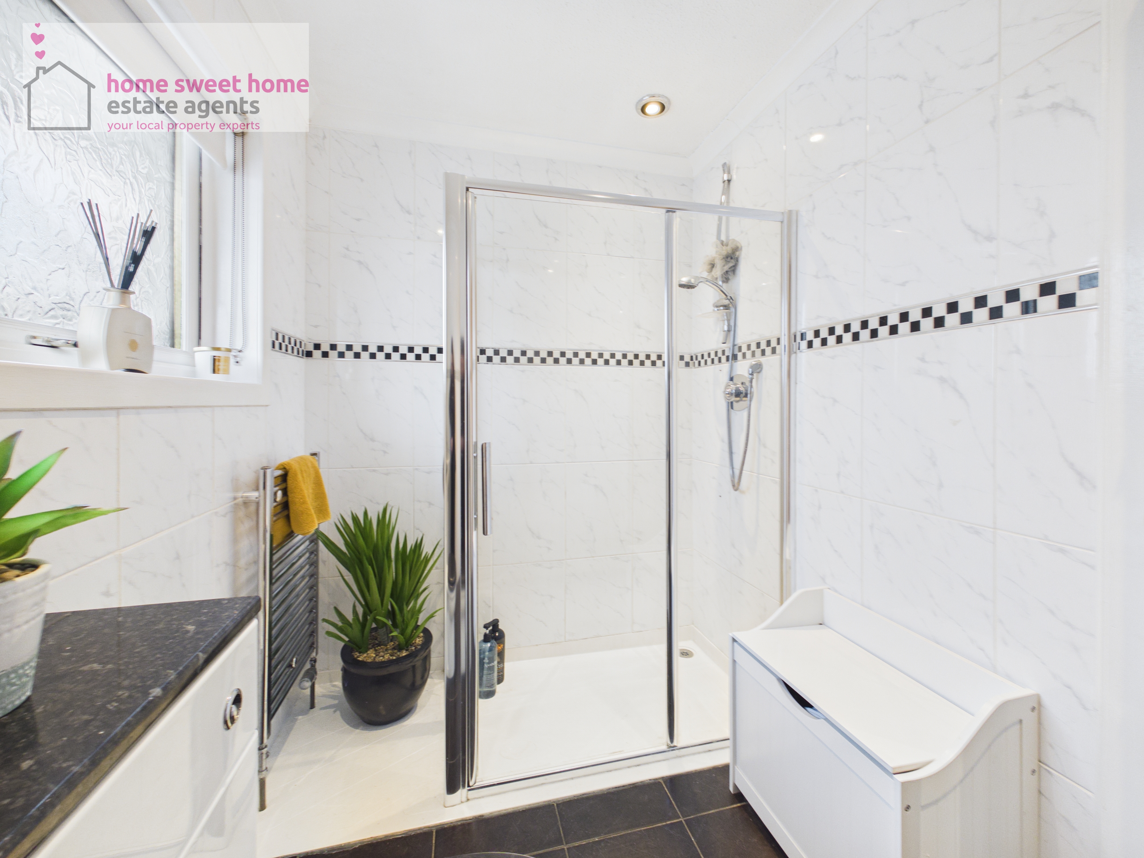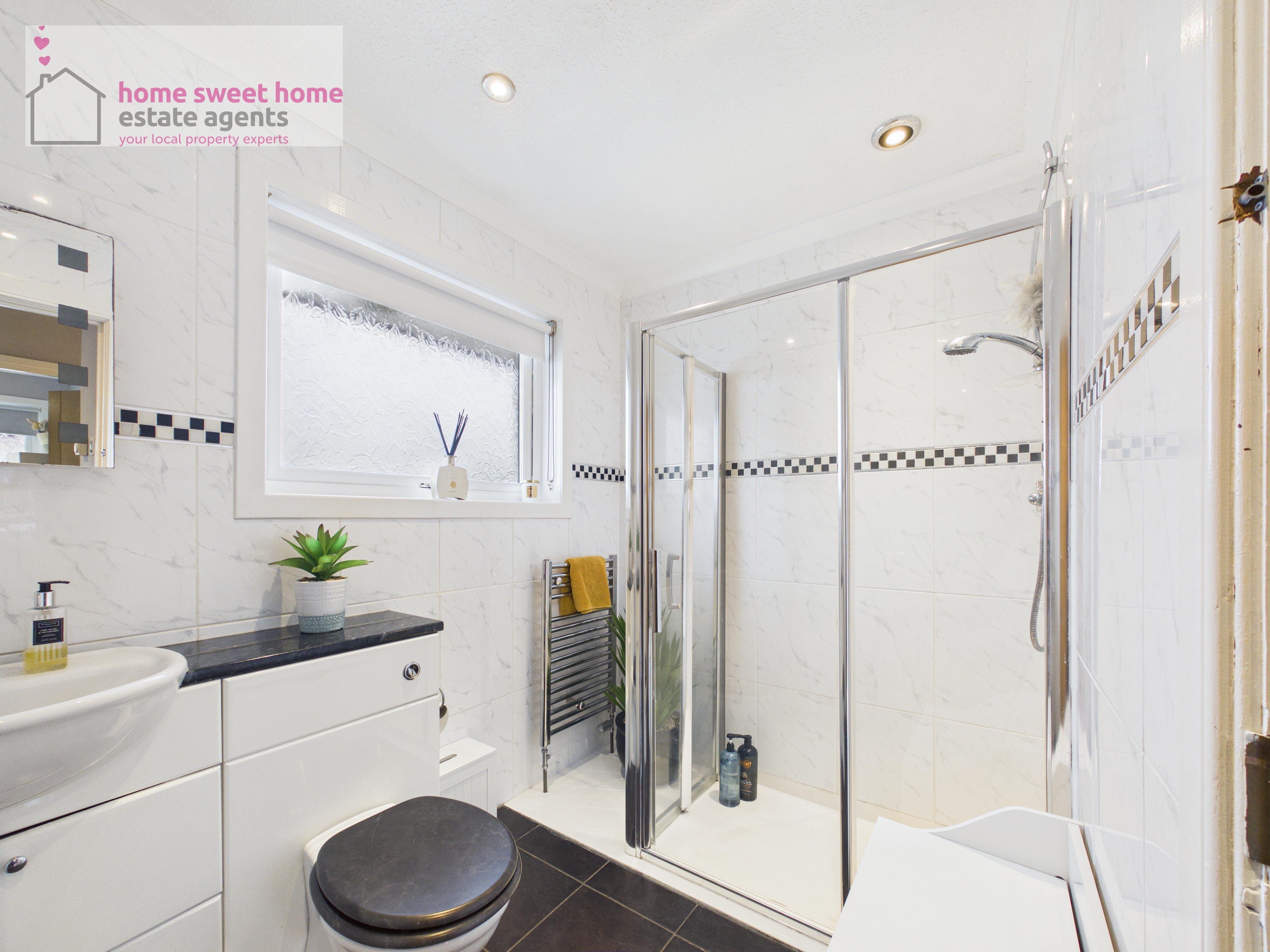 The accommodation comprises three well-proportioned bedrooms, each benefiting from excellent natural light and offering flexible living options. A modern shower room, finished to a high standard with quality fixtures and fittings, completes the internal layout.