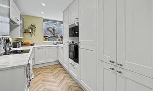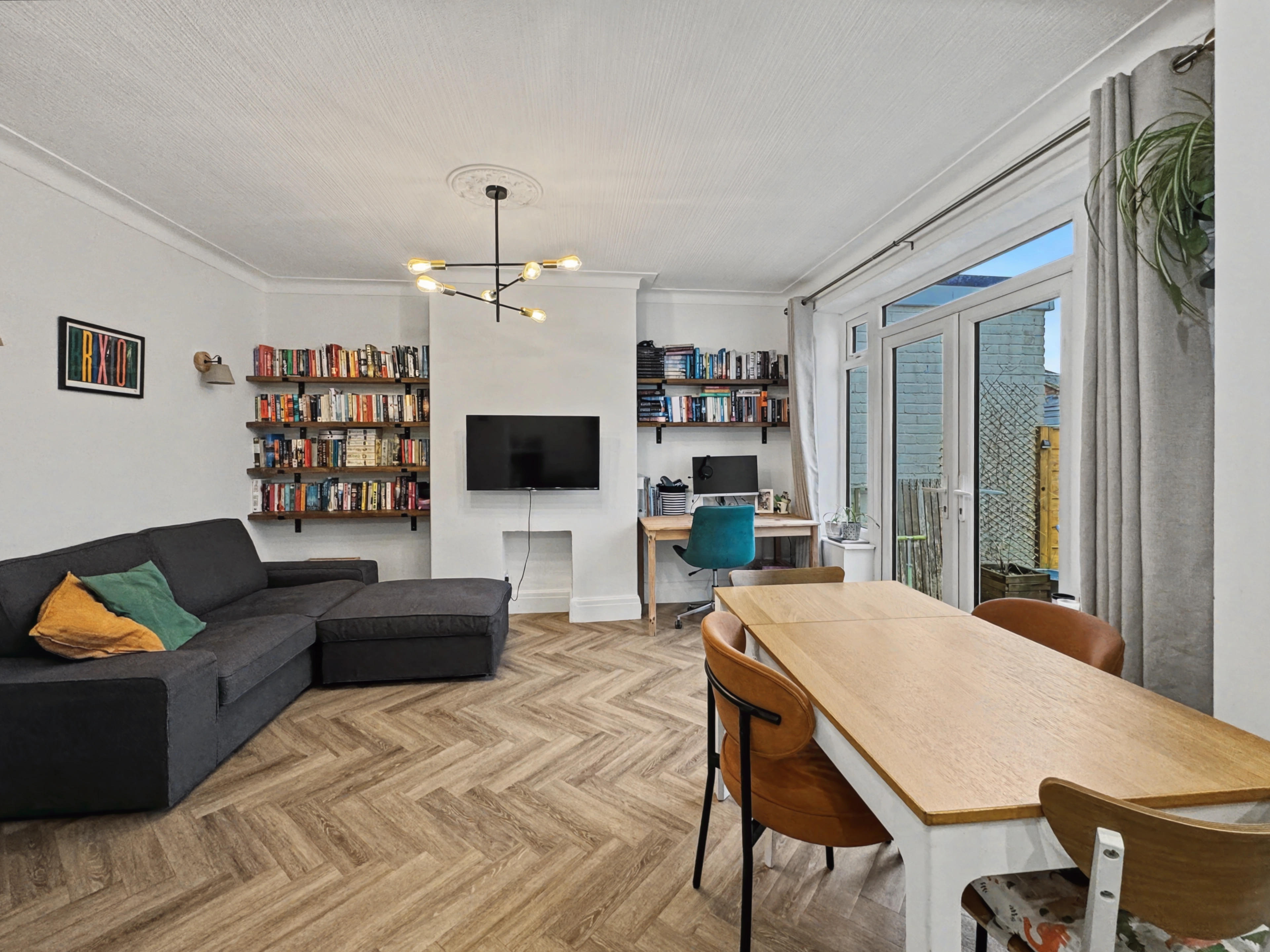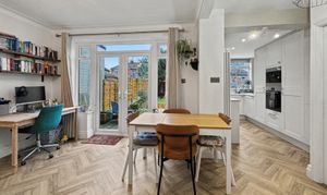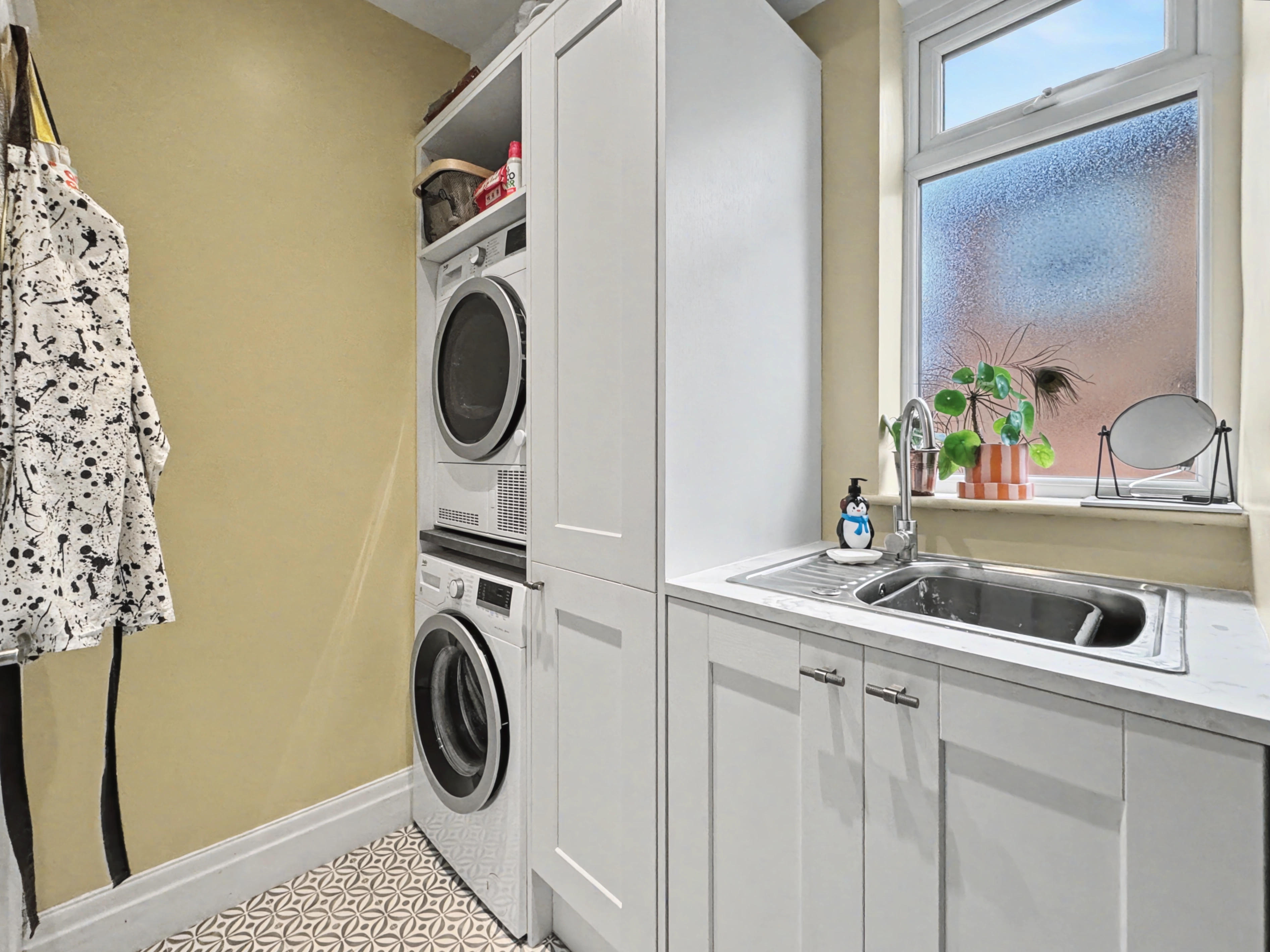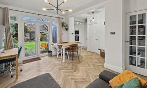 To the rear, the current owners have created an impressive open-plan kitchen, dining and living area, ideal for both everyday living and entertaining. The modern kitchen is fitted with a range of integrated appliances and enjoys direct access to the rear garden. Completing the ground floor is a separate utility room with a convenient WC.