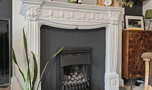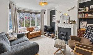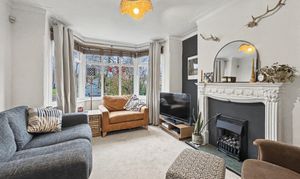 Set back from the road, the property benefits from a substantial driveway providing off-road parking for multiple vehicles. A welcoming porch leads into the entrance hallway, which in turn opens to a bright front lounge featuring high ceilings and an attractive focal fireplace, creating a warm and inviting space to relax.