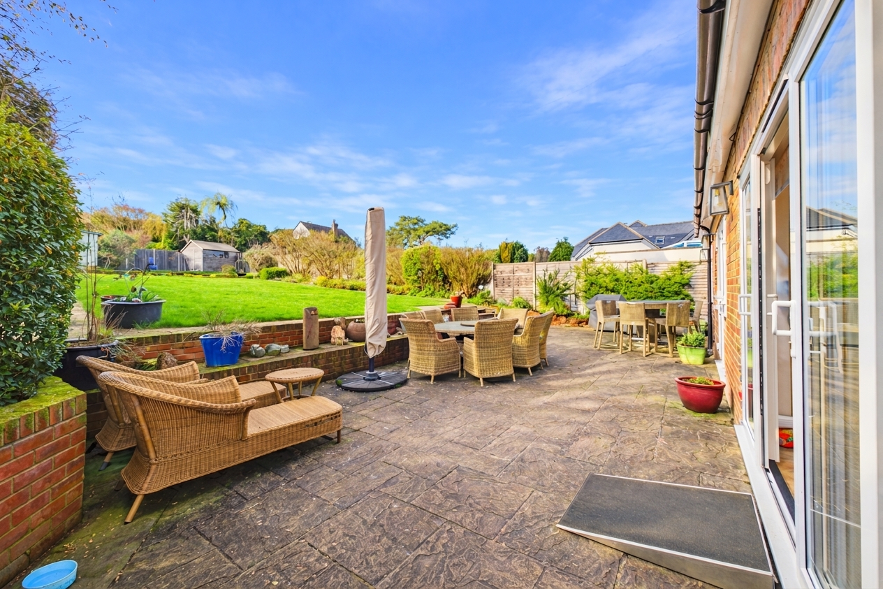 Bright and generously proportioned, the lounge is a superb living space finished with oak flooring and neutral decor. Two sets of patio doors open directly onto a spacious patio overlooking the west facing garden, allowing the room to fill with natural light and creating a lovely connection between the house and garden. It is an ideal space for both relaxing and entertaining.