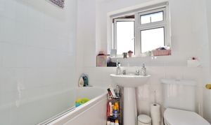 The modern bathroom comprises a panel enclosed bath with shower and screen over, wash hand basin, WC, tiling to principal areas and a window to the rear.