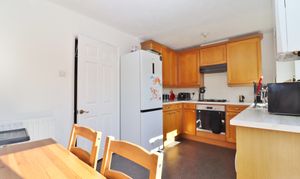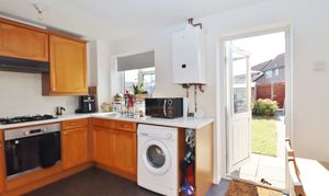 The kitchen/diner has a window to the rear, a door leading out to the garden and has been fitted with a matching range of wall and base units with a built-in oven and gas hob with extractor over, as well as appliance space for a free-standing fridge/freezer and washing machine.