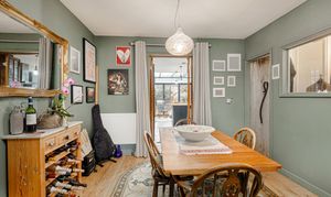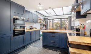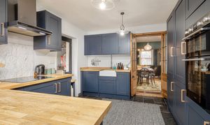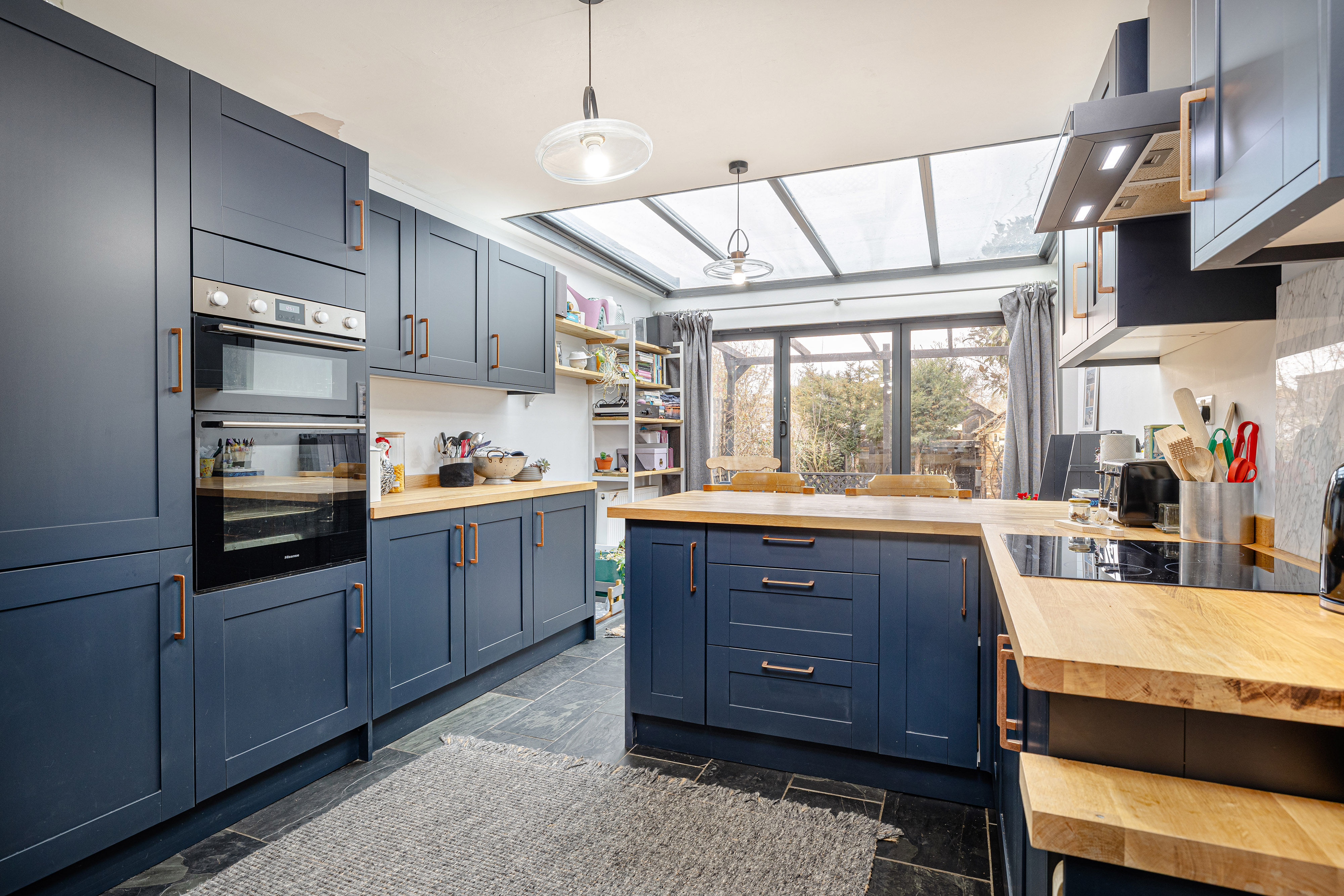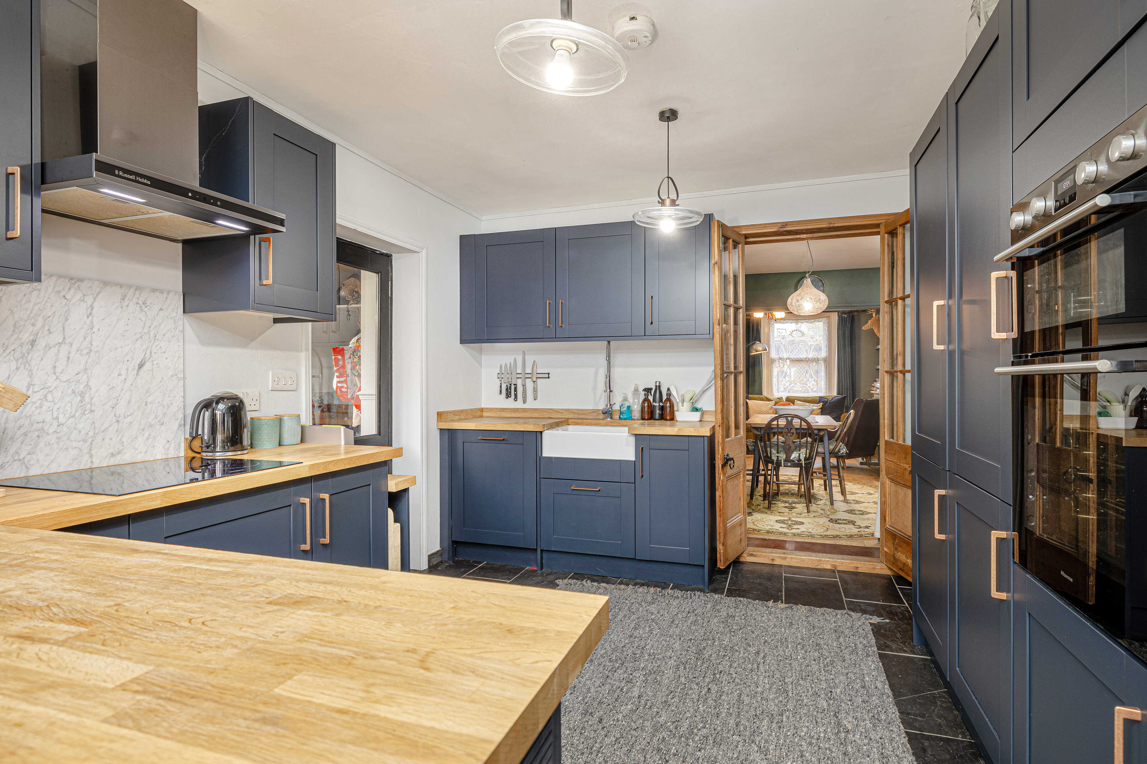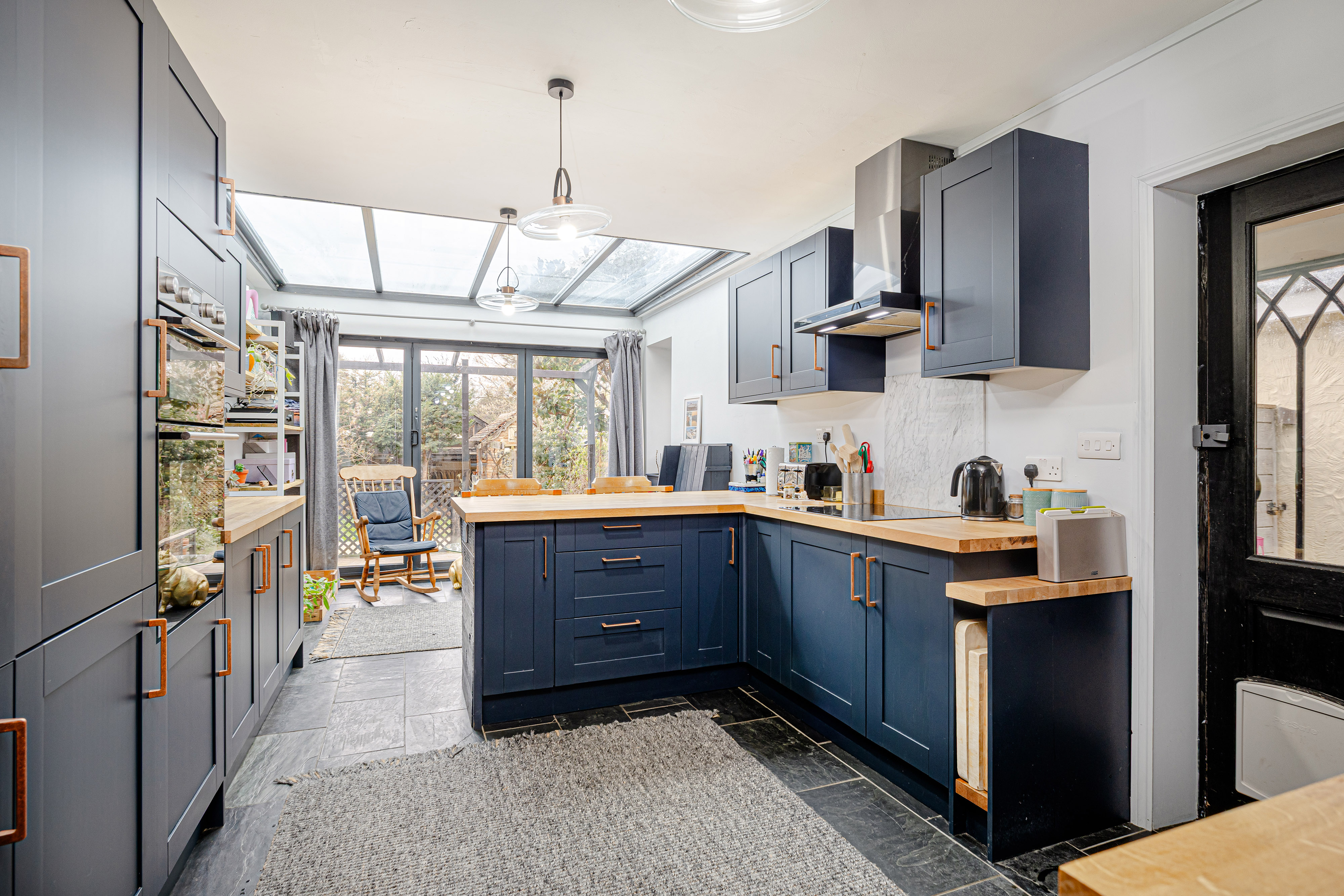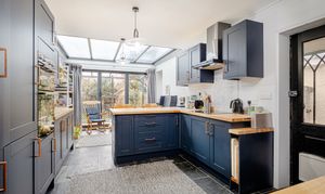 Extending to approximately 1,467 sq ft in total, the property opens into a welcoming entrance hall with a charming sitting room to the front, complete with bespoke shelving, a feature fireplace and an inviting feel. A separate dining room sits beyond and creates an excellent space for entertaining, linking naturally through to the beautifully updated kitchen/breakfast room at the rear. Fitted with striking navy cabinetry, wooden worktops, integrated appliances and a breakfast bar, the kitchen is flooded with natural light from the glazed roof section and rear bi-folding doors, while a separate utility room provides additional practicality.