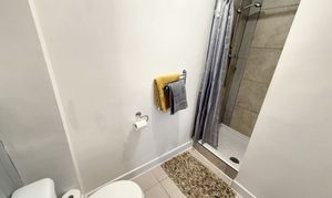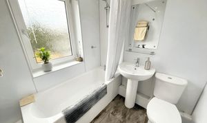 The family bathroom is finished in a contemporary style, featuring a three-piece suite.