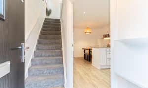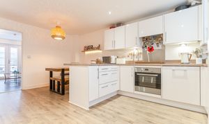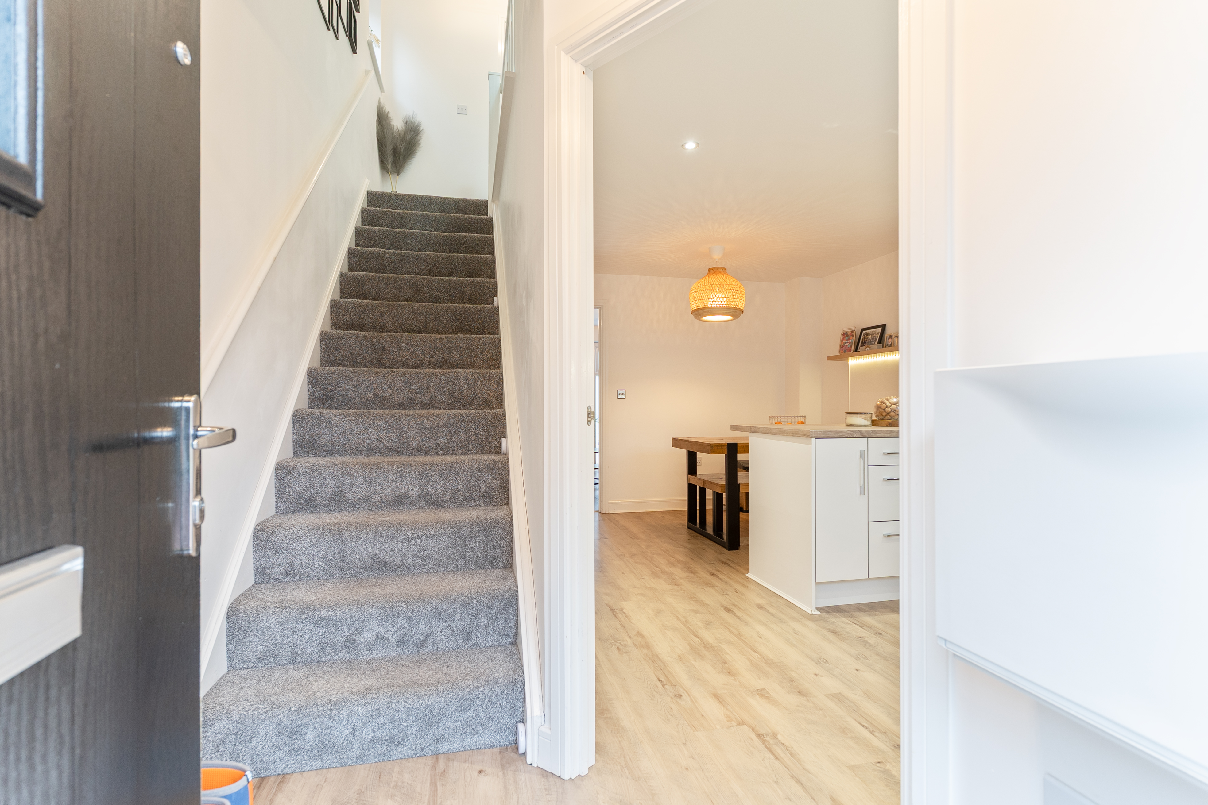 You enter the property through a welcoming entrance hall, which provides access to the kitchen/diner and stairs leading to the first floor. The kitchen/diner is bright, modern, and well-designed, featuring a good-sized fitted kitchen with ample storage and worktop space. There is plenty of room for a dining table and chairs, making it the perfect spot for family meals or entertaining guests. From the dining area, there is access to a convenient cloakroom fitted with a WC and hand basin, as well as a doorway leading through to the living room. The spacious lounge is beautifully presented, offering a comfortable and versatile space for relaxing. Large patio doors open directly onto the rear garden, allowing natural light to flood the room and creating a seamless connection between indoor and outdoor living.