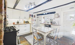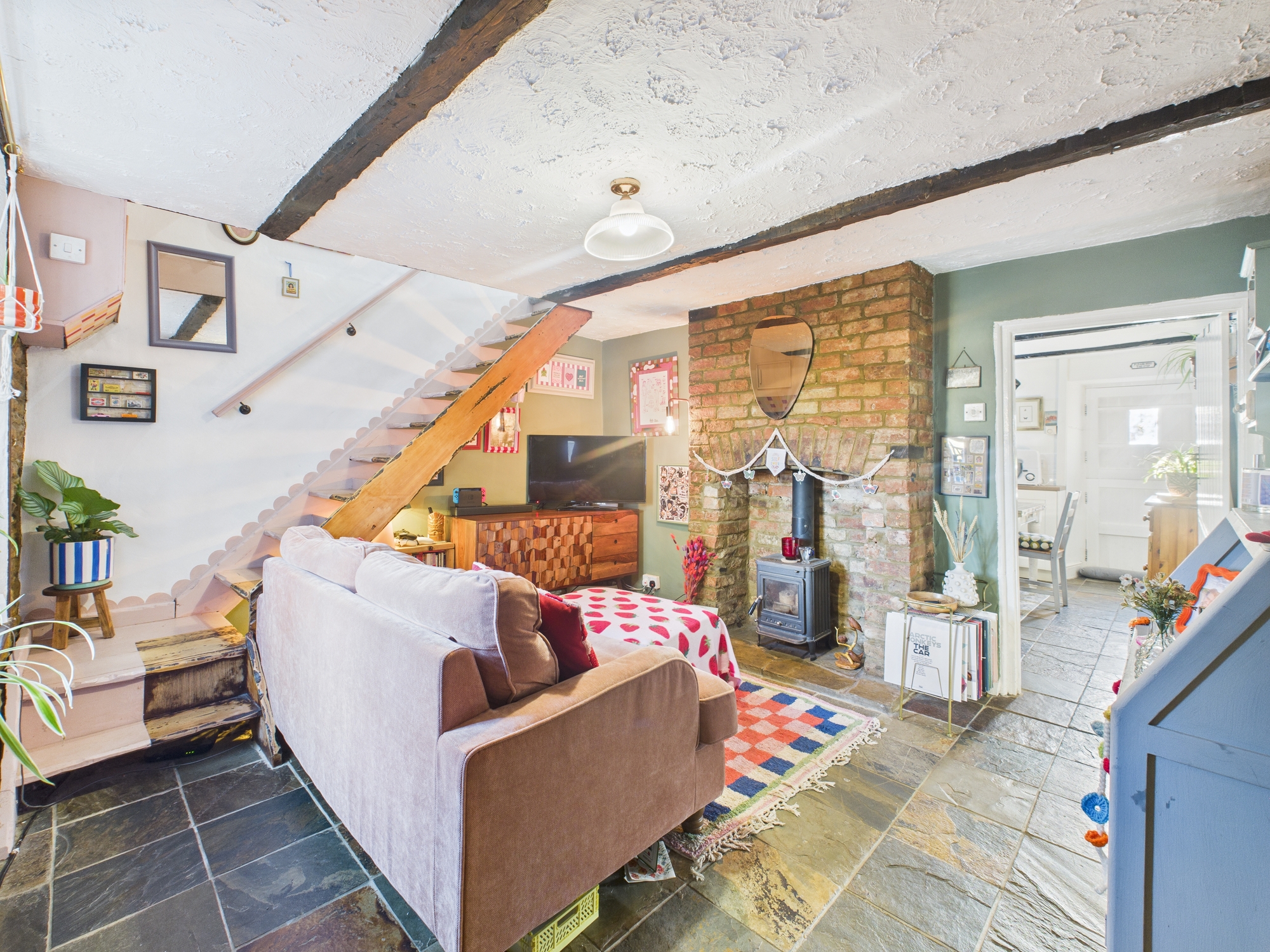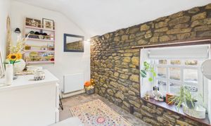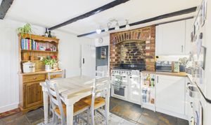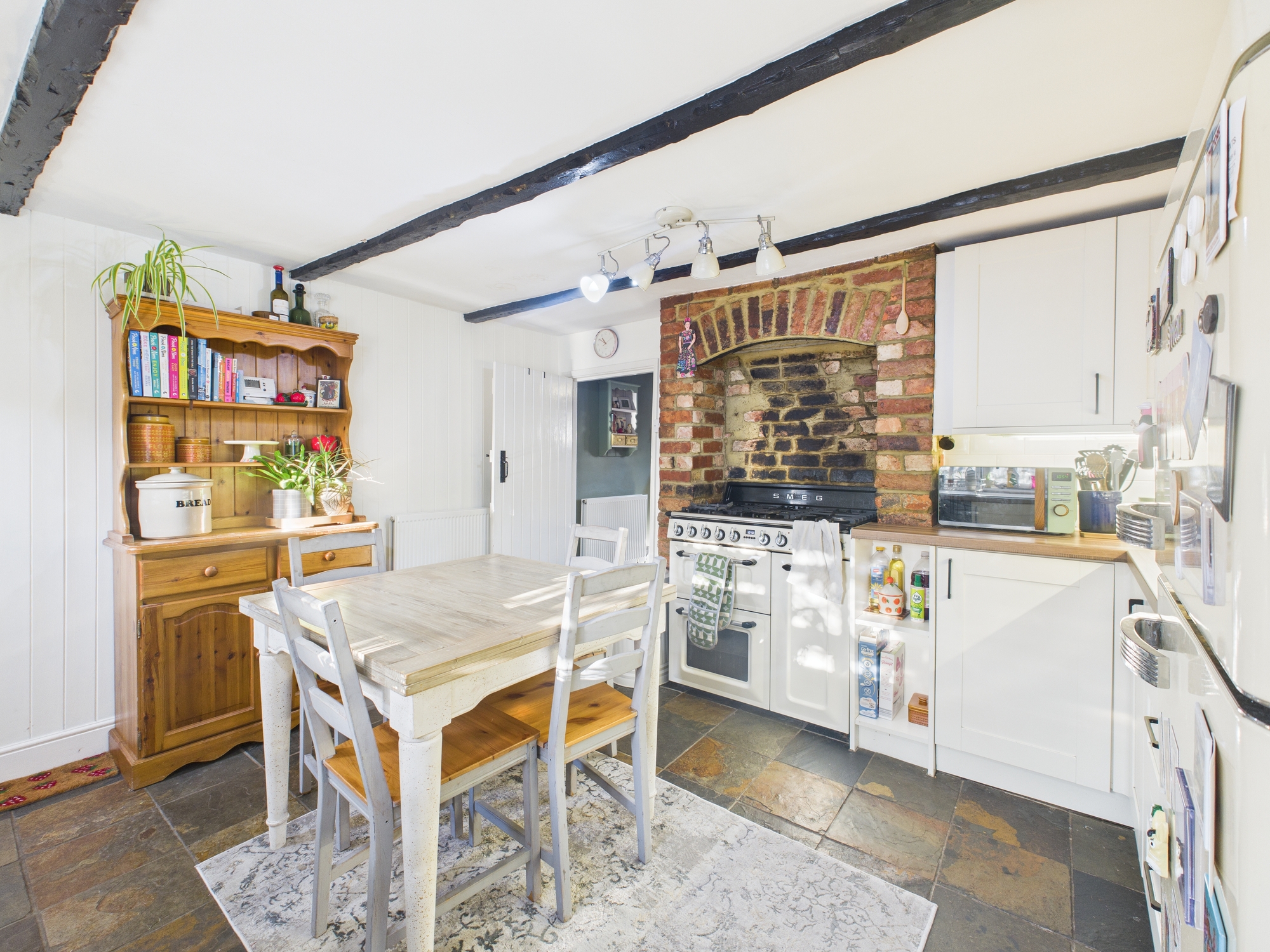 The front door opens in to the porch, an addition by the current owner. The sitting room has stairs to the first floor, exposed stone walling and a brick fireplace complete with log burner, leading through into the kitchen/dining room with a stable door into the rear garden. The kitchen is fitted with units, a sink, range cooker with brick surround, dishwasher and has space for a fridge/freezer. The utility cupboard provides space for a washing machine and houses the wall mounted gas-fired combination boiler.