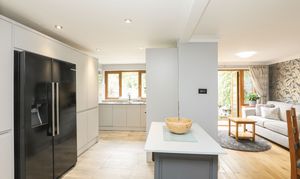 The home welcomes you with a light-filled entrance hall that sets the tone for the contemporary interiors beyond. At the heart of the property is an impressive open-plan kitchen, dining, and lounge area. The kitchen has been finished to the highest standard, featuring a sleek, contemporary design with a full range of integrated appliances and the added practicality of an adjoining utility room. The dining space sits seamlessly alongside, creating the perfect spot for busy weekday mornings or relaxed family meals, while the lounge area is enhanced by French doors that open directly onto the garden and offer delightful views across the feature pond.