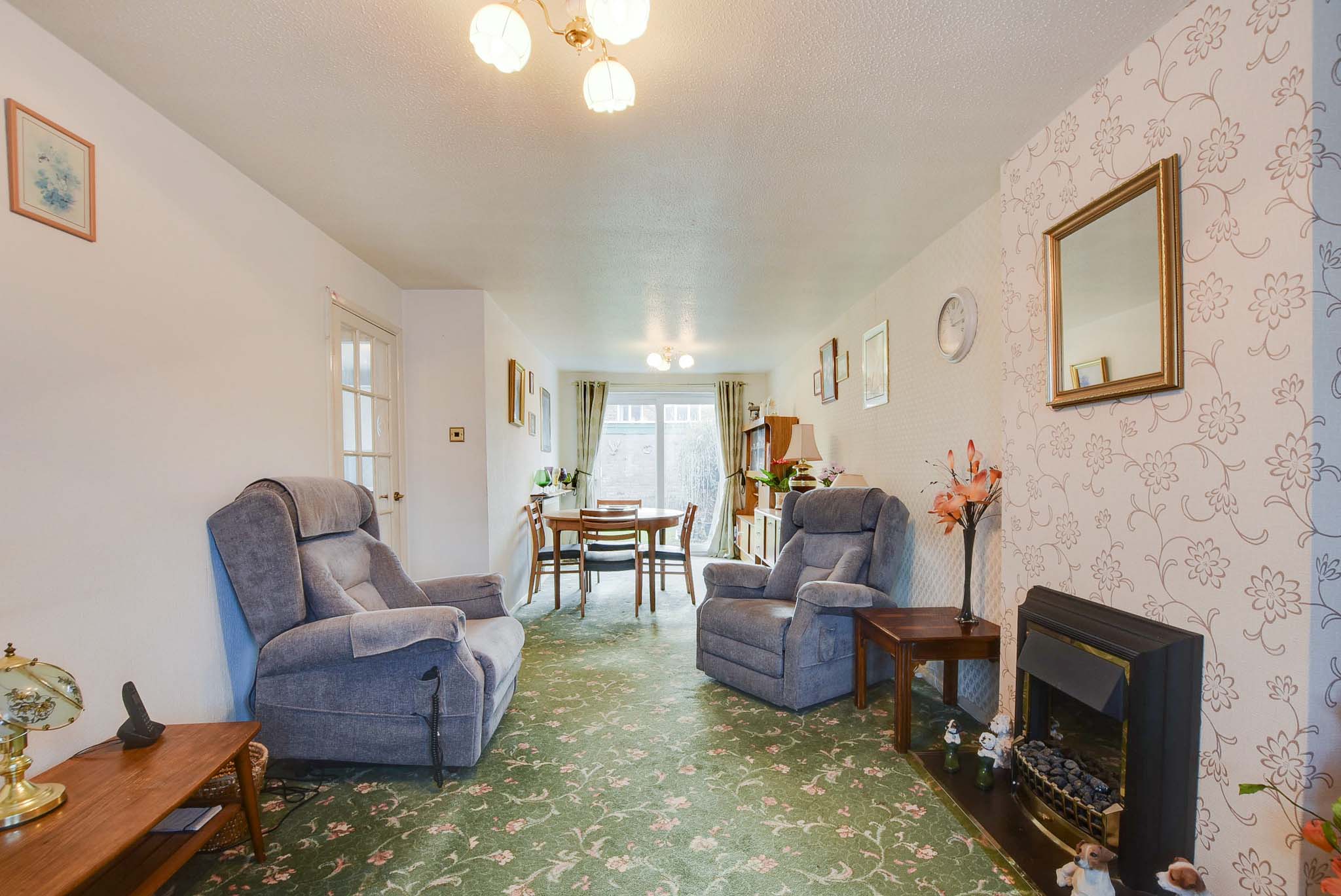 With double glazed window to the front elevation, double glazed patio doors to the rear elevation, carpet flooring, electric fire and two radiators.