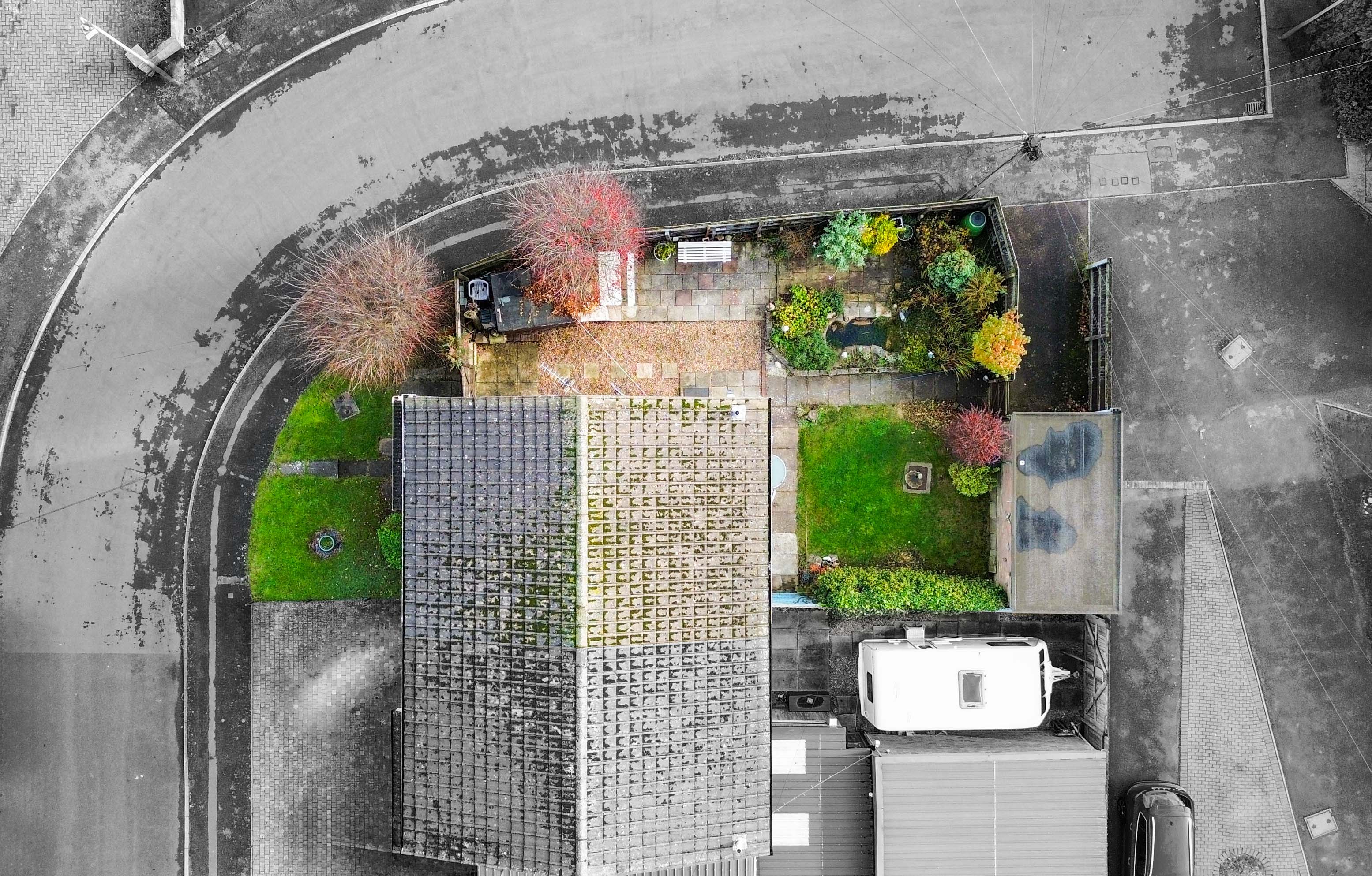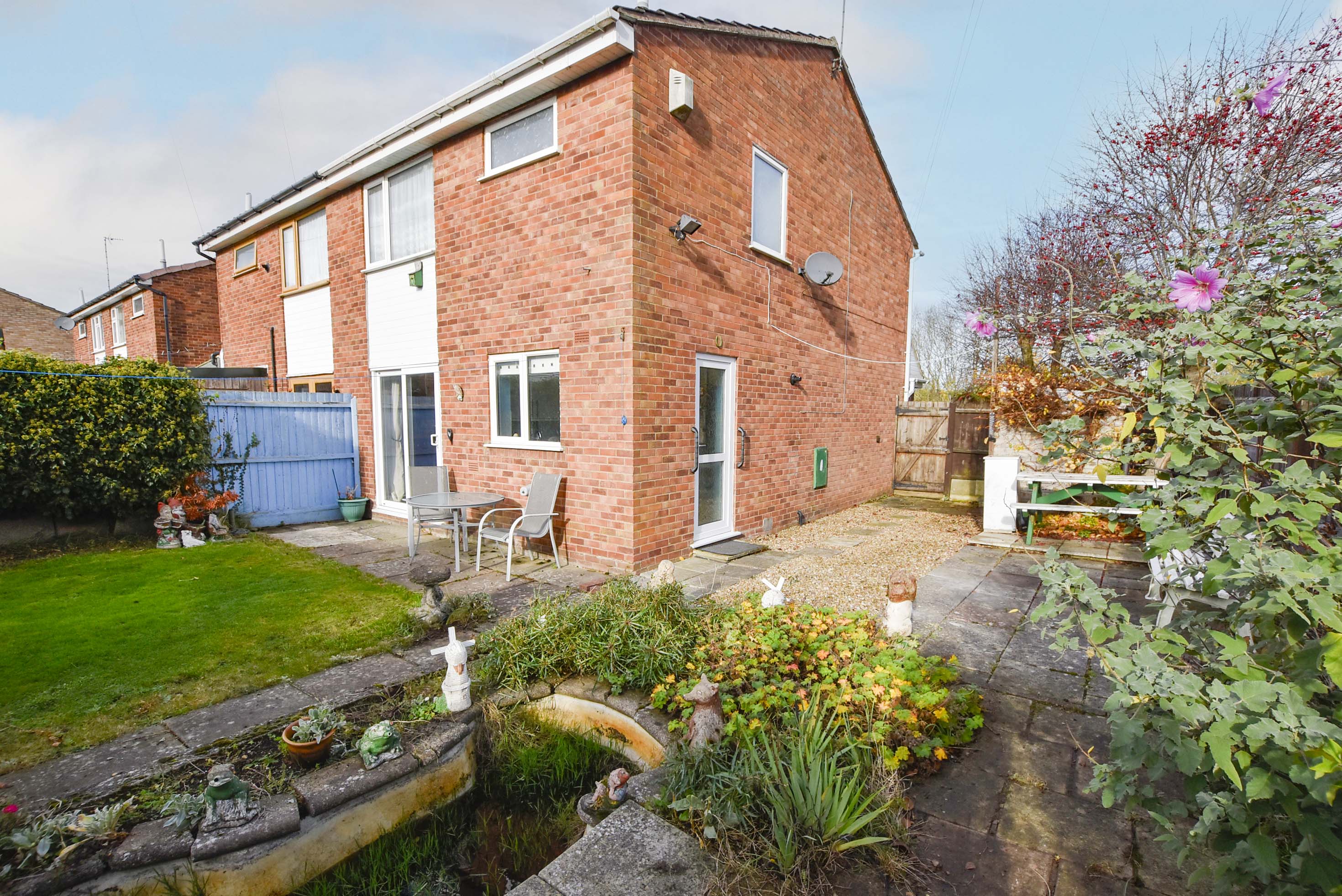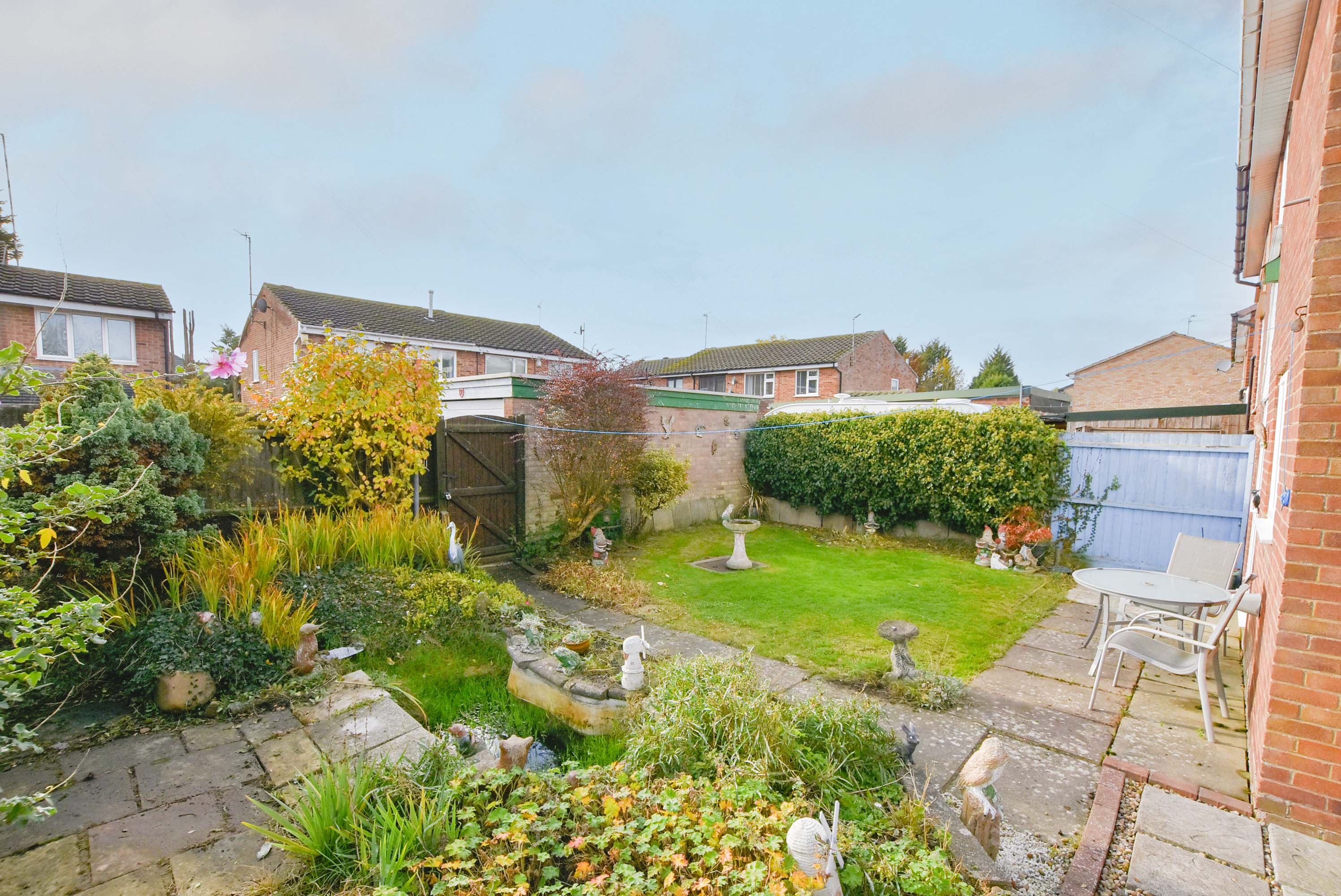 With side gated access leading to the front of the property and rear gated access to driveway and garage. This rear garden has a patio area to the rear and side, pebbled area, lawned area, mature flowerbeds, pond, and a wooden shed.