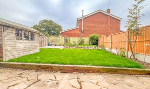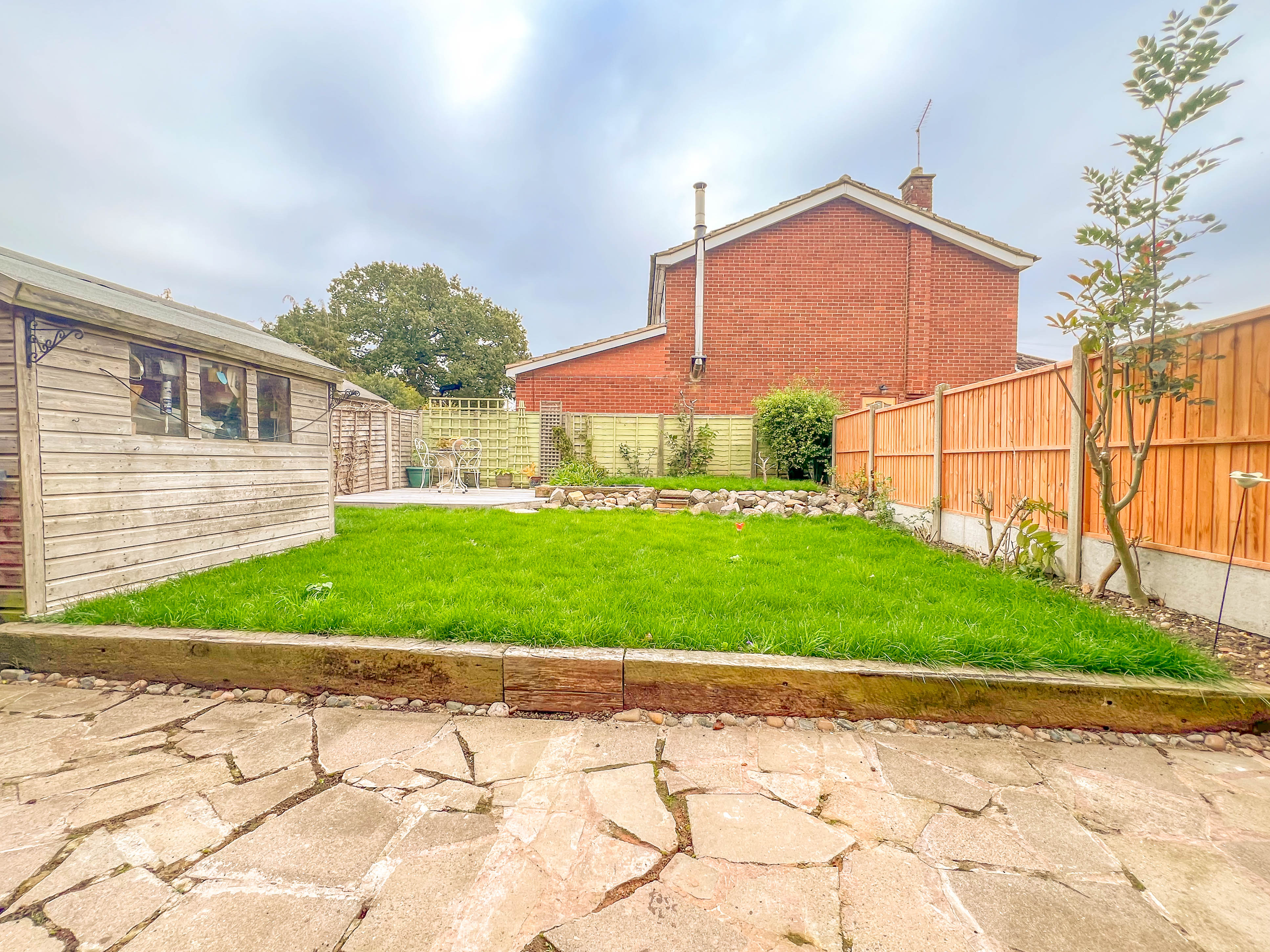 The rear garden is a serene retreat, with a paved patio flowing to a beautifully maintained lawn, complemented by a further patio area perfect for relaxing or entertaining while enjoying the evening sun.