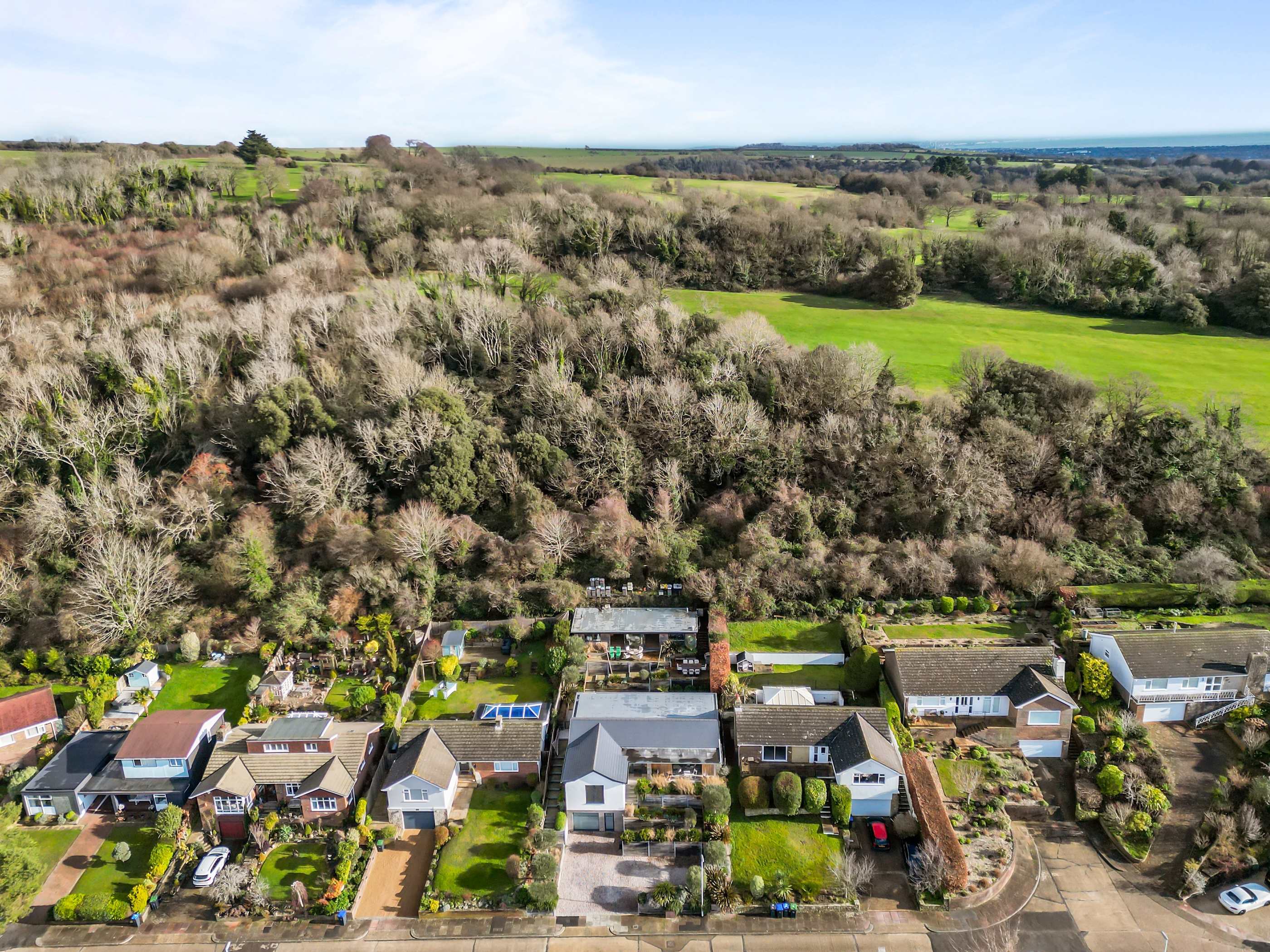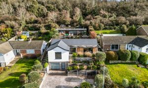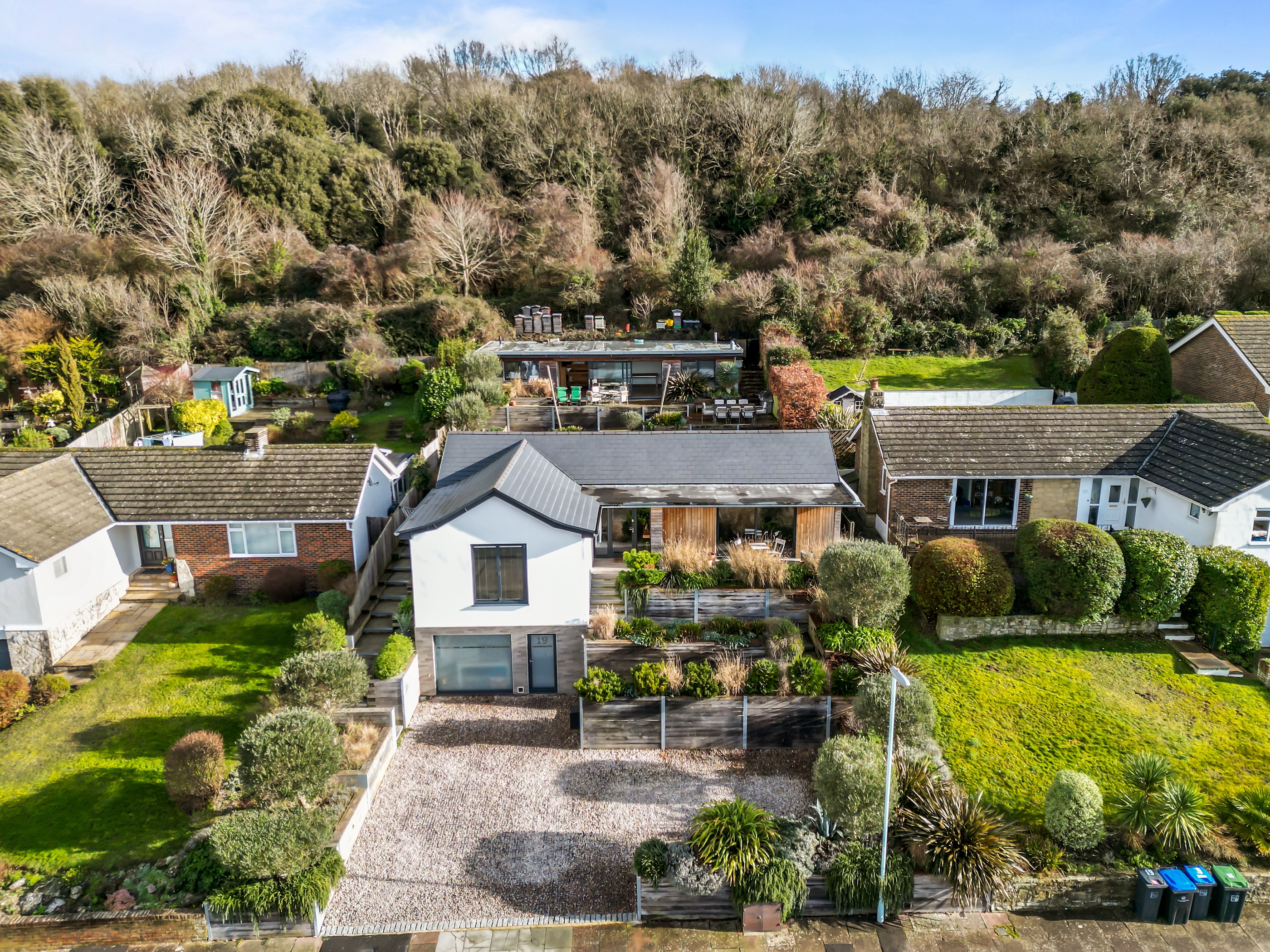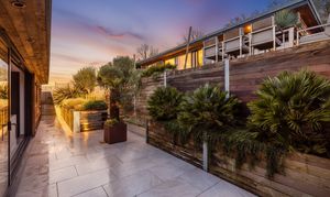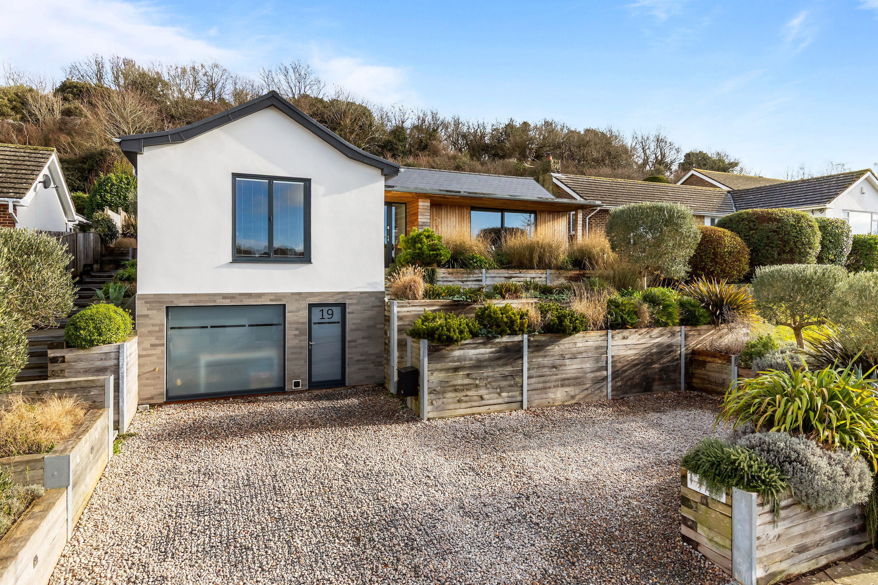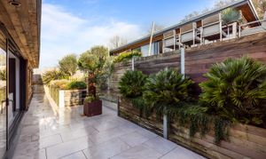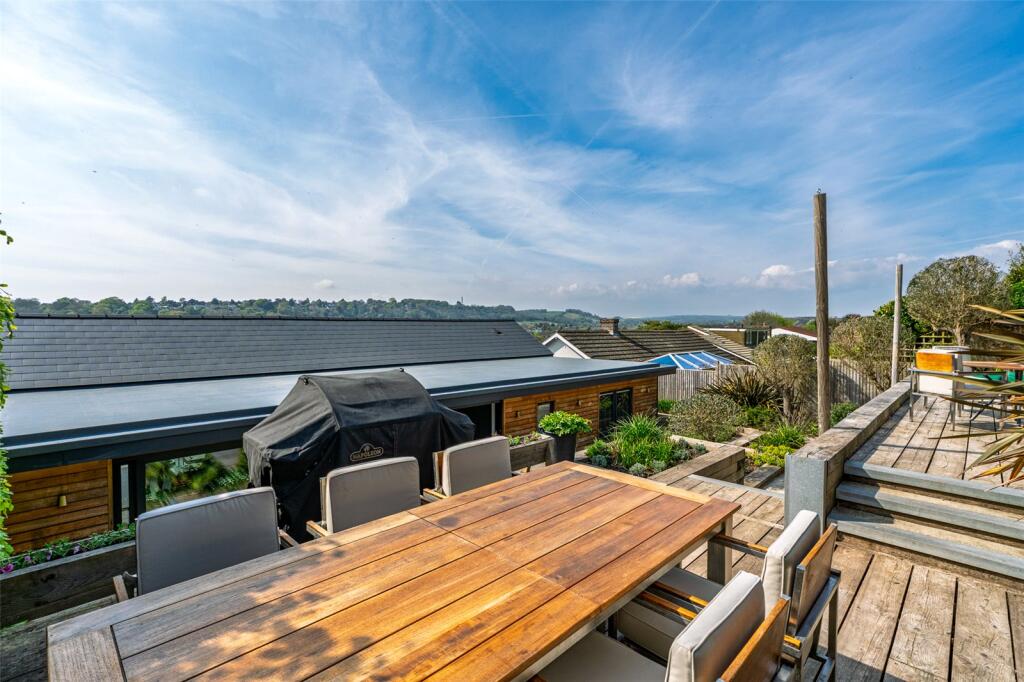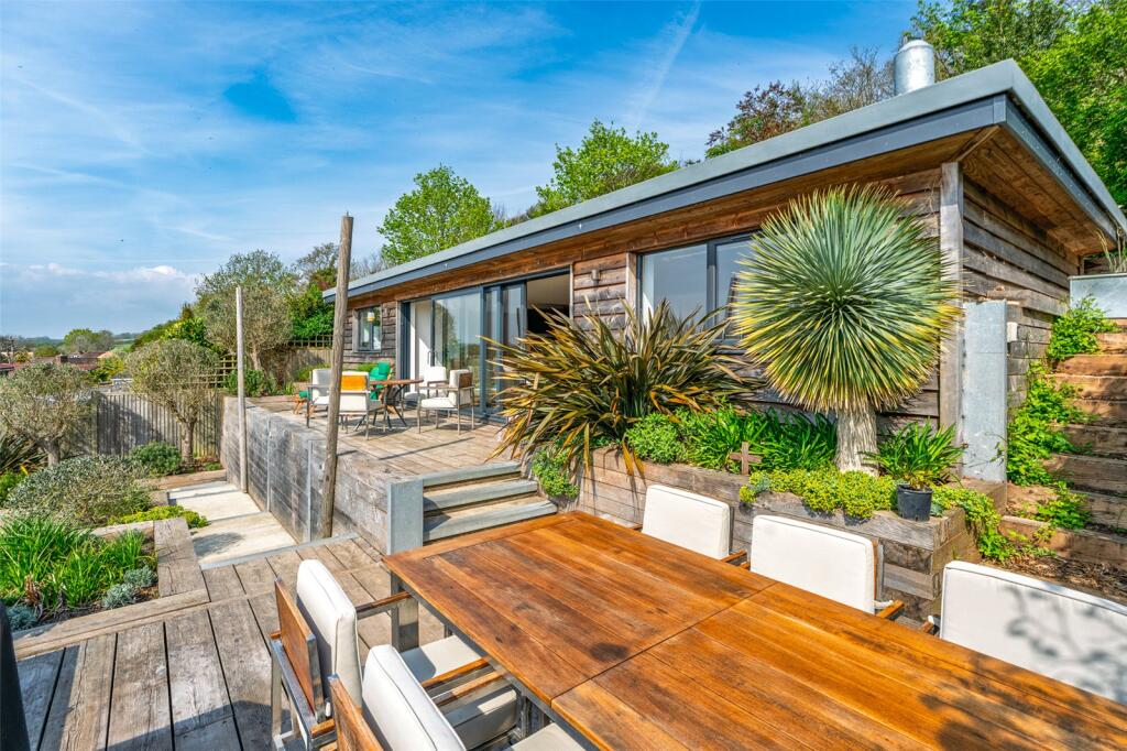 The front garden offers an attractive terrace with a west-facing veranda and a private driveway which provides ample off-road parking. The rear garden is thoughtfully landscaped, featuring a terrace that is directly accessible from the living space and an additional elevated seating area with open Downland views.