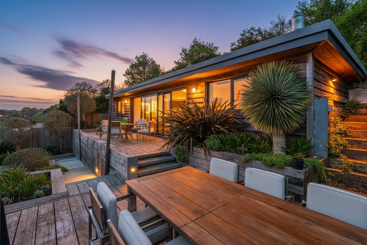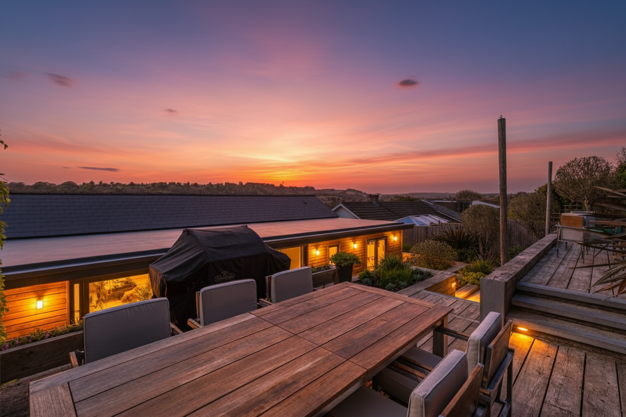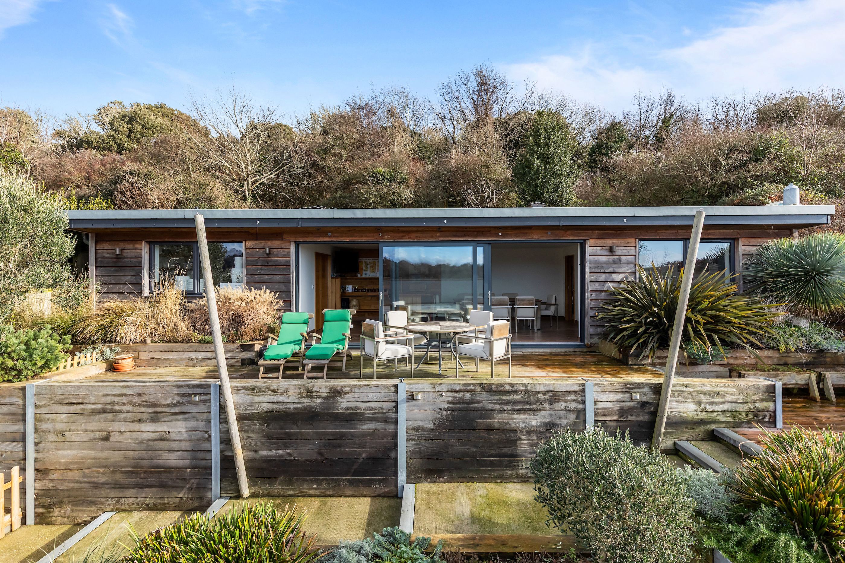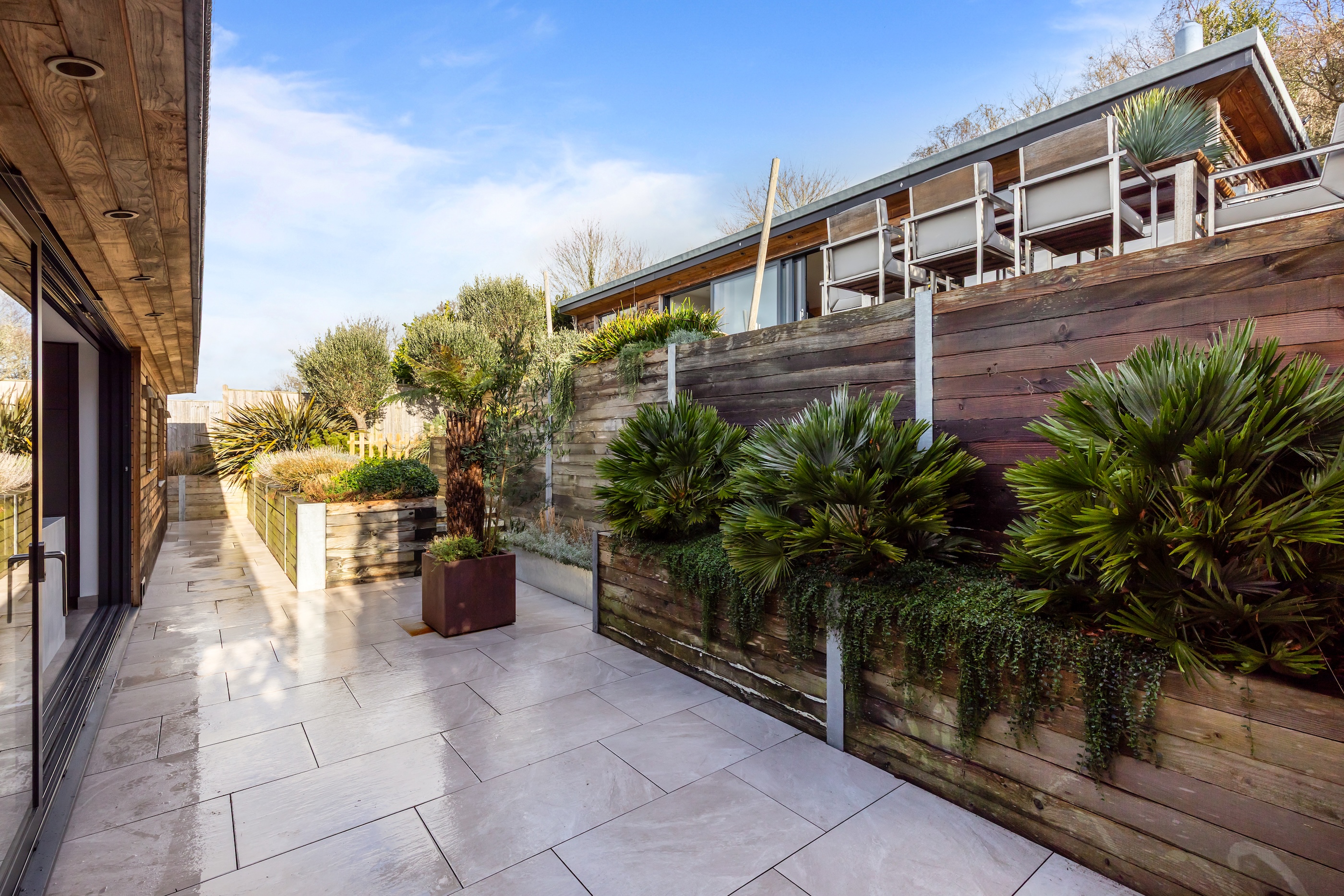 The front garden offers an attractive terrace with a west-facing veranda and a private driveway which provides ample off-road parking. The rear garden is thoughtfully landscaped, featuring a terrace that is directly accessible from the living space and an additional elevated seating area with open Downland views.