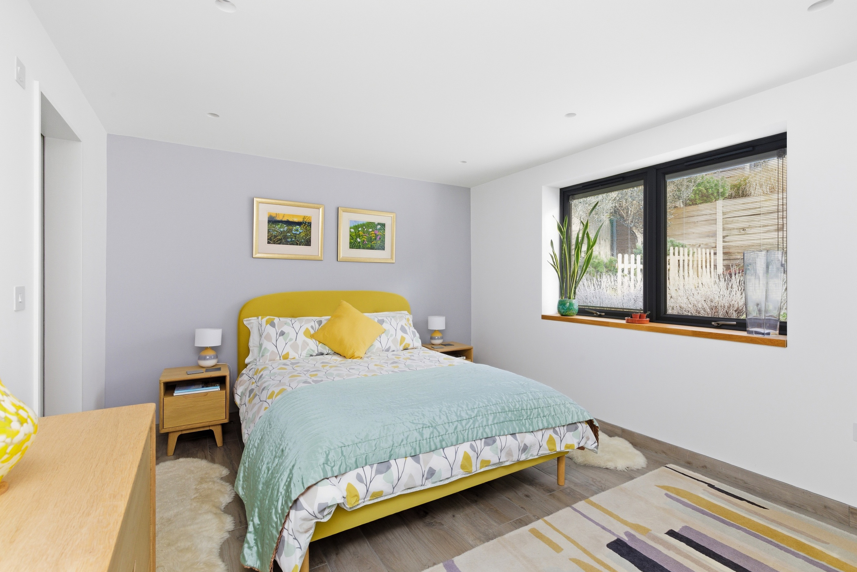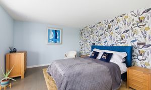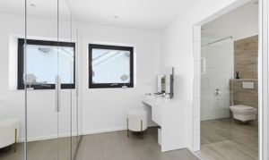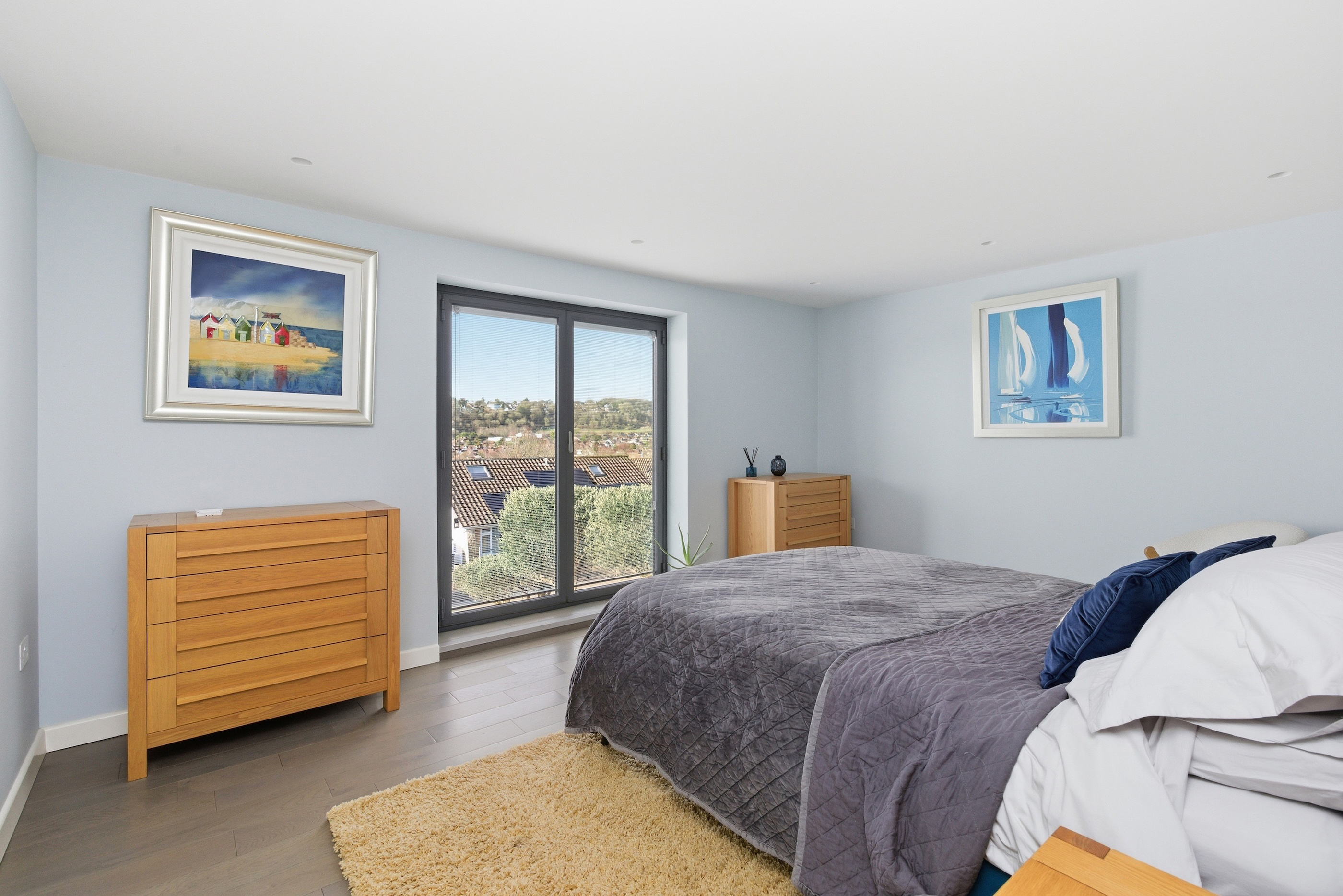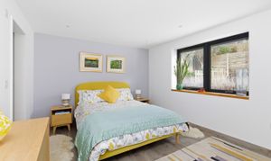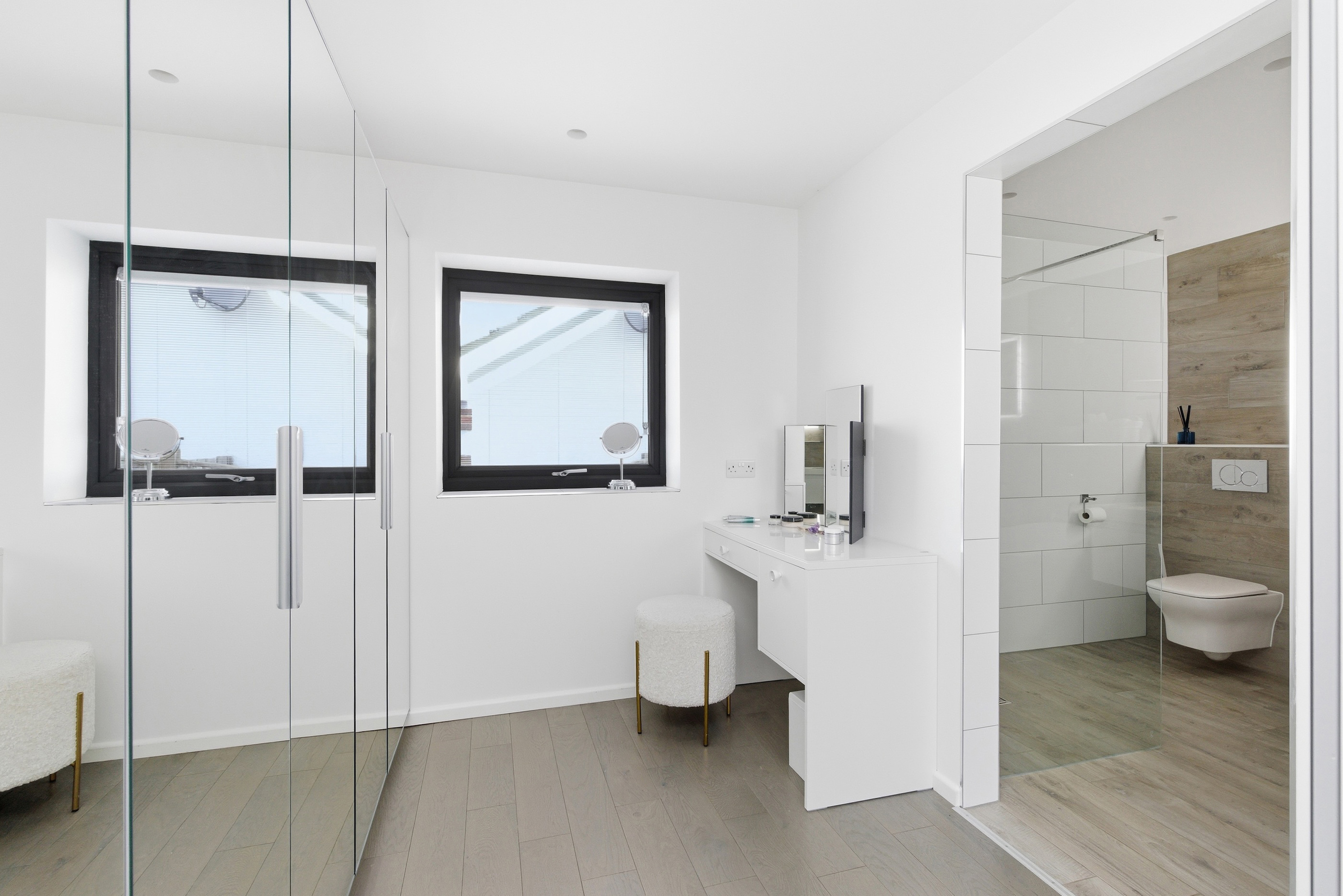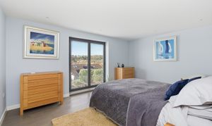 Both bedrooms are generous double rooms, each with bespoke en-suite facilities. The principal suite is particularly impressive, with west-facing glazed doors enjoying a panoramic outlook, a dressing room with fitted wardrobes, and a luxurious en-suite with freestanding bath and wet-room style shower. The second bedroom also benefits from a modern en-suite shower room.