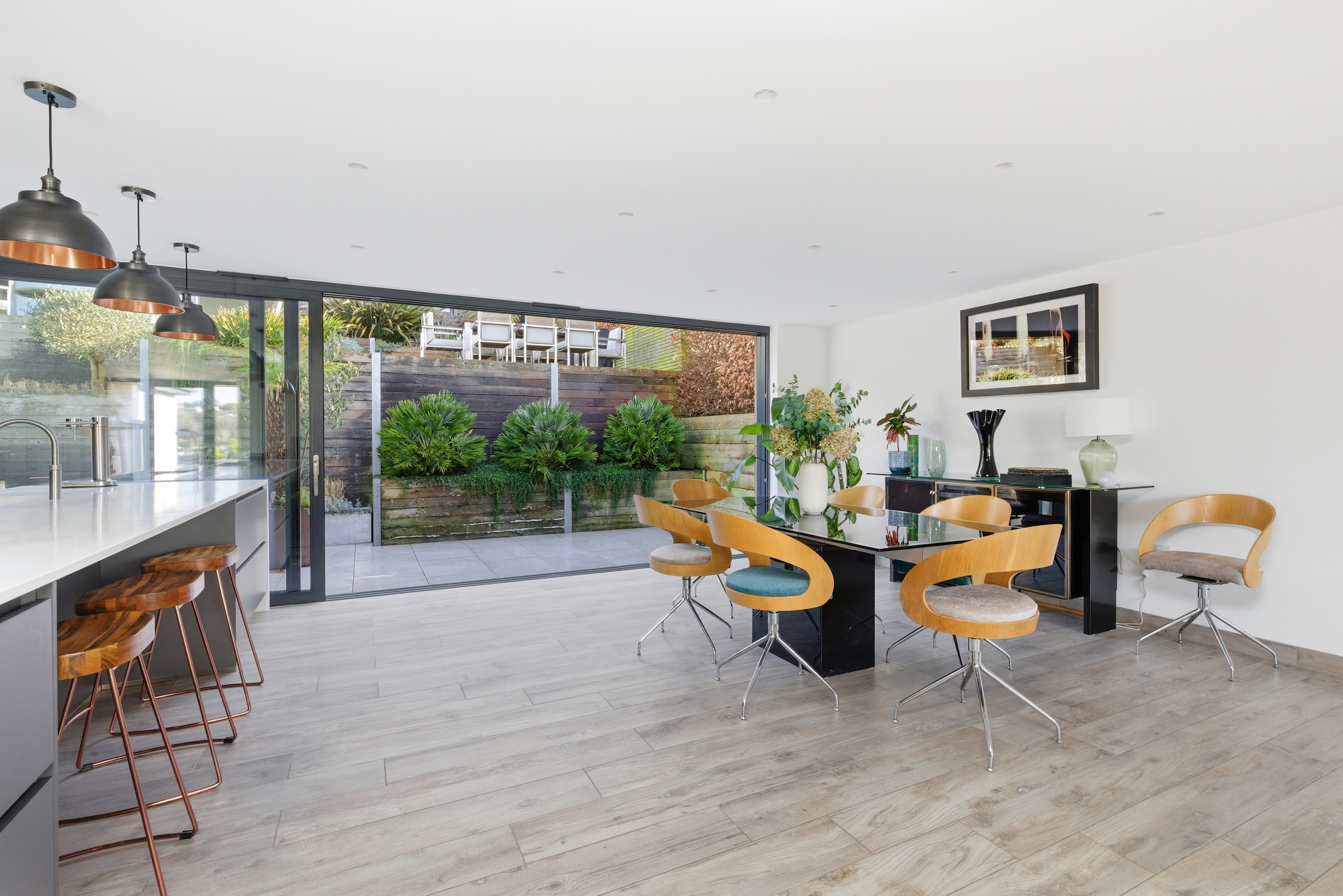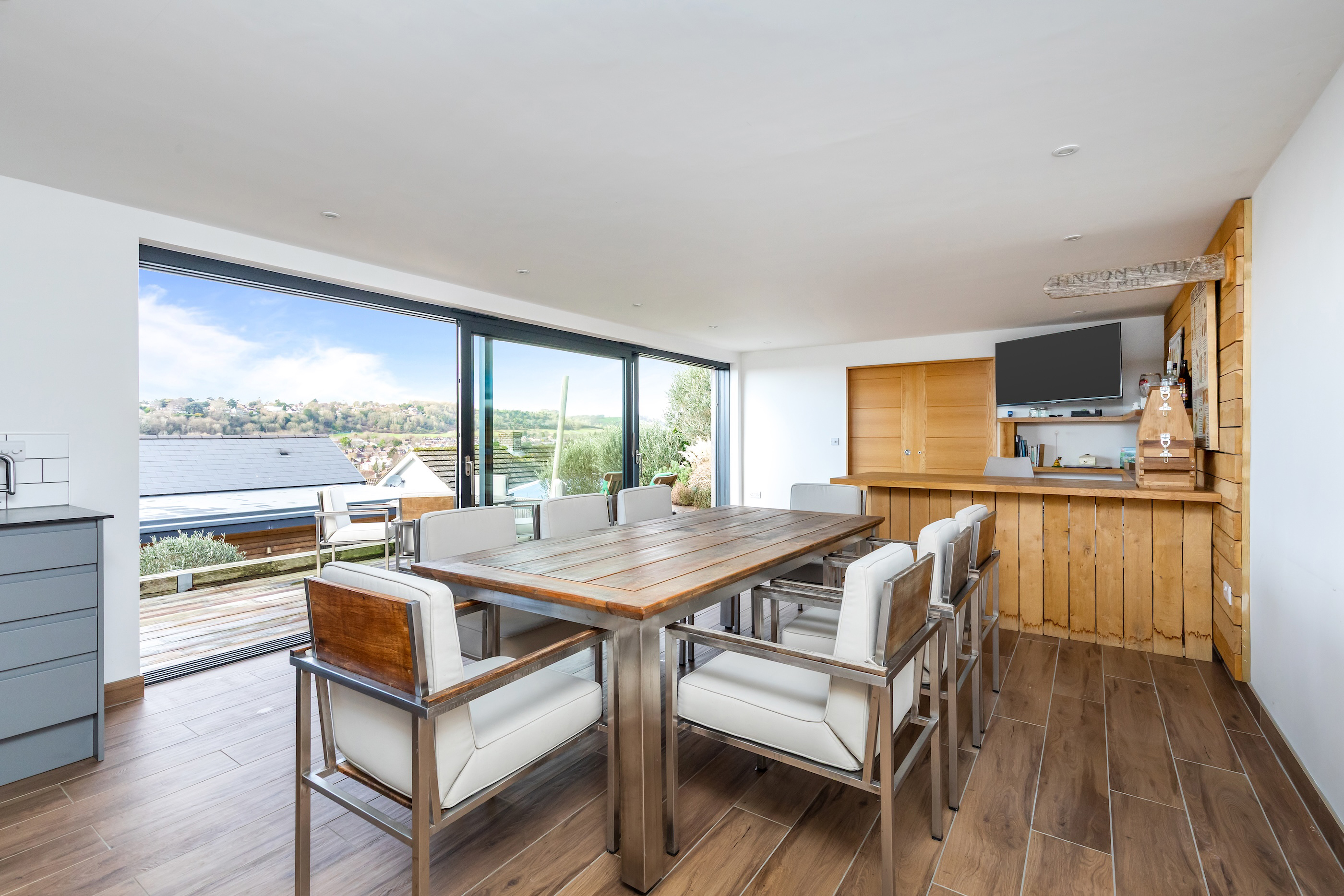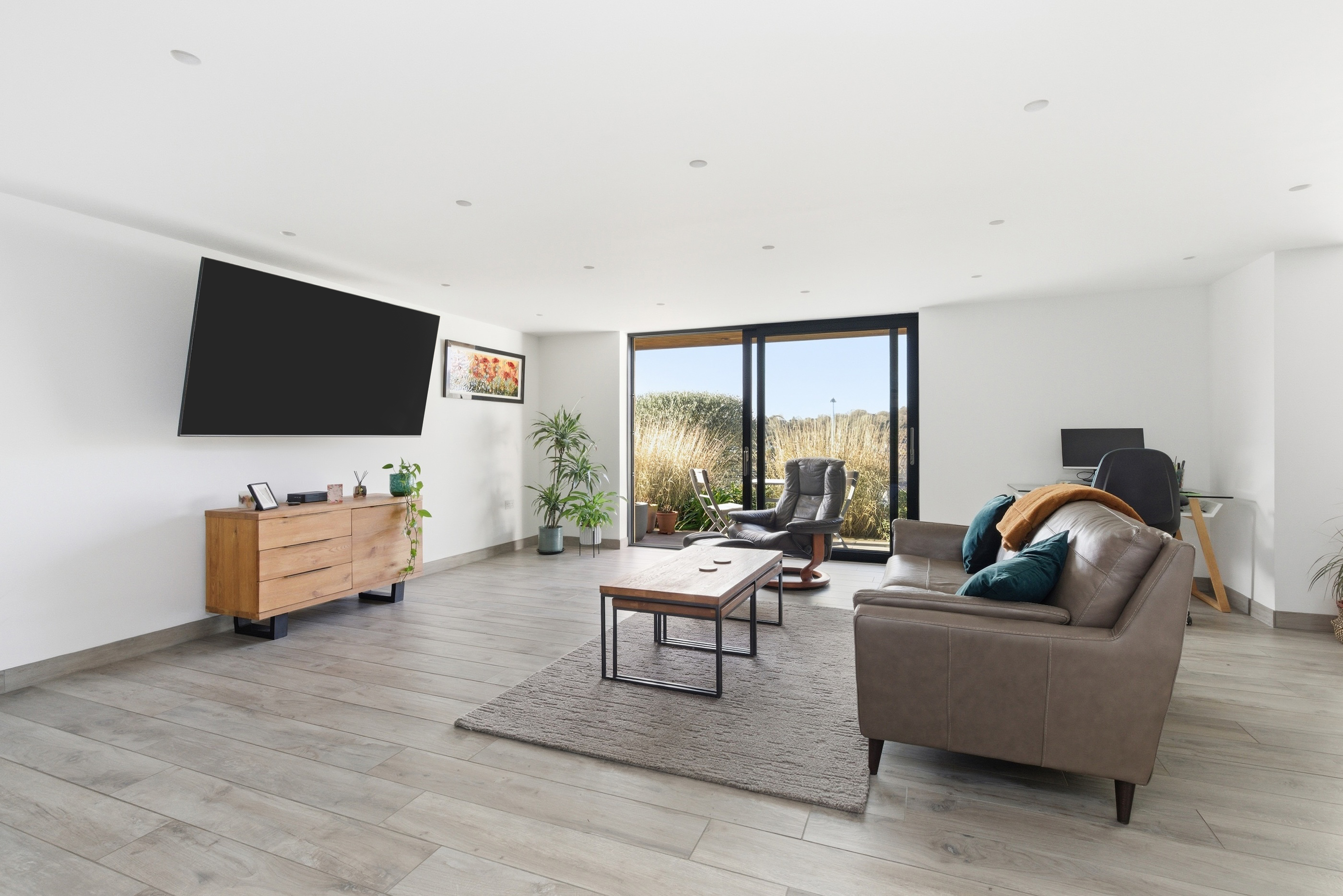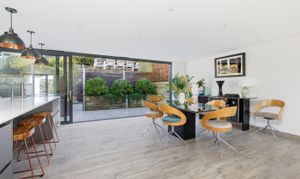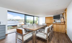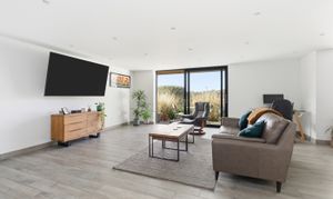 The striking open-plan kitchen, dining, and living space has been finished with porcelain tiled flooring, with underfloor heating throughout. Dual-aspect glazing floods the room with natural light and frames the far-reaching views. The contemporary kitchen features integrated appliances, quartz work surfaces, and a large central island. There are full-width sliding doors that open onto a terrace and the garden beyond.