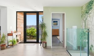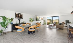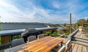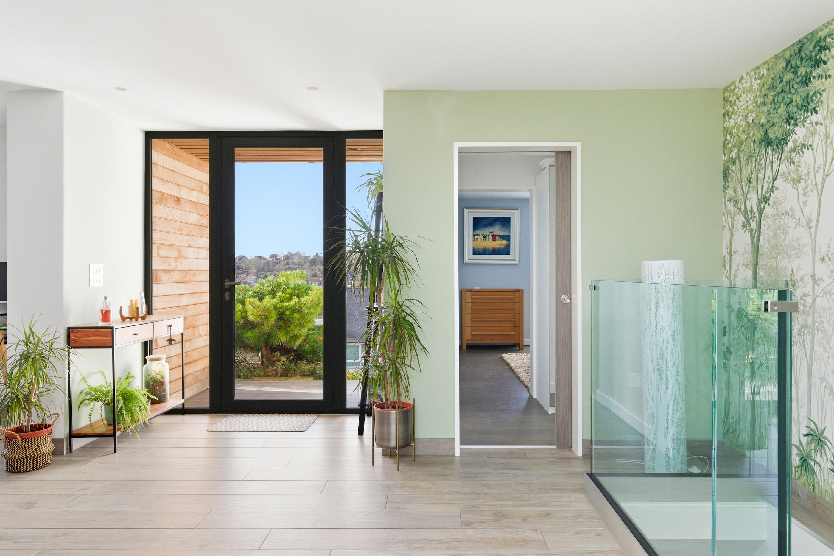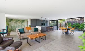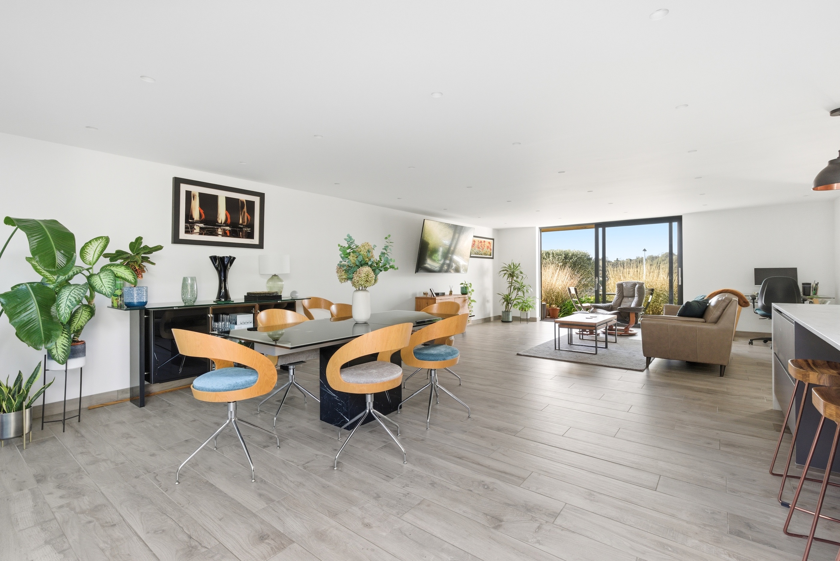 The striking open-plan kitchen, dining, and living space has been finished with porcelain tiled flooring, with underfloor heating throughout. Dual-aspect glazing floods the room with natural light and frames the far-reaching views. The contemporary kitchen features integrated appliances, quartz work surfaces, and a large central island. There are full-width sliding doors that open onto a terrace and the garden beyond.