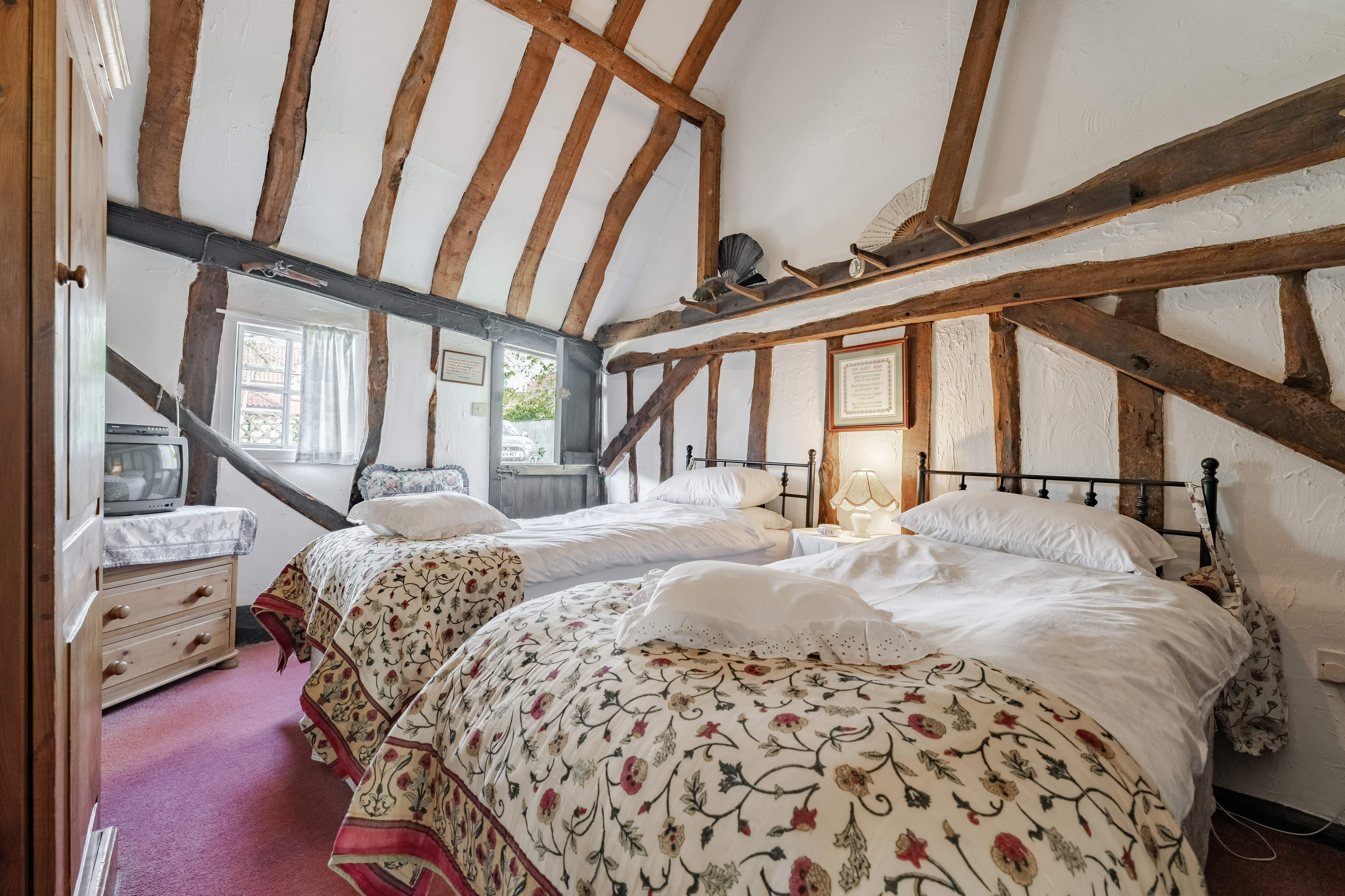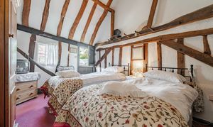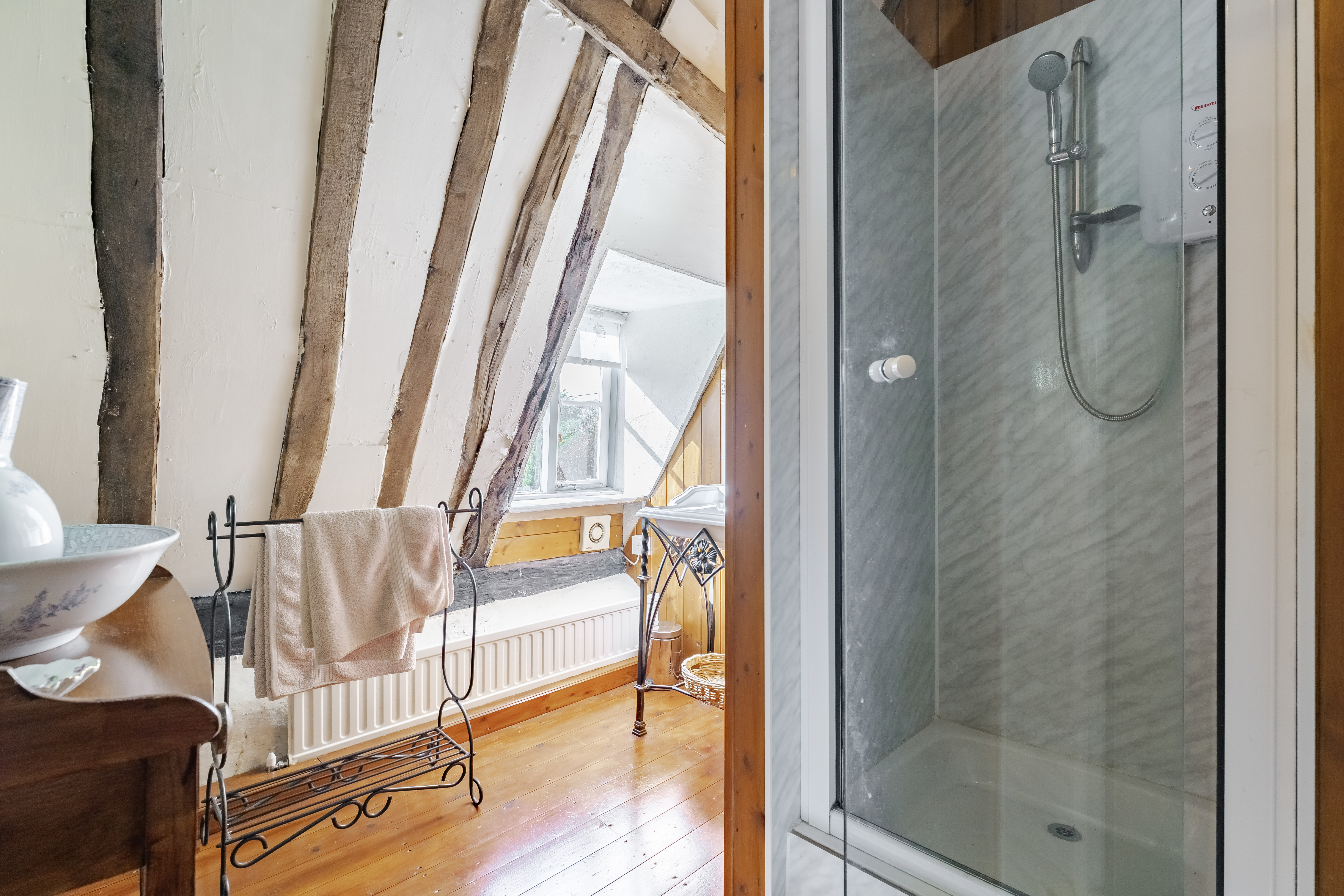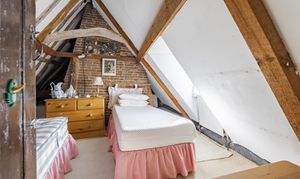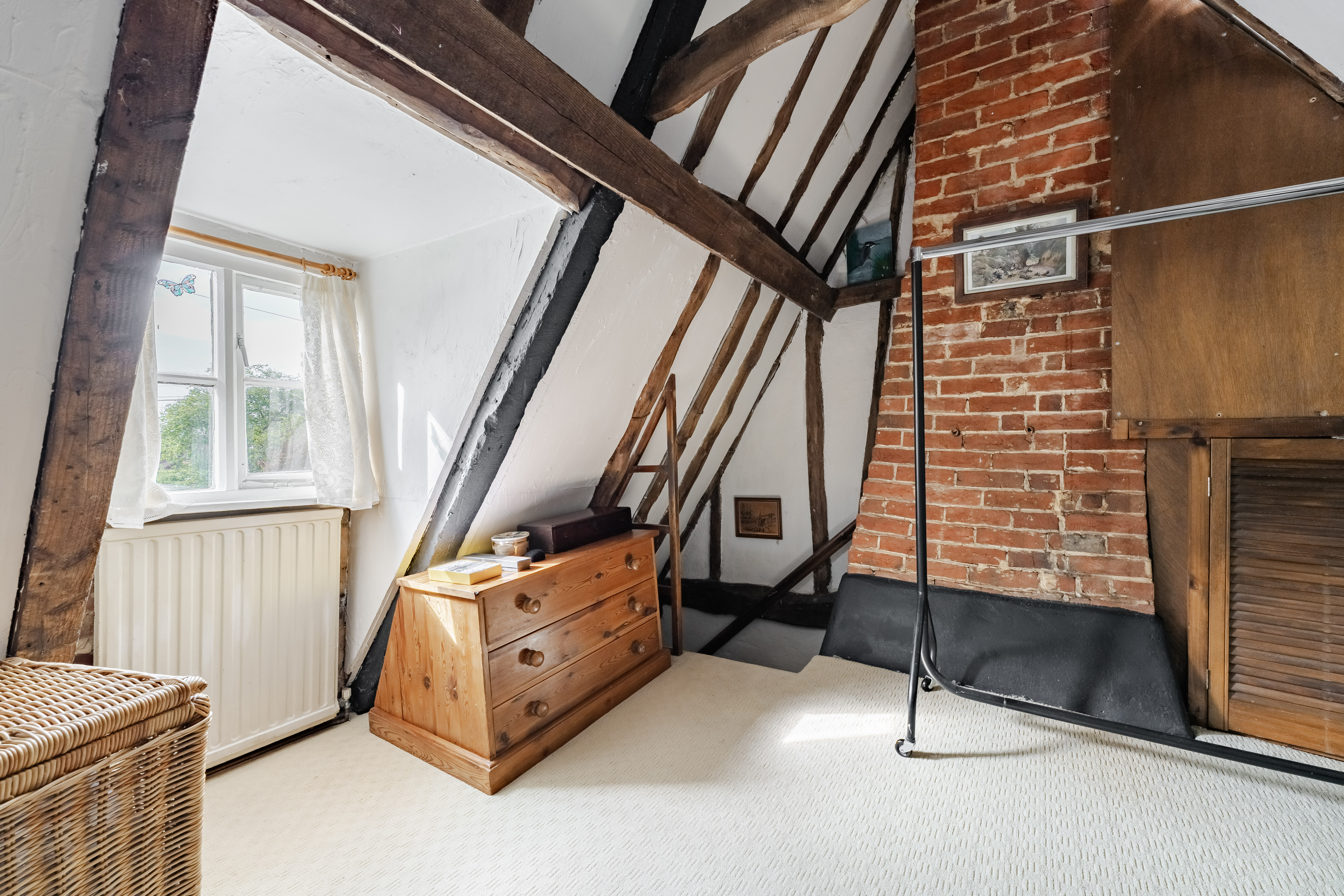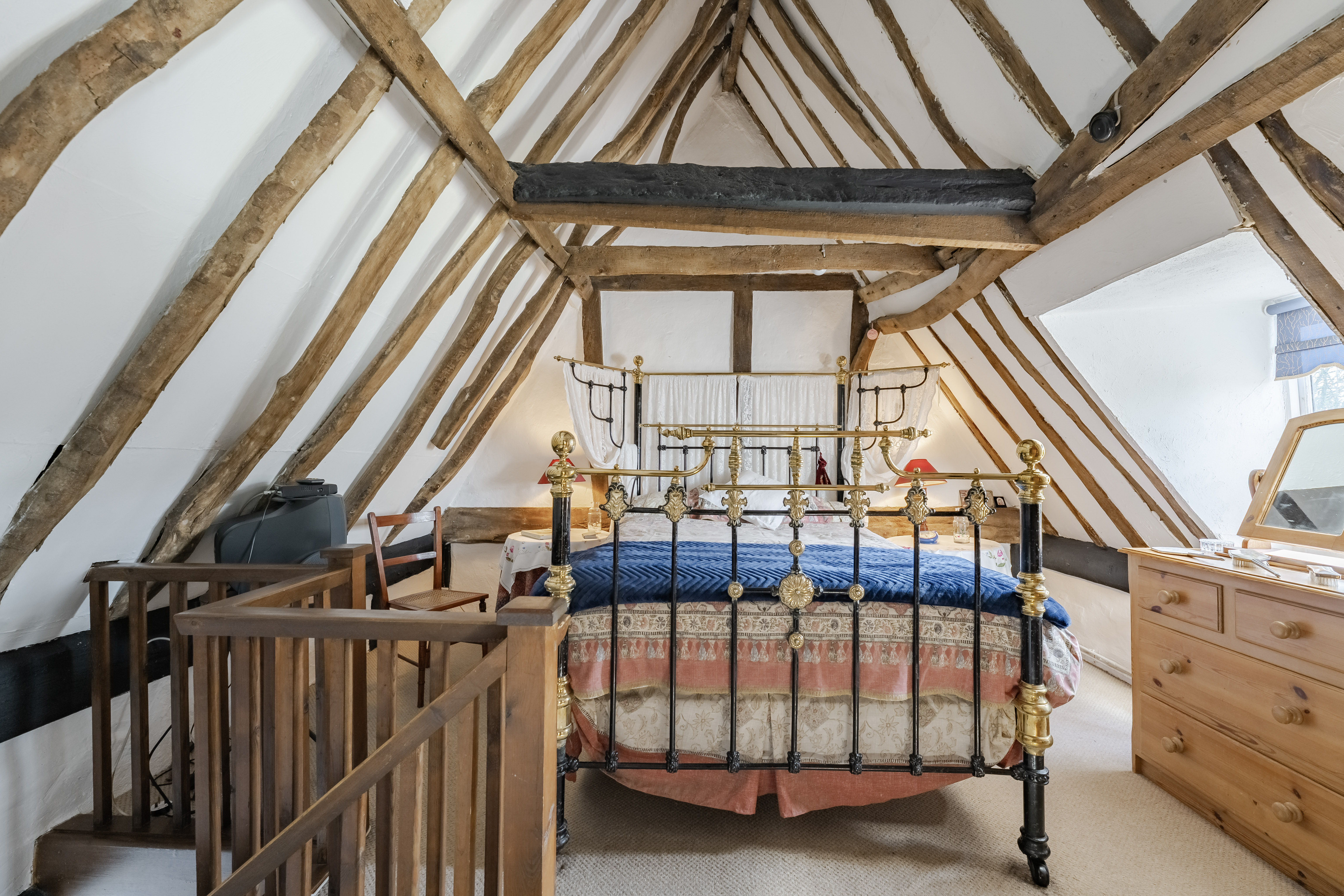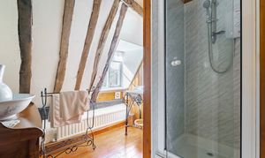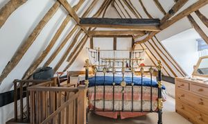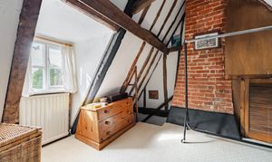 Upstairs, the home is served by two separate staircases, enhancing privacy and usability. The principal bedroom occupies one side, featuring exposed beams and its own en-suite. On the opposite side, a further double bedroom is complemented by an adjoining dressing room, creating a comfortable and private suite-like arrangement.