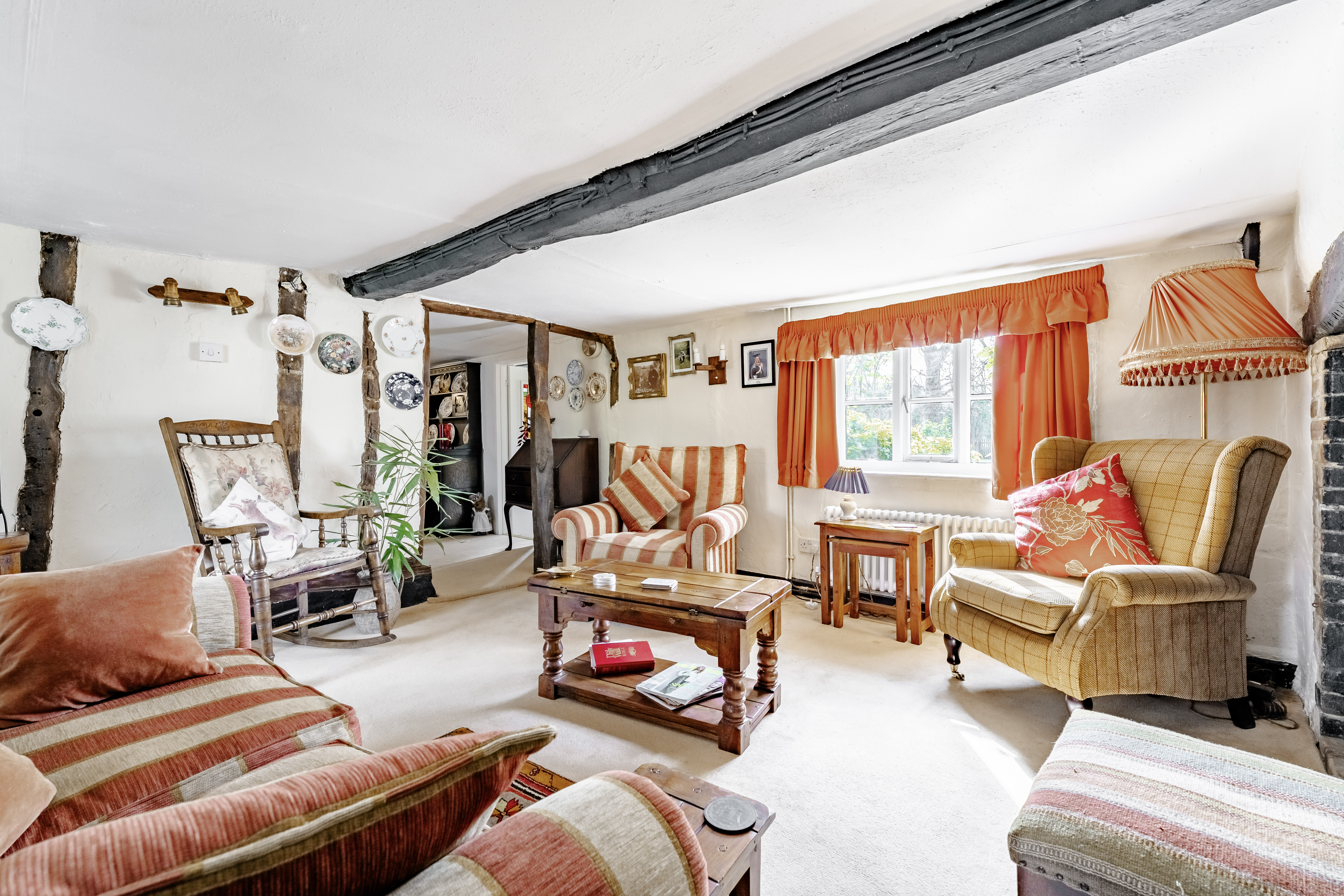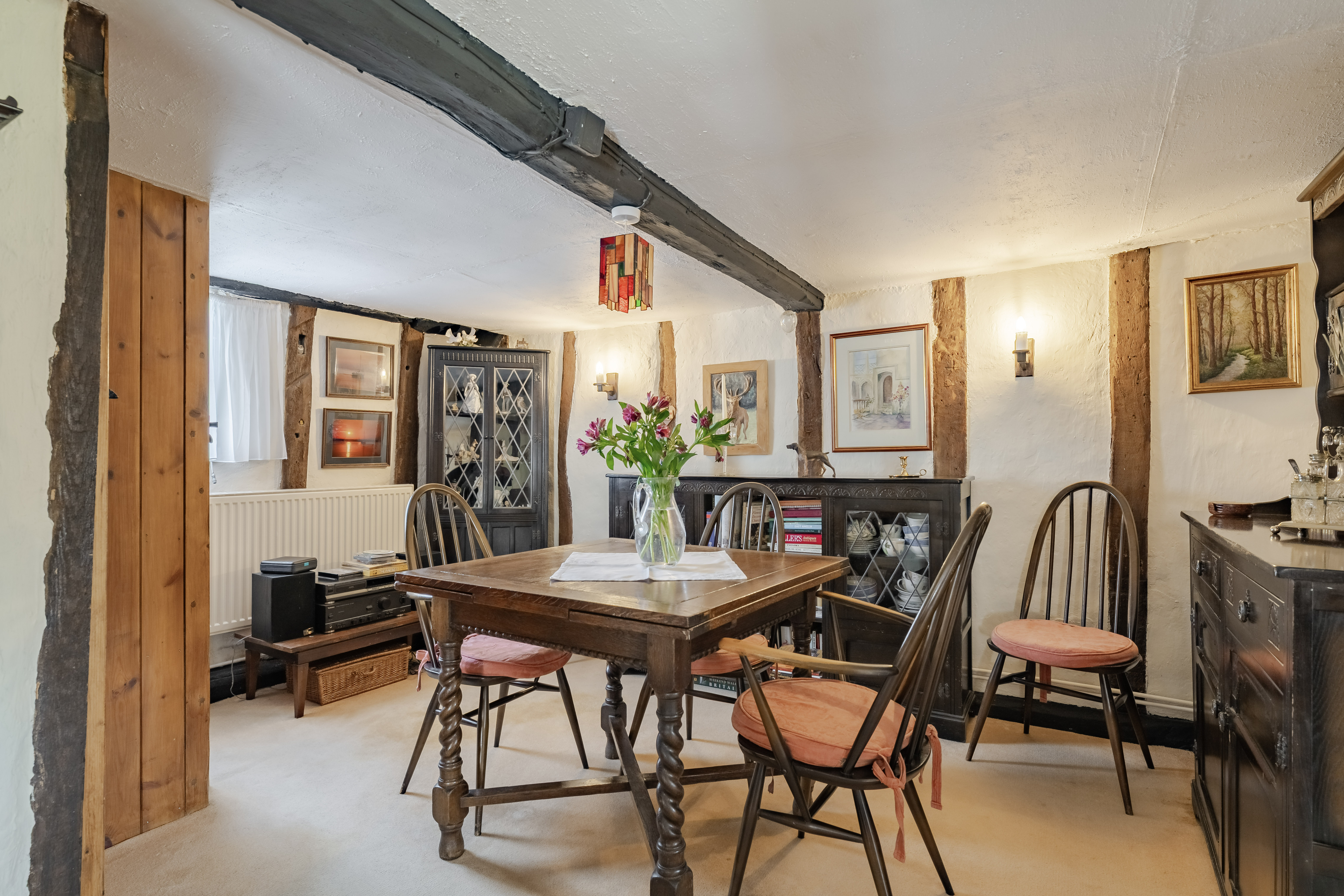 Upon entering, a welcoming hallway leads into the main living spaces. To one side sits a formal dining room, while opposite, a cosy sitting room provides a relaxing retreat, complete with exposed beams and a striking inglenook fireplace that creates a warm focal point.