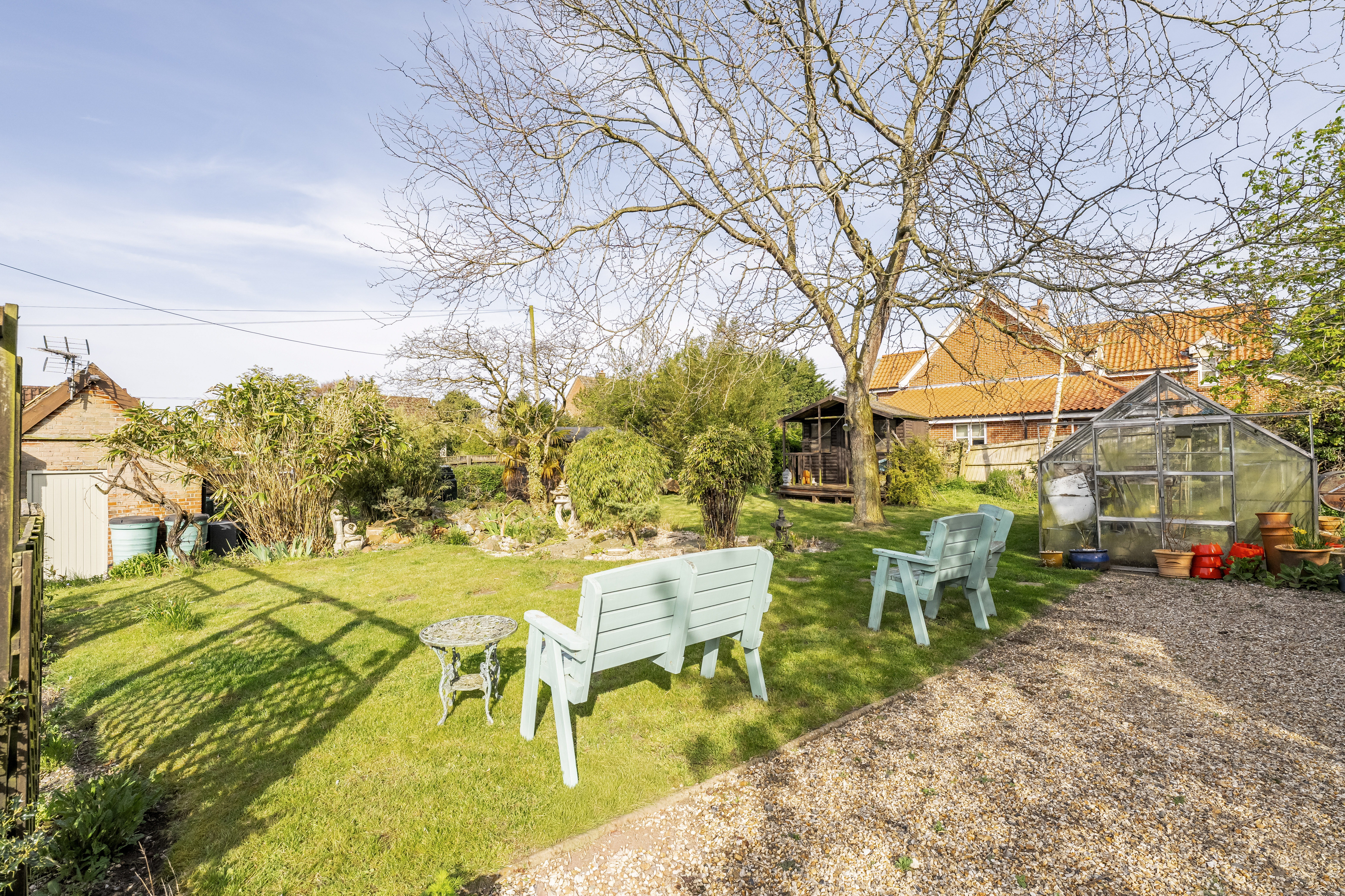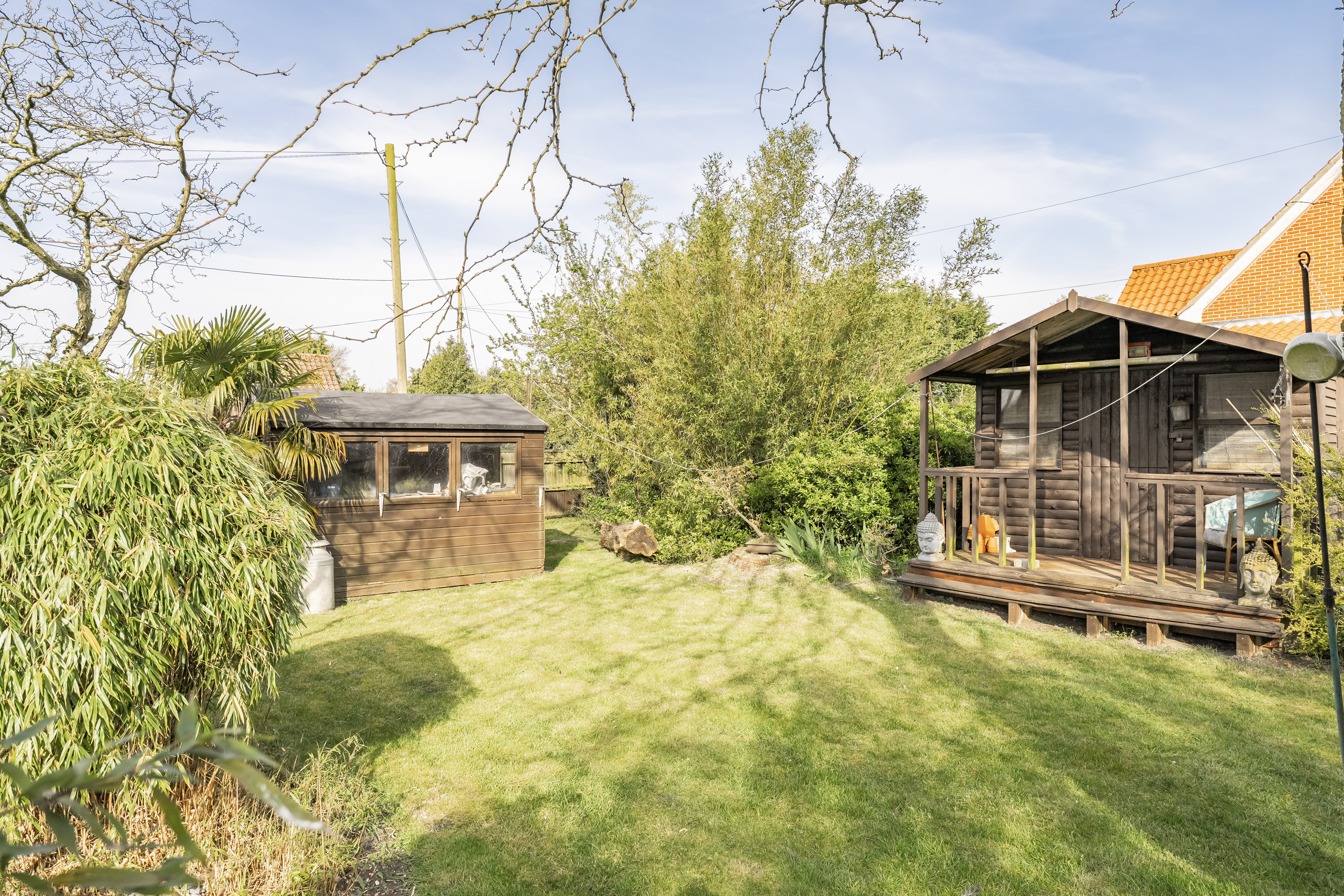 The rear garden continues the theme of privacy and tranquillity, with a summer house and additional practical features such as a log store completing the outdoor space.